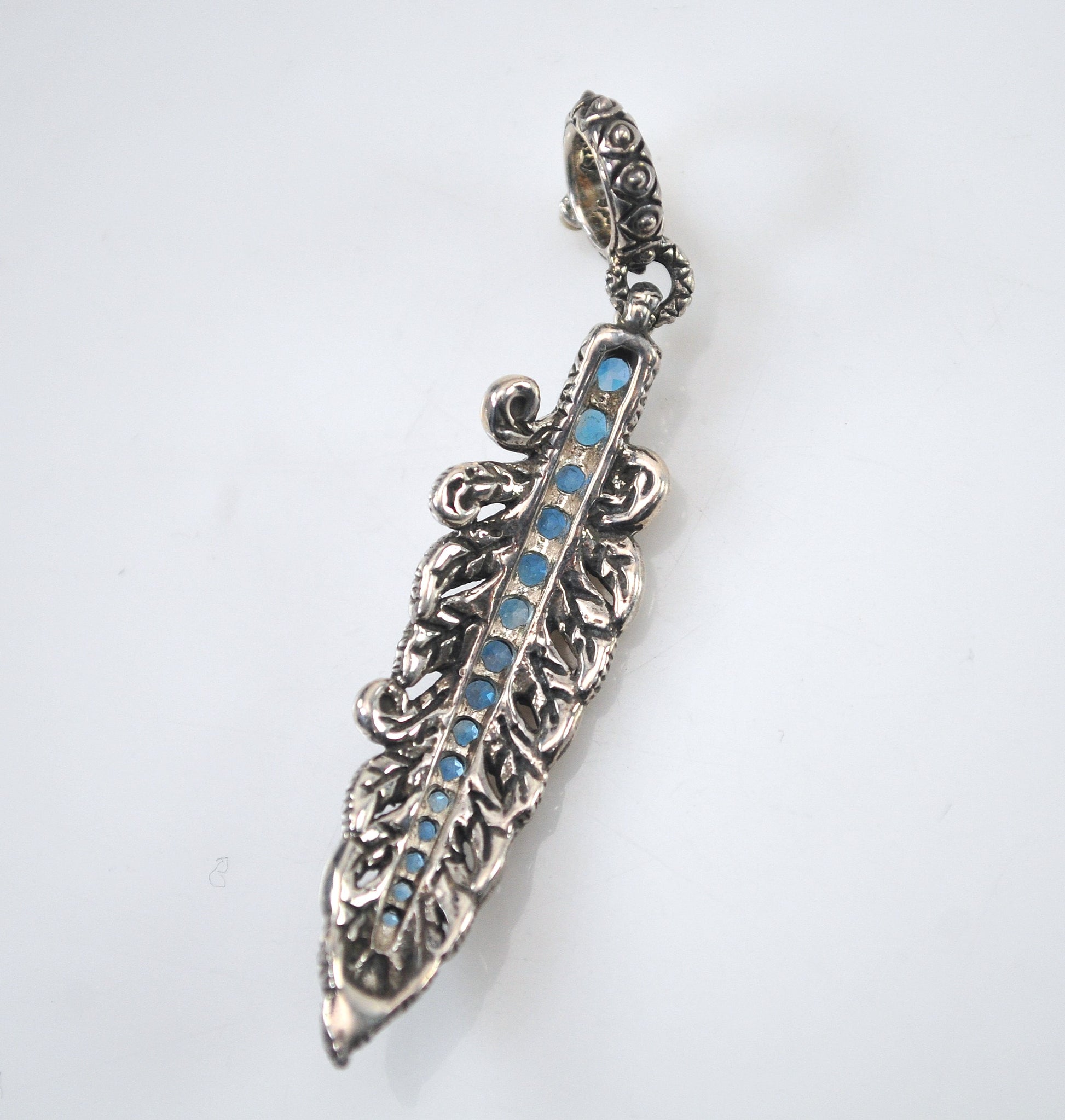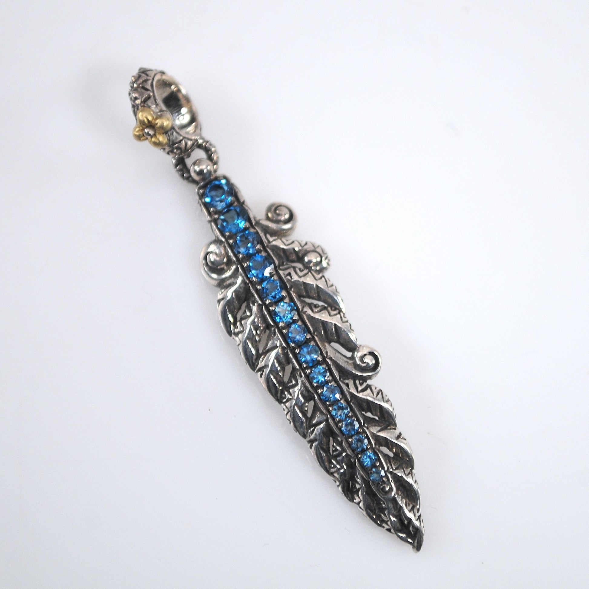 Ornate designer mixed metal feather charm is hallmarked and features round graduated Blue Topaz.