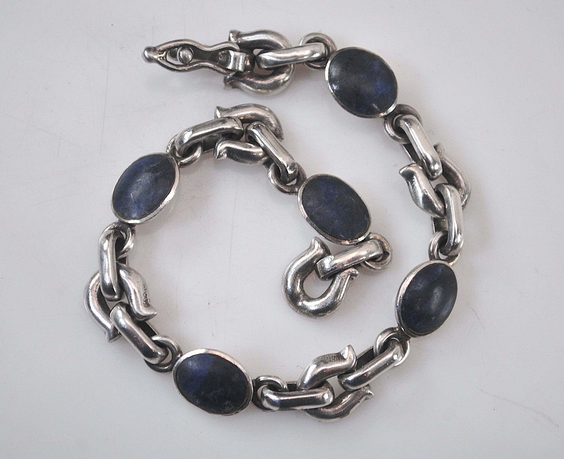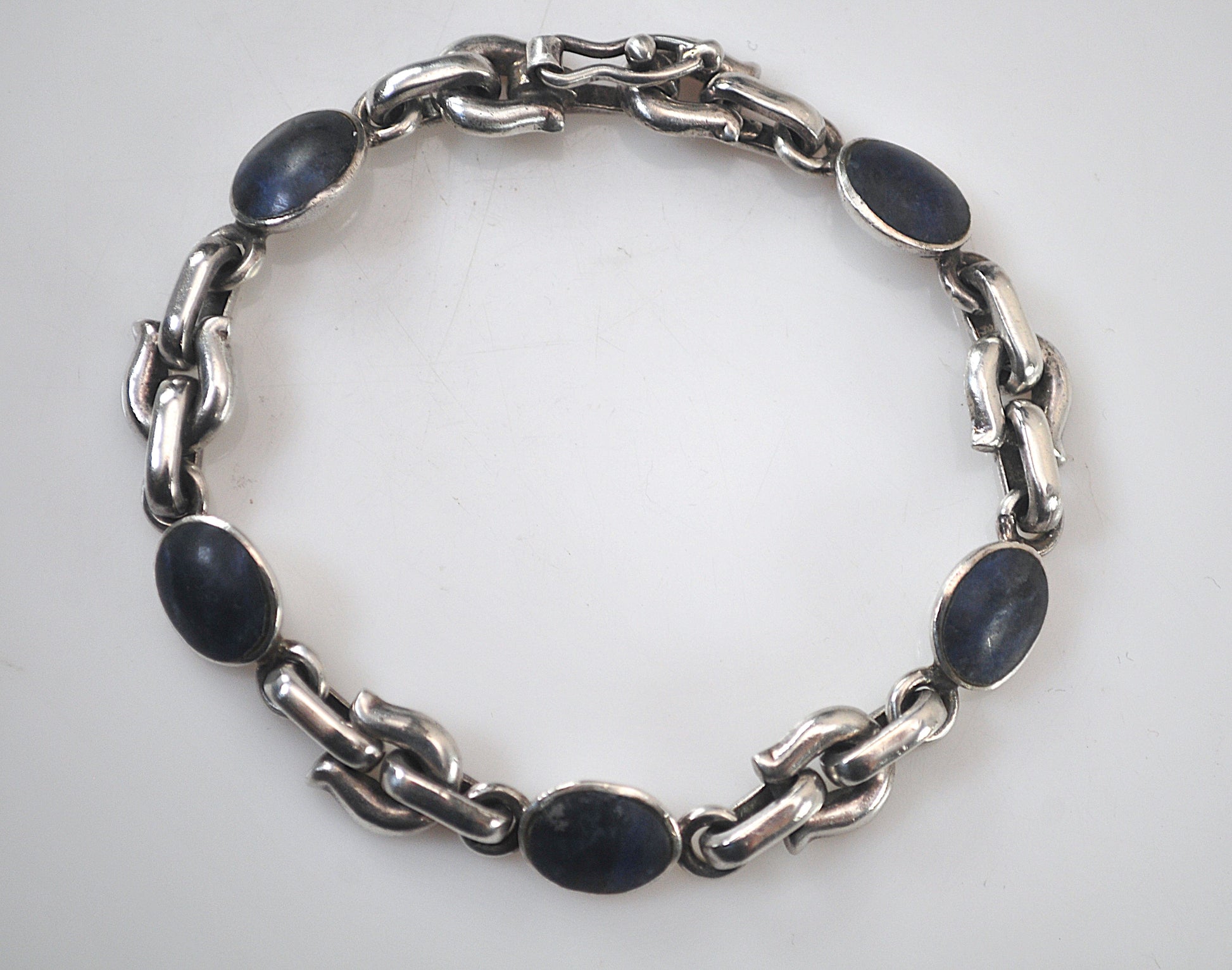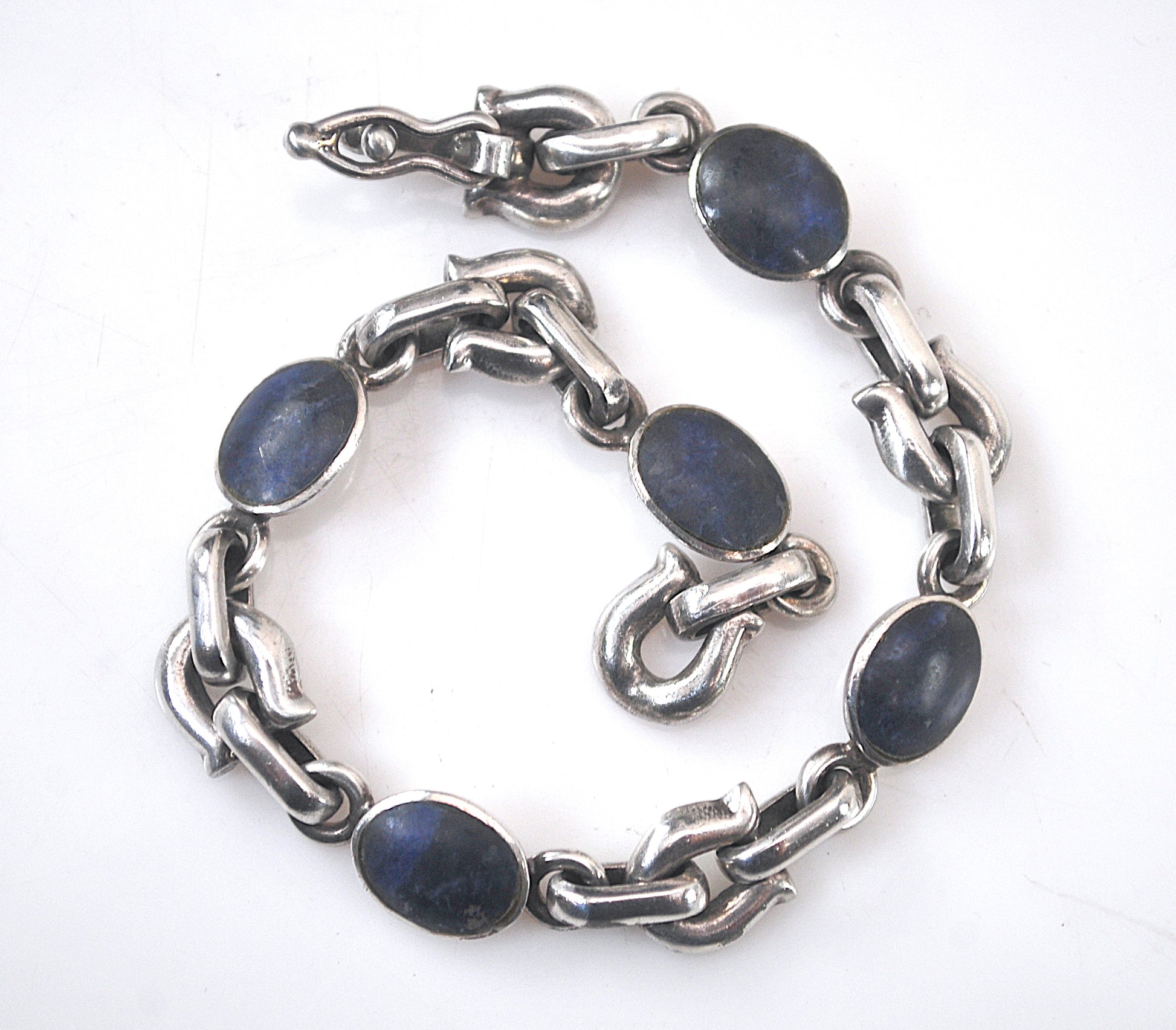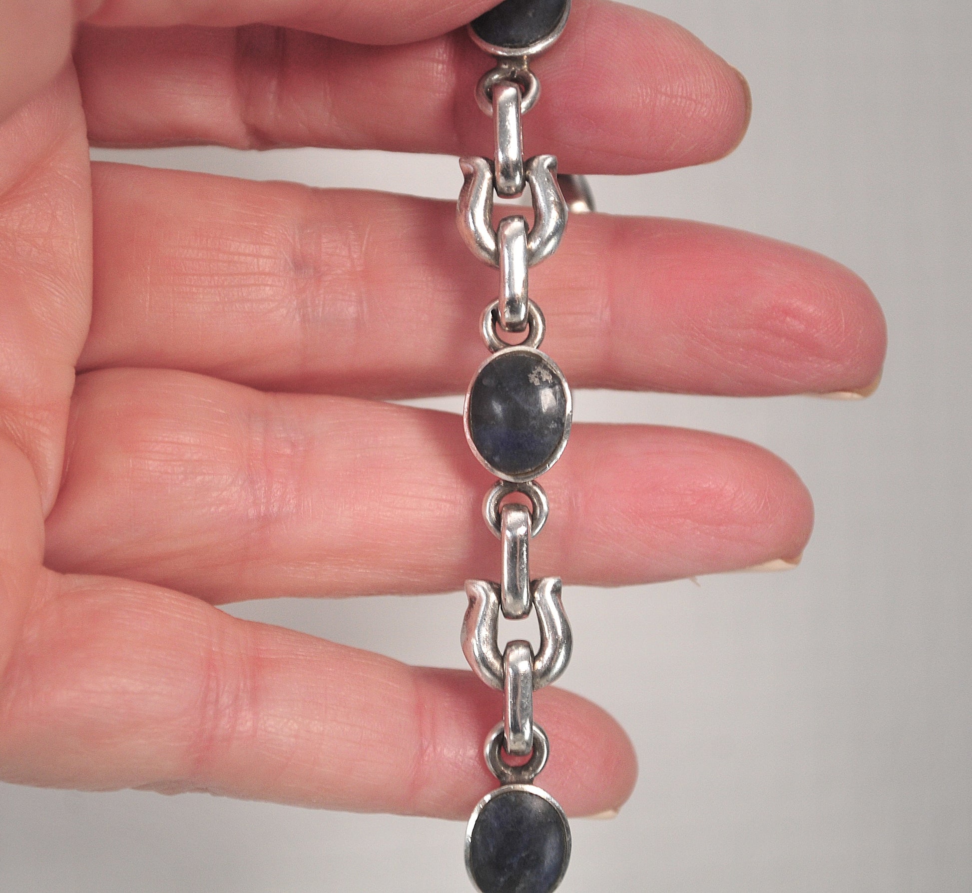 This is an older bracelet I believe from the 1940's and the Lapis stones show wear in the form of scratches. Handmade link bracelet is signed Mexico 950 and features horseshoe links.
