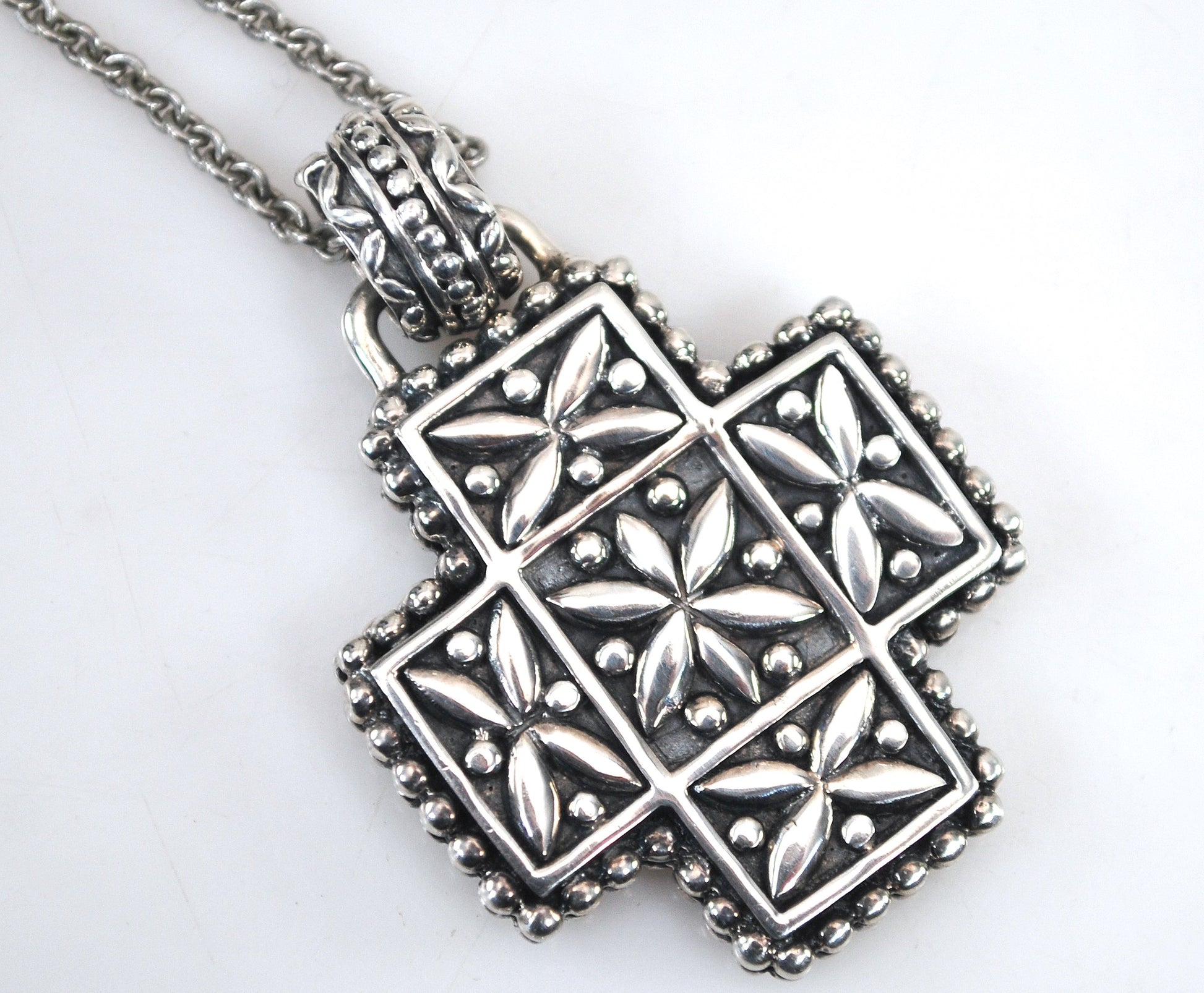 The stone in this pendant is a matte finish so it is not shiny. Large Southwestern design sterling silver square cross pendant is marked 925 and features a floral reverse.