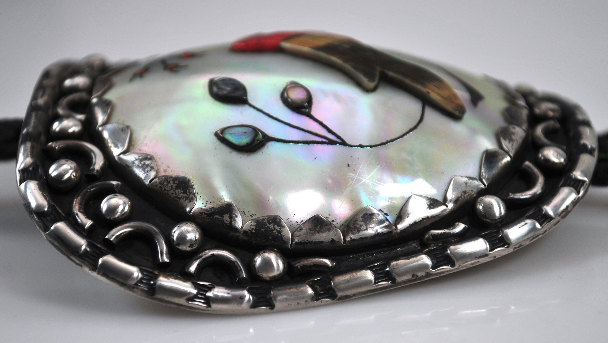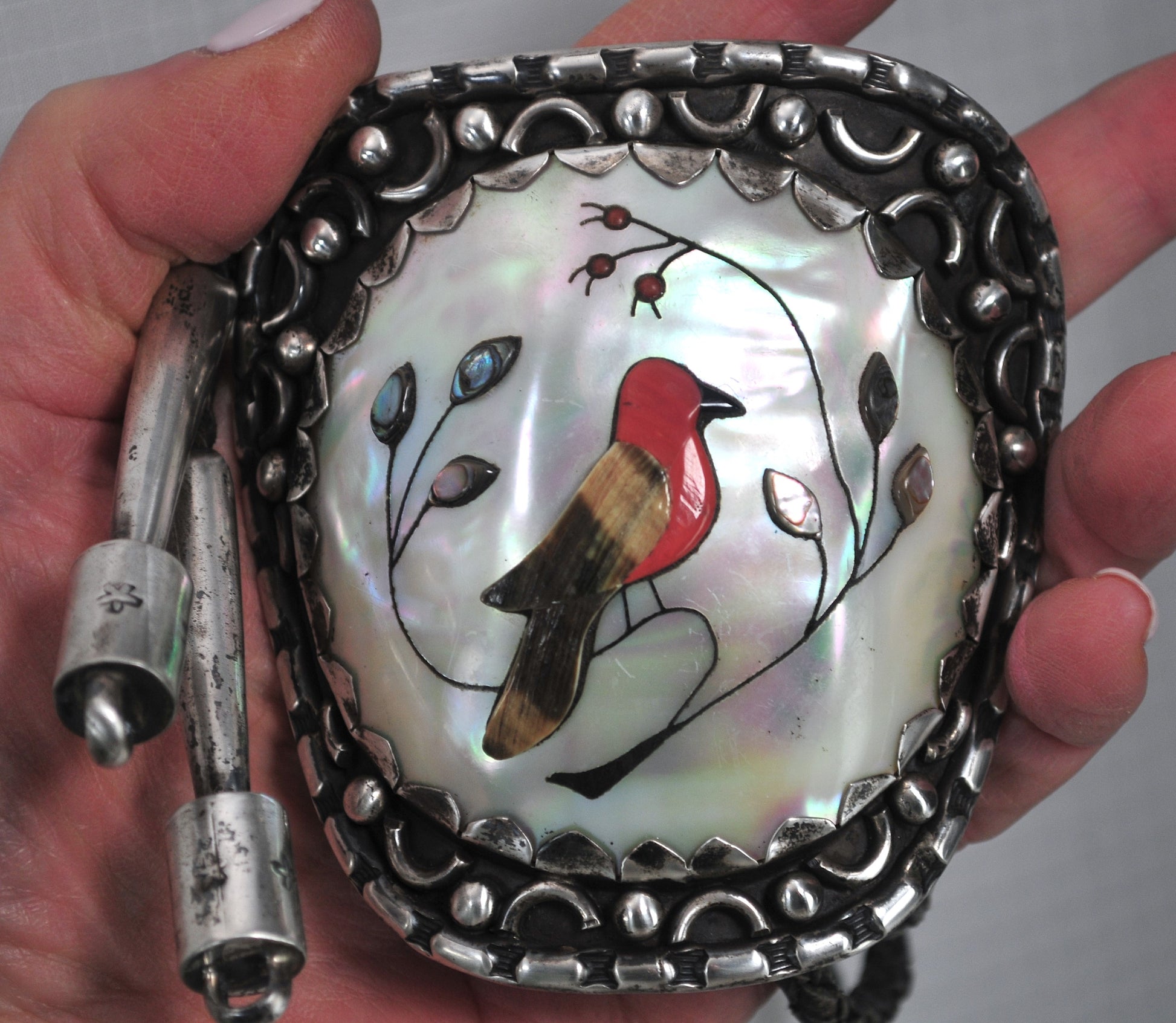 Large and amazing sterling silver bolo is signed by Native American artist Phillip Johnson and tests as sterling silver. It features a raised image of a Cardinal on a branch composed of inlay of Coral, Abalone, Bone and Jet. This was part of an estate collection I purchased and I did minor polishing on it.