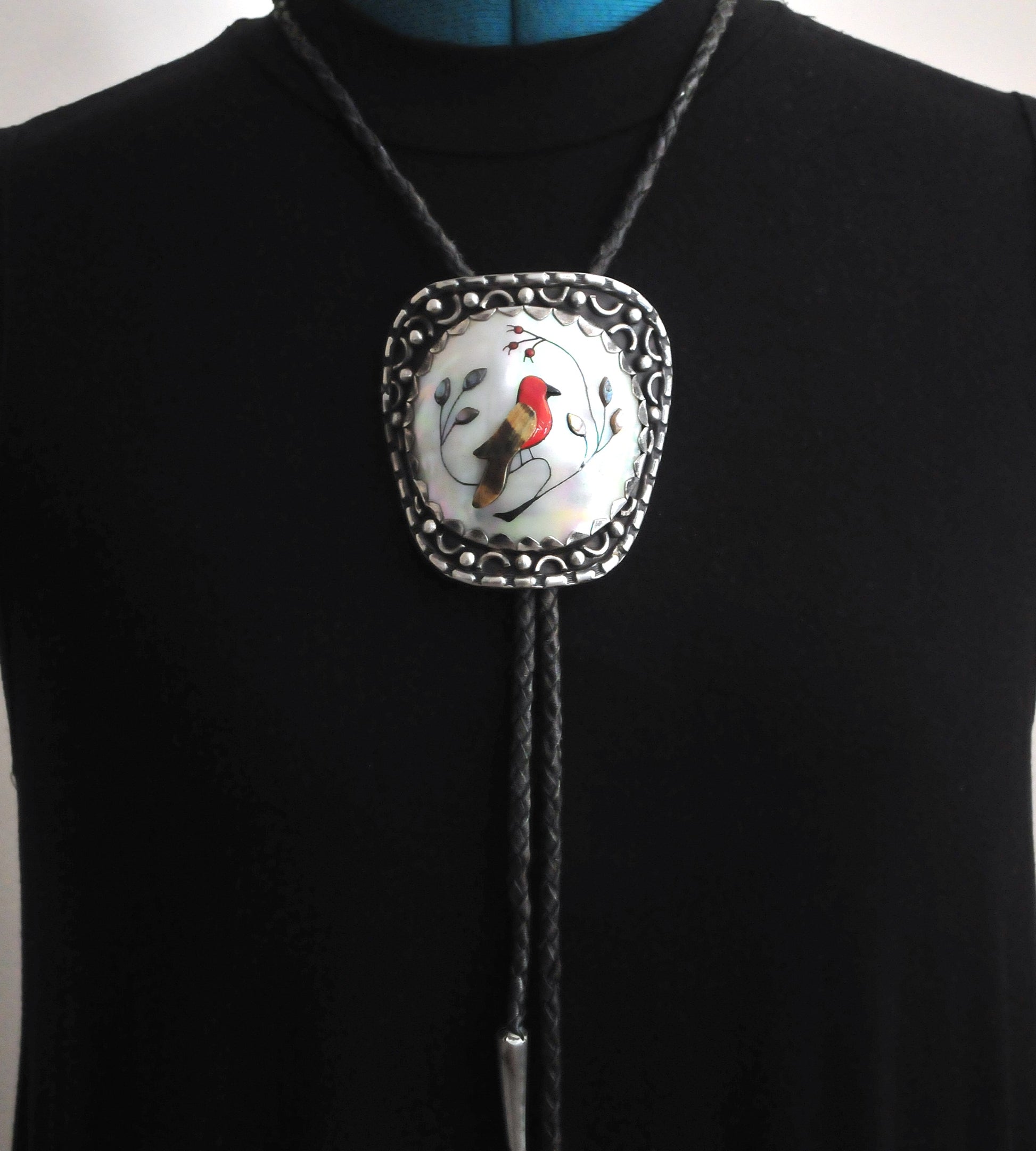 Signed Native American Sterling Silver Cardinal Inlay Bolo Tie