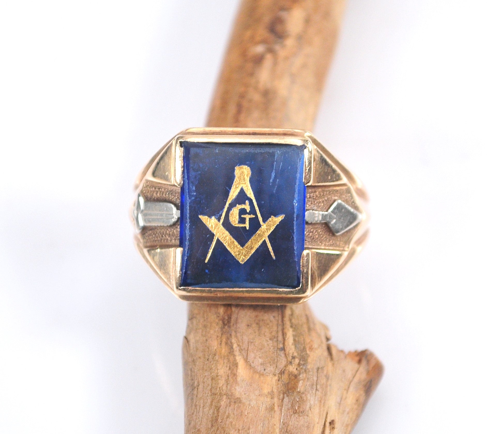 This ring shows significant wear as can be seen in the photos, but the ring is solid and intact. Vintage Freemason ring is marked 10K and features the square and compass on a translucent blue stone.