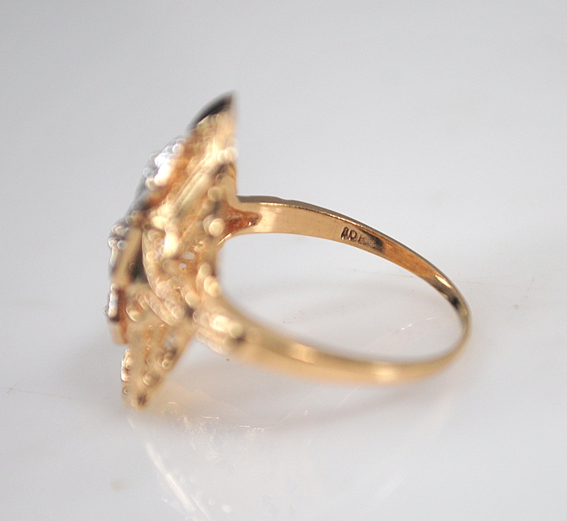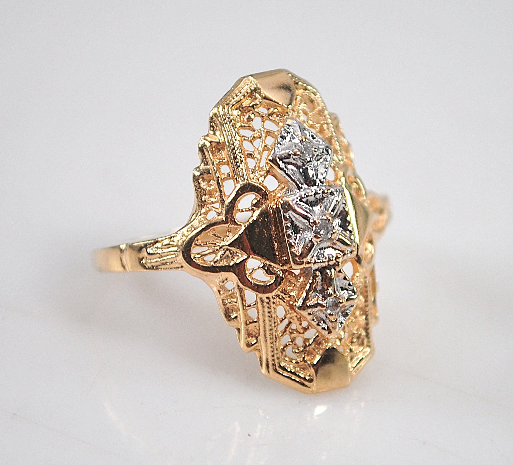 10K yellow gold Diamond ring is marked 10K and features three SMALL natural Diamonds in an openwork filagree setting.