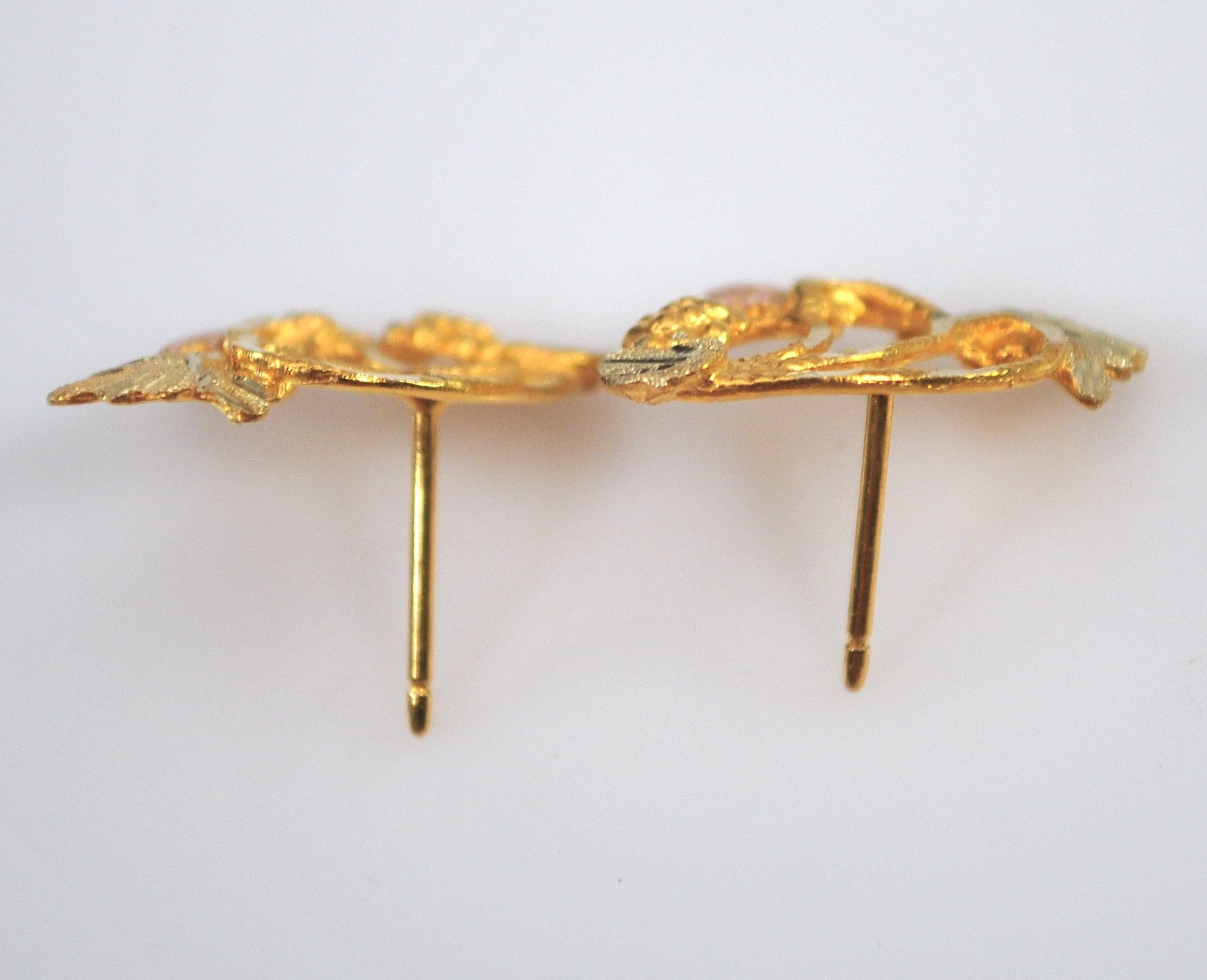 10K tri color gold earrings are marked 10K and feature rose and green gold leaves and yellow gold vines and grapes. They come with silicone backs.