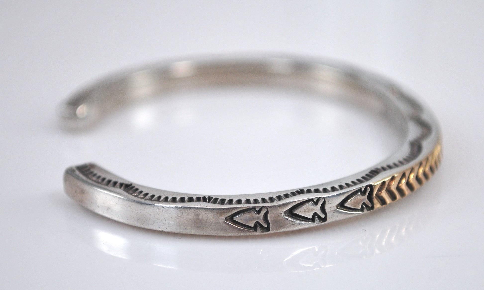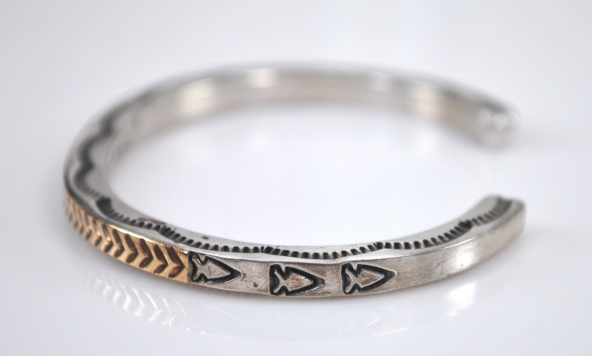 Vintage Southwestern Navajo handmade mixed metal cuff bracelet is signed with the Alvin Monte hallmark STERLING 14K and features a 14K yellow gold top. This bracelet is for a SMALL WRIST, no larger than 6 inches.