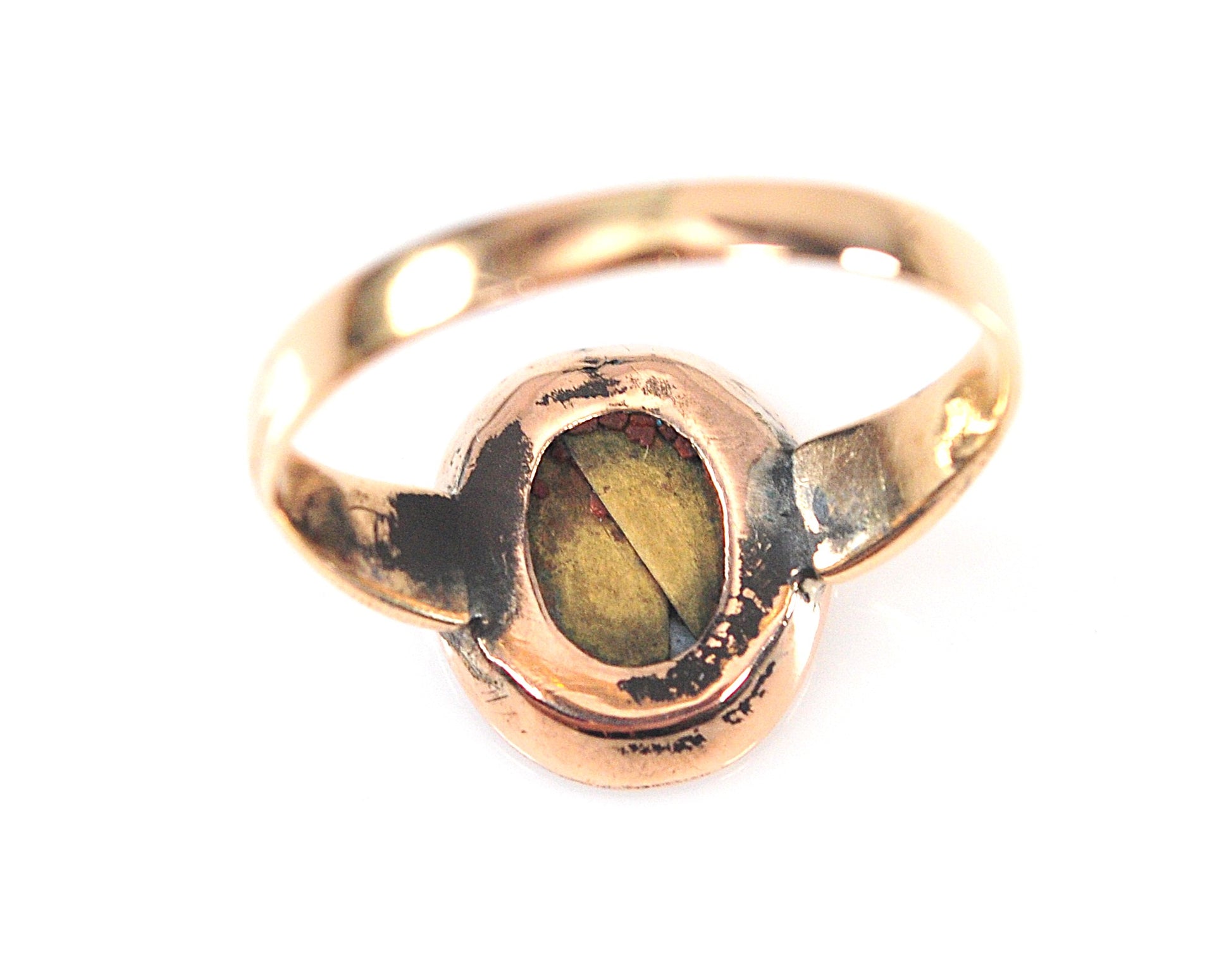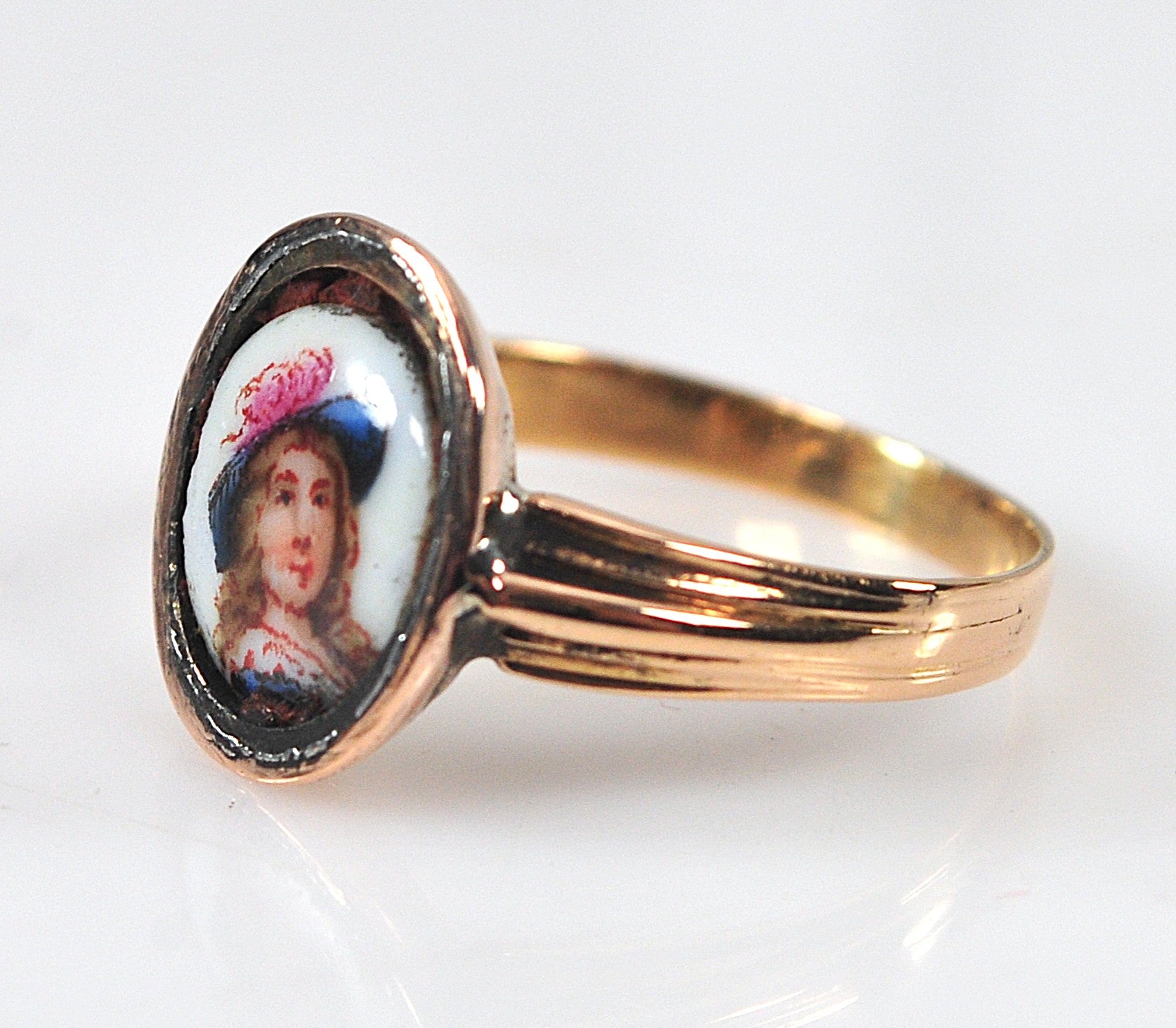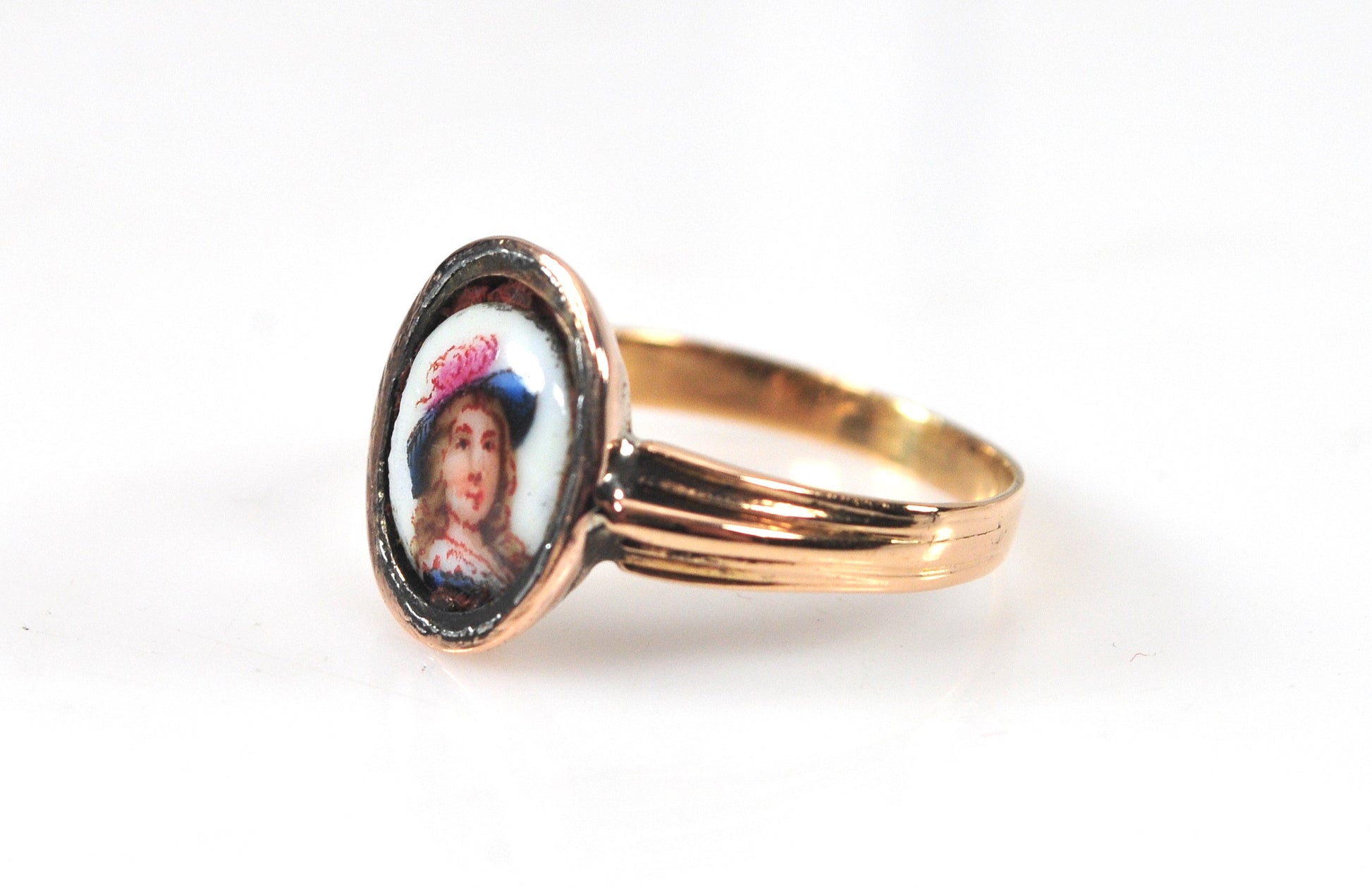 As can be seen in the photos, there is a gap between the porcelain and the ring frame at the top. Antique 10K rose gold ring is unmarked and has been tested by a jeweler, and features a hand painted portrait.