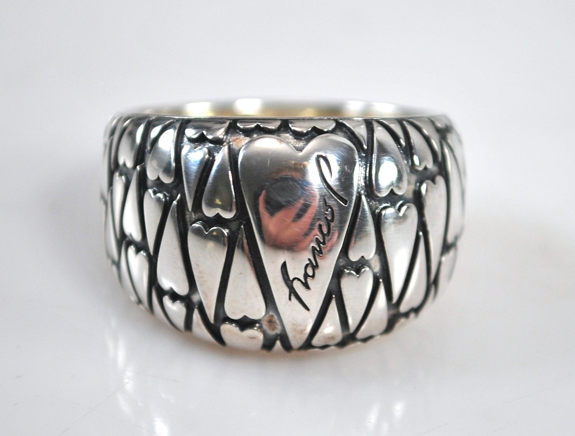 Wide sterling silver Italian designer ring is hallmarked and features a mosaic heart design.