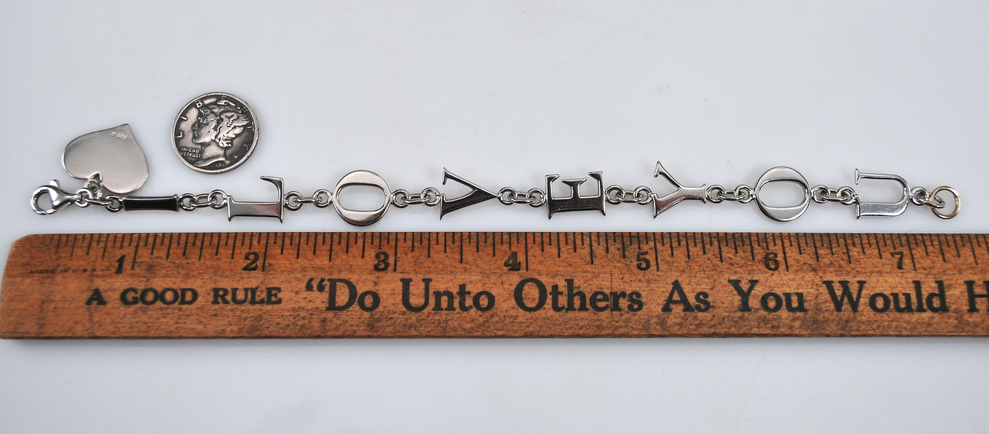 Designer sterling silver bracelet is signed 925 and a maker's mark and spells out "I LOVE YOU" in links and features a heart dangle.