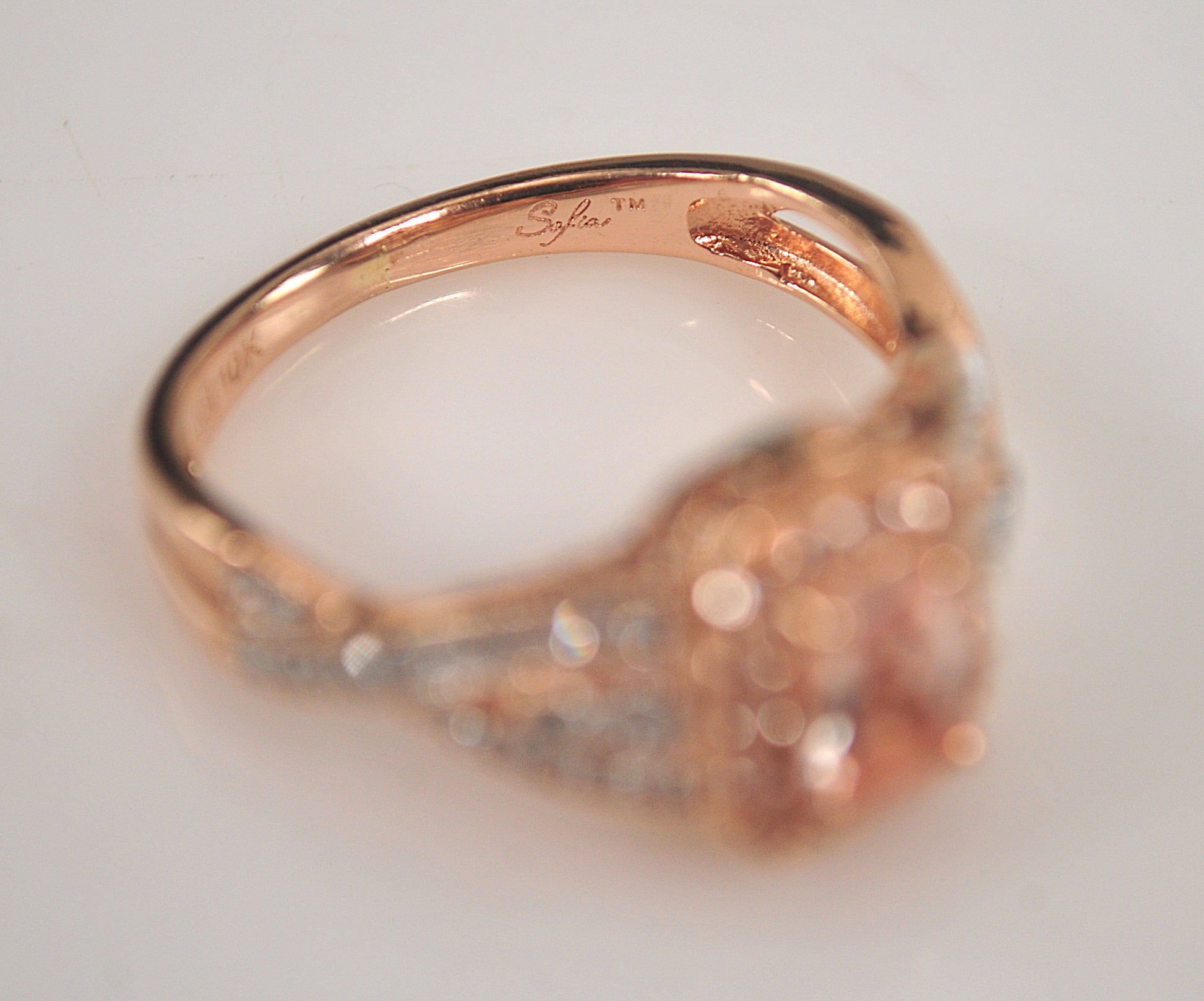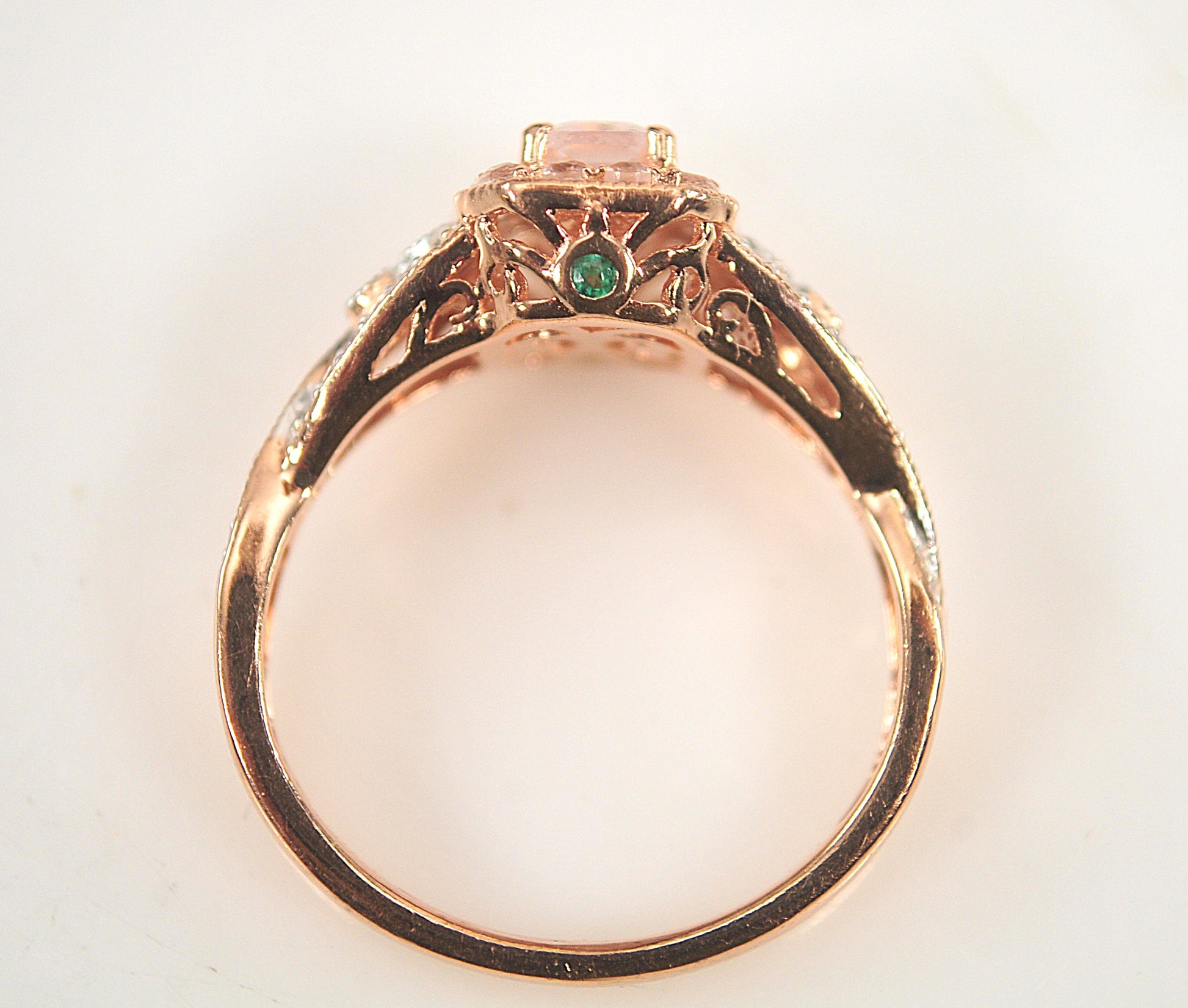10K rose gold ring is signed Sophia 10K and features an approximately 6x4mm Morganite with genuine natural Diamonds and two small Emeralds on the N/S sides of the setting.