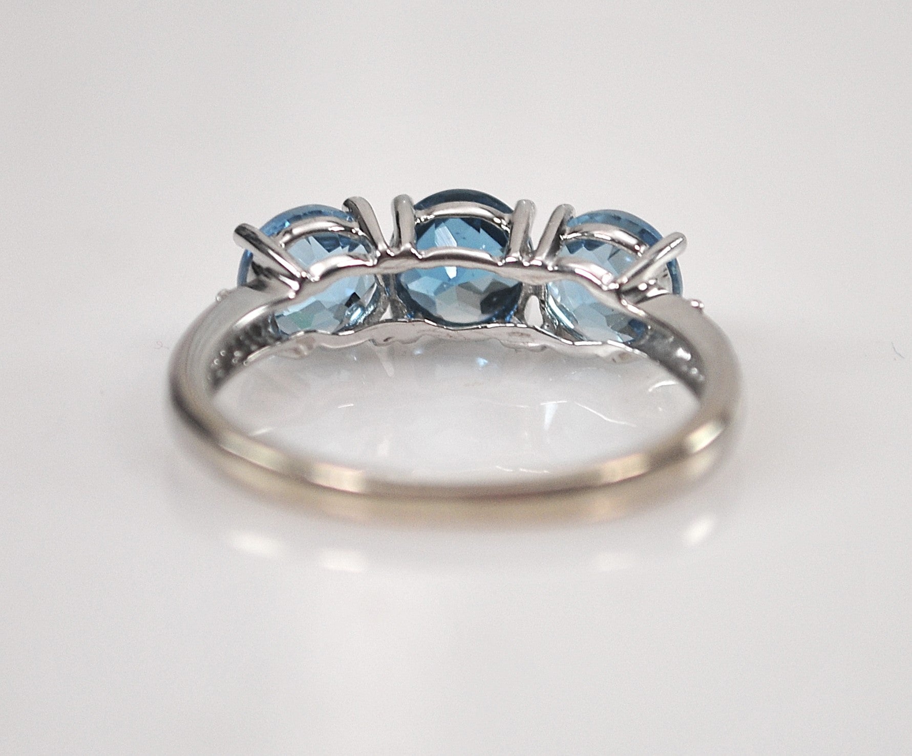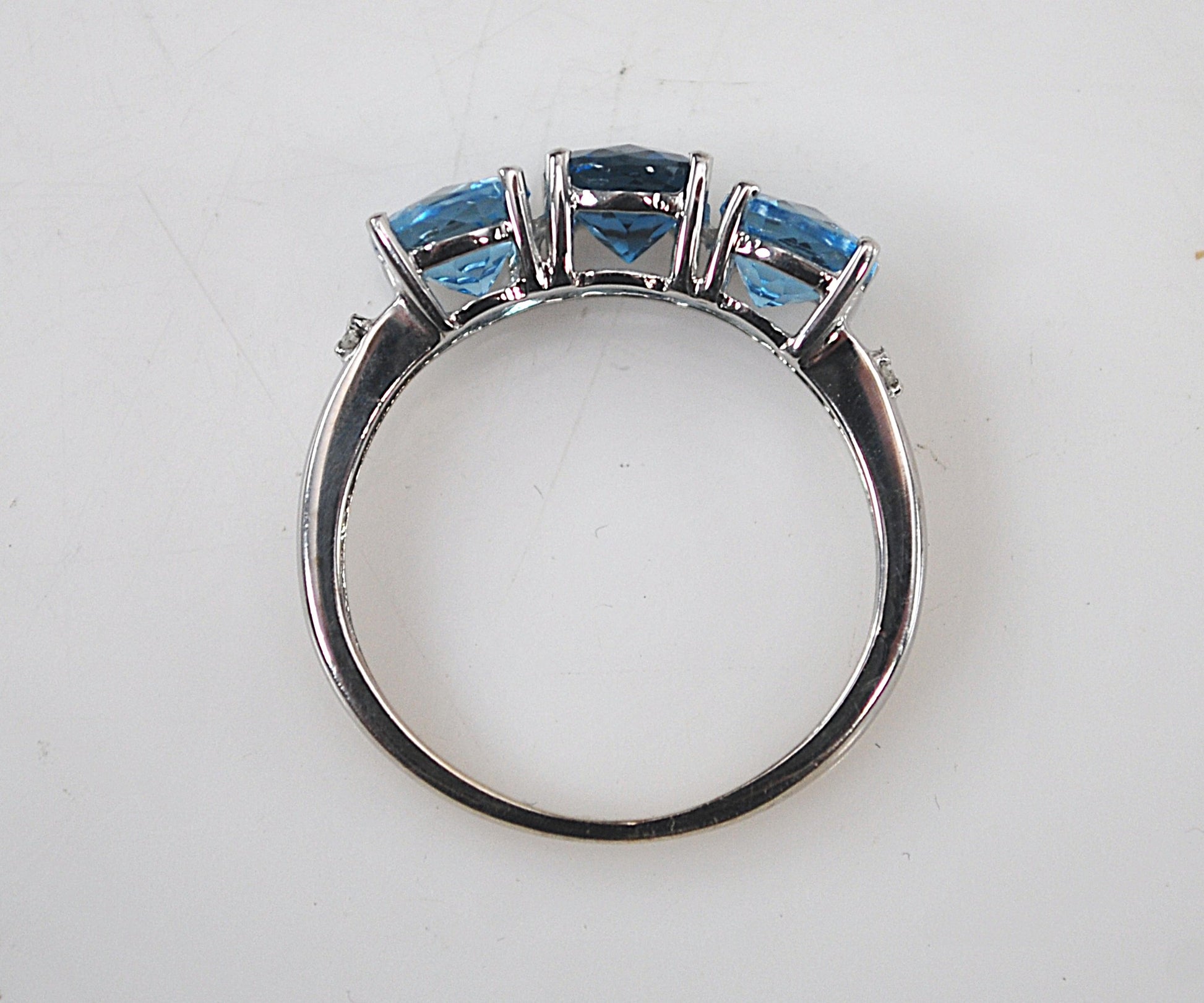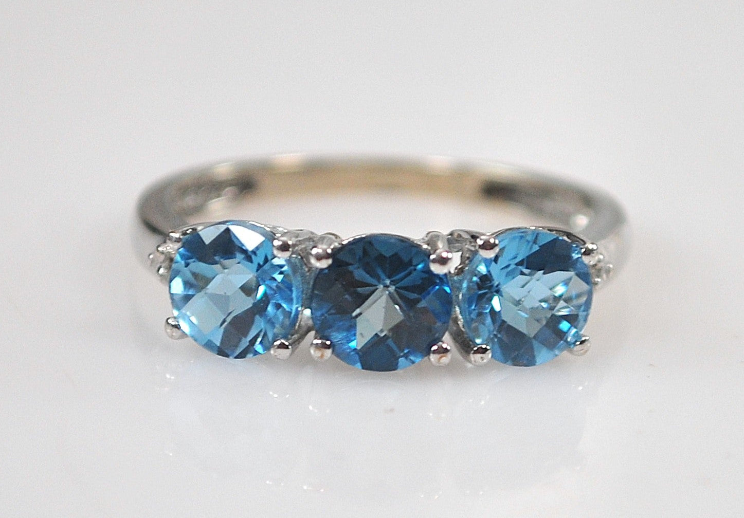 Vintage white gold Blue Topaz ring is marked 10K China and features two small Diamond chips on the shoulders. It looks like a London Blue Topaz in the center and Swiss Blue Topaz on the ends.