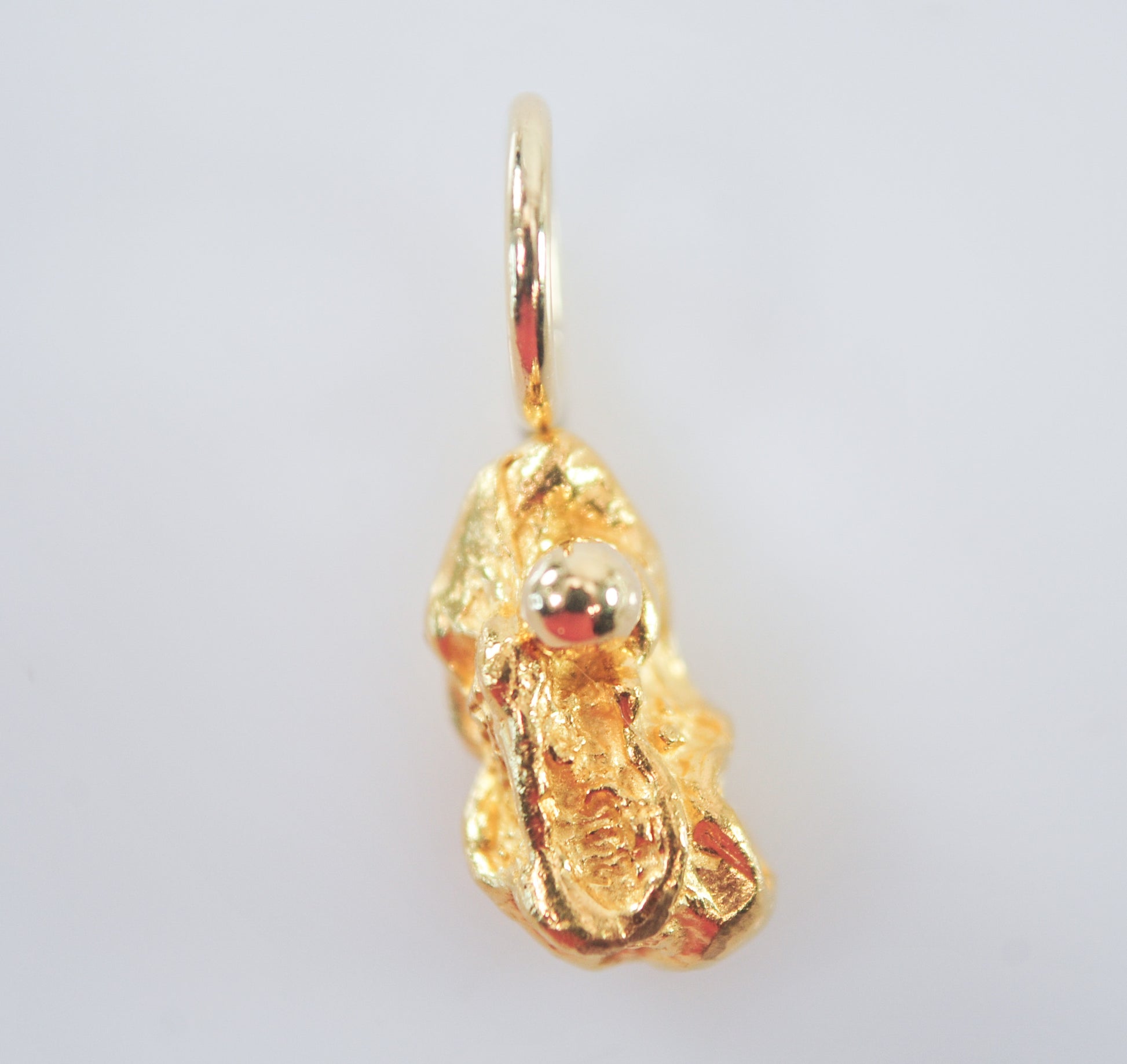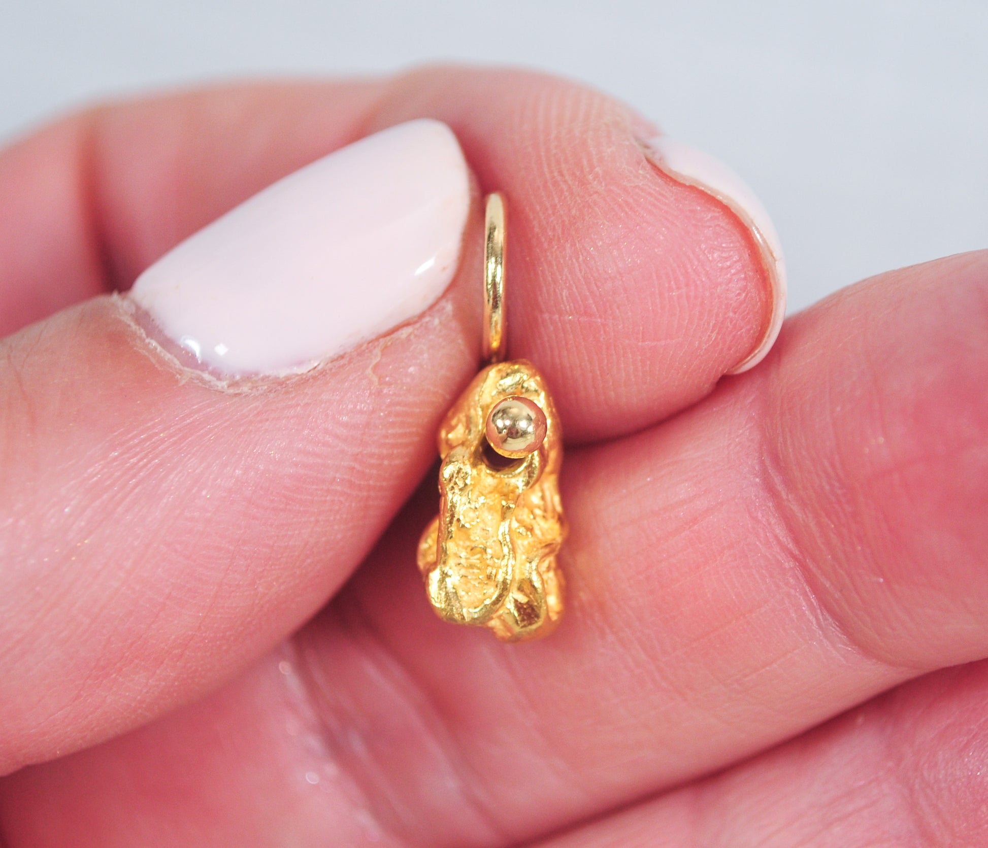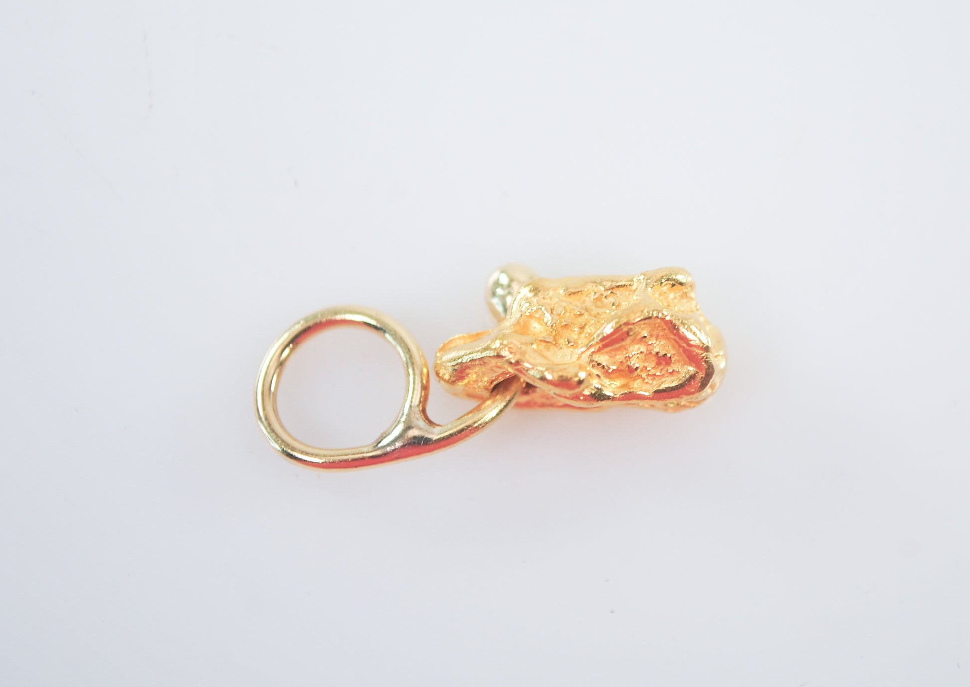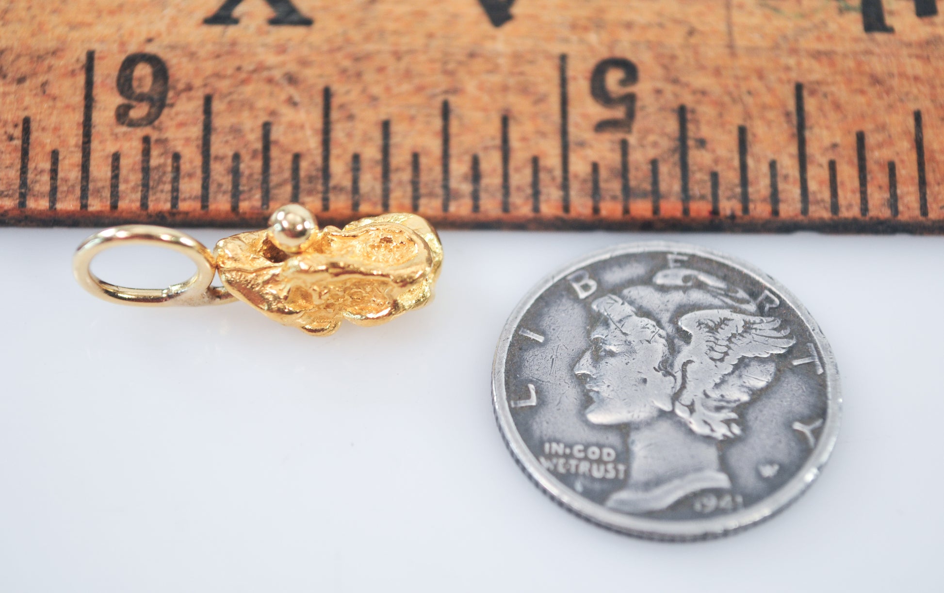 Solid 14K gold nugget pendant is marked 14K and has been tested, and measures 3/4 inch, including the bail, by about 1/4 inch wide. It weighs 3.2 grams and it is in great vintage condition.