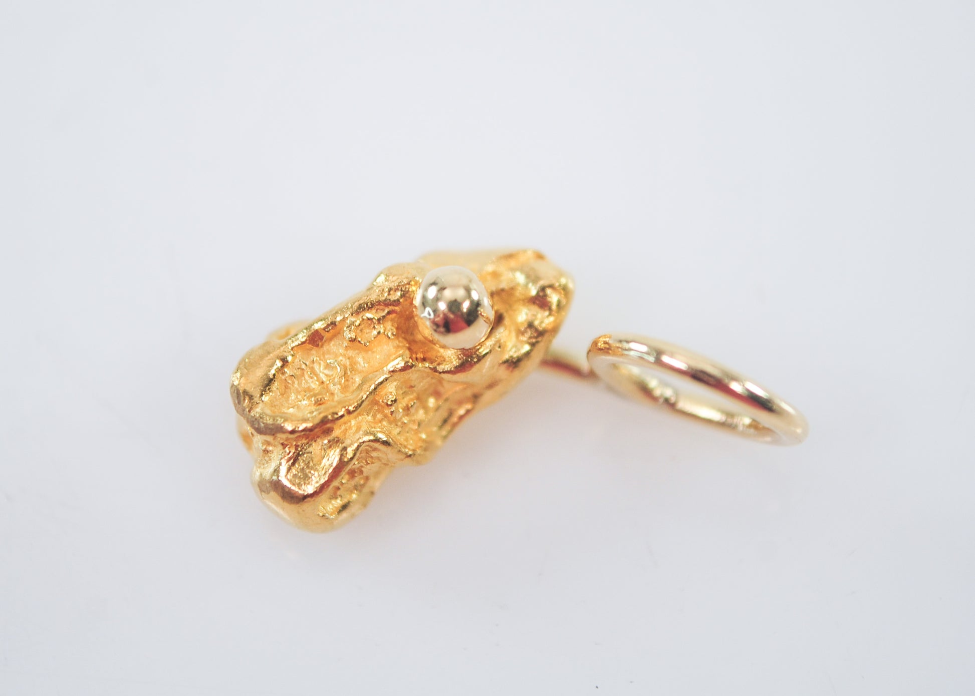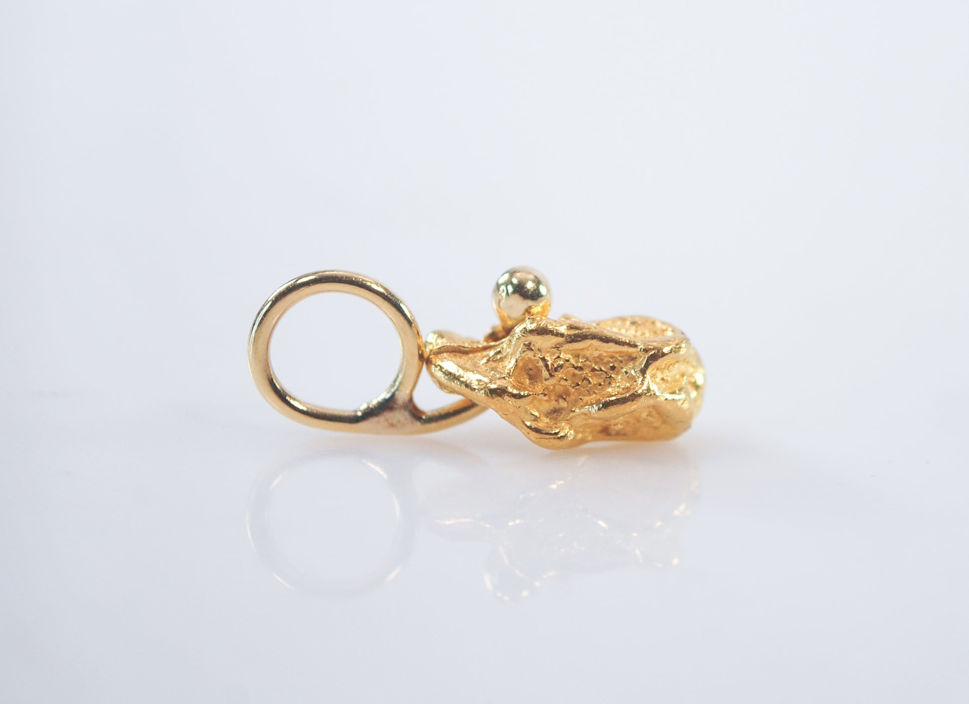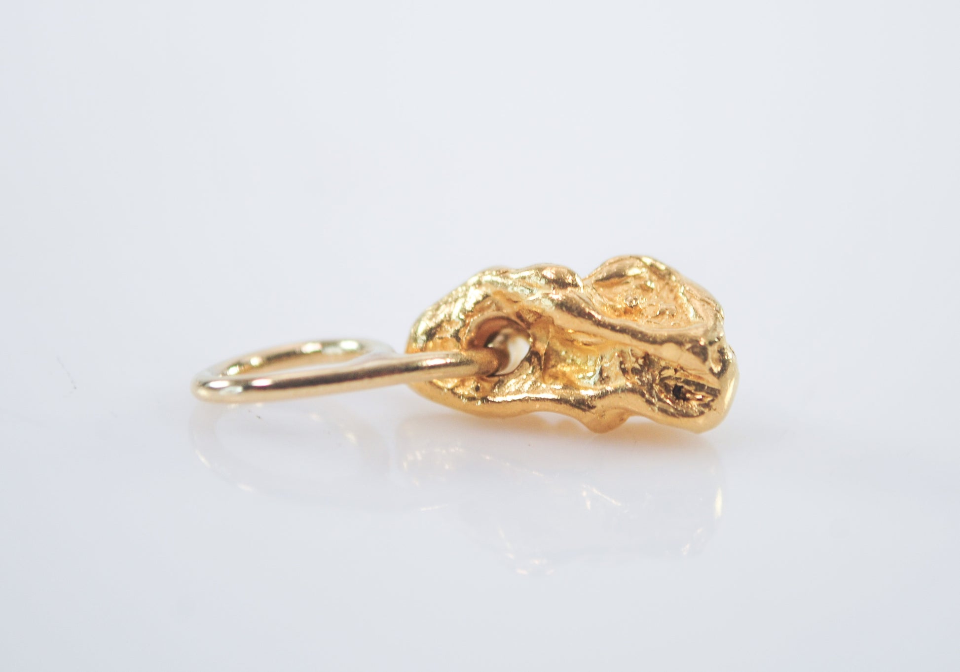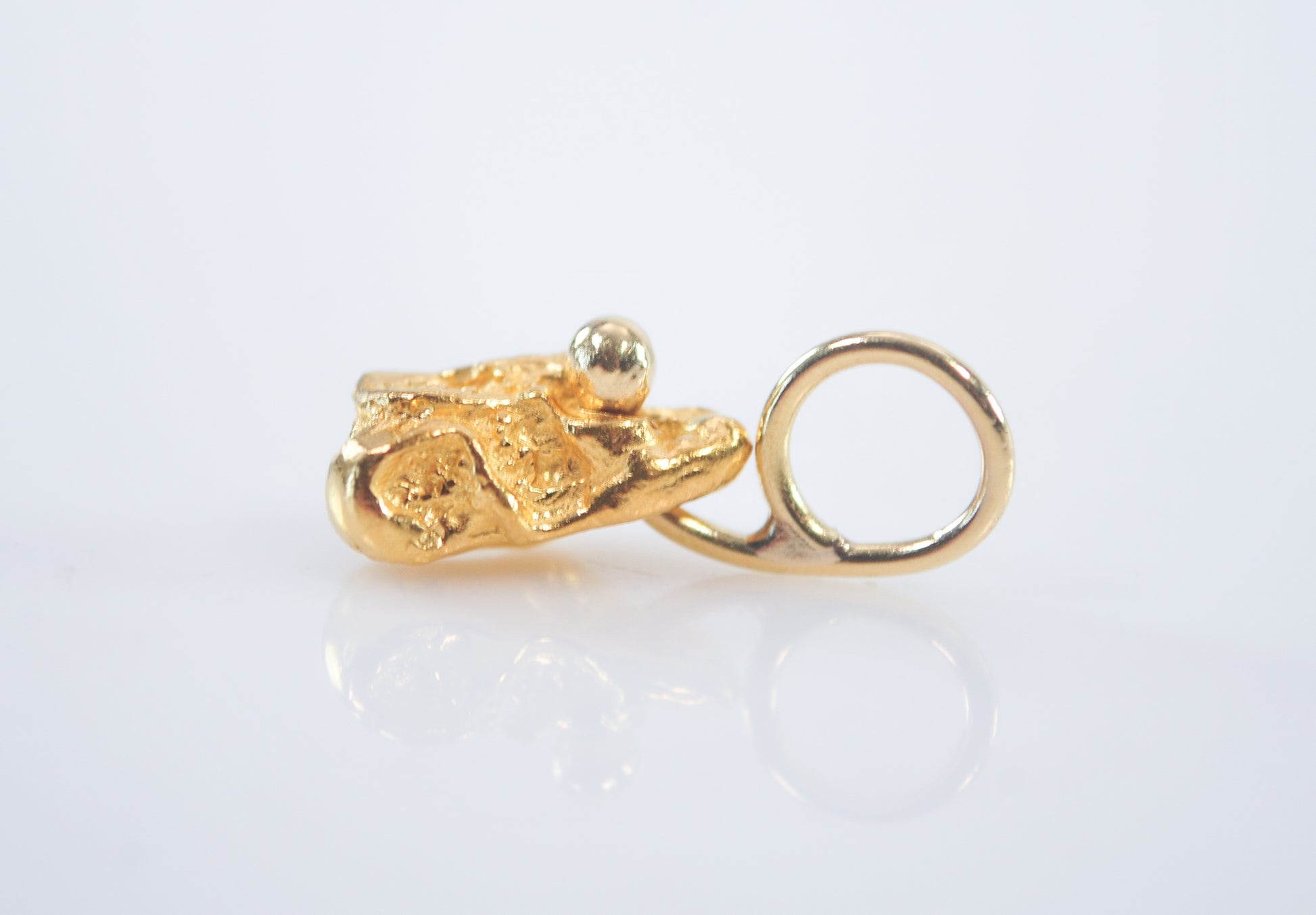 Solid 14K gold nugget pendant is marked 14K and has been tested, and measures 3/4 inch, including the bail, by about 1/4 inch wide. It weighs 3.2 grams and it is in great vintage condition.