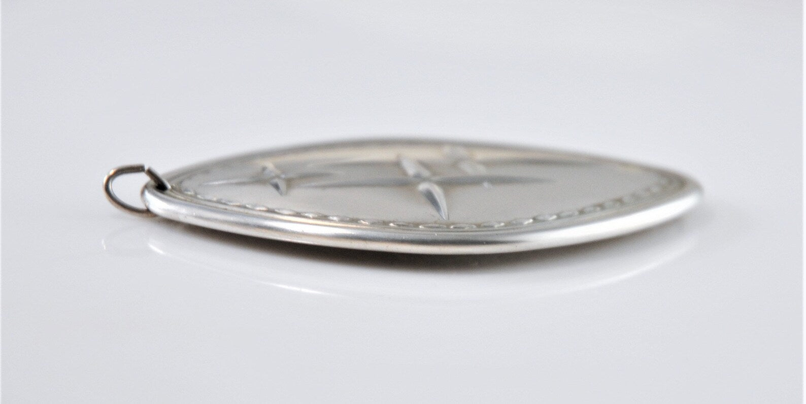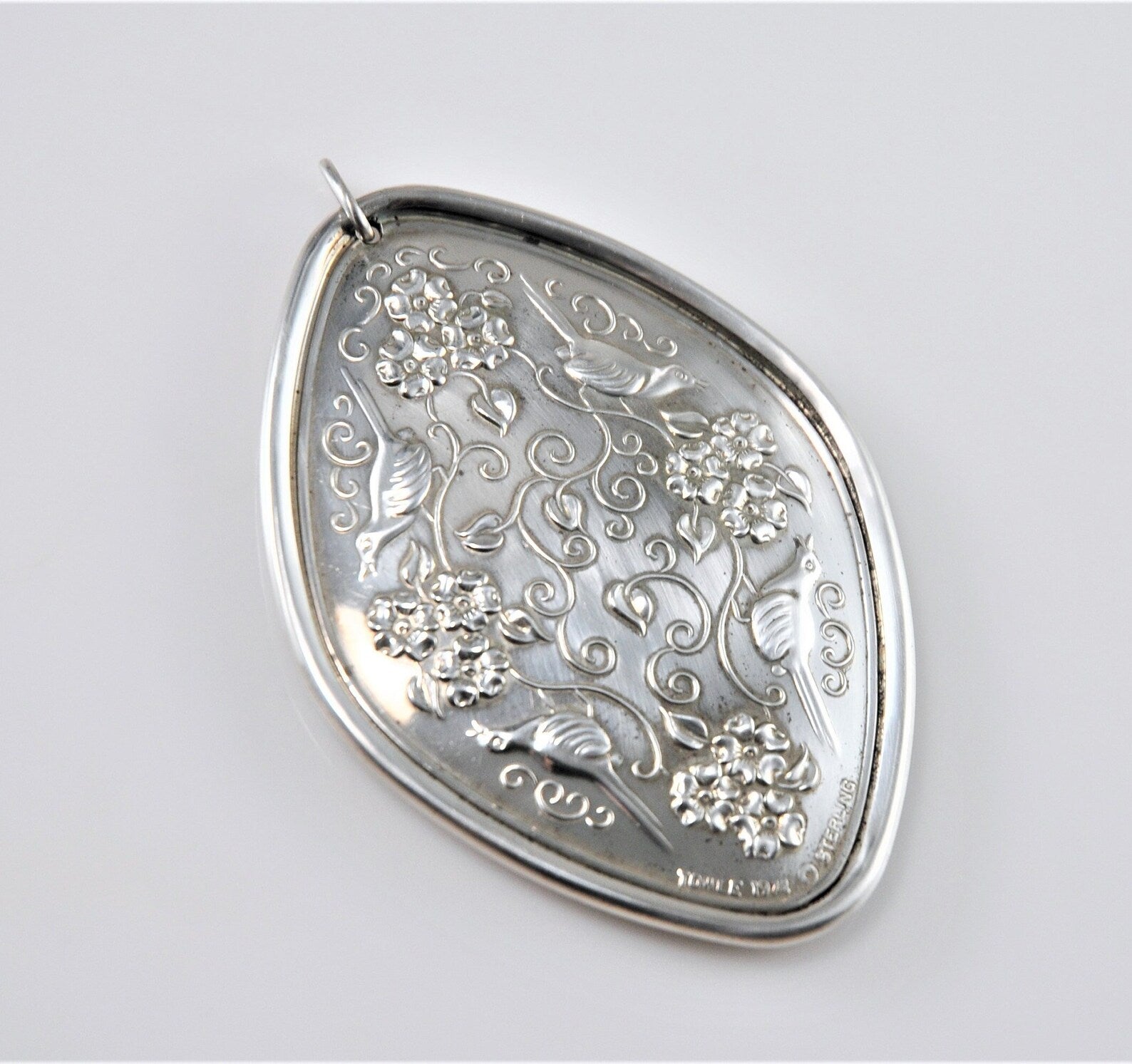 Large sterling silver fourth day of Christmas Towle ornament is one of the 12 days of Christmas series and displays 3 embossed crosses on one side and four calling birds on the other side.