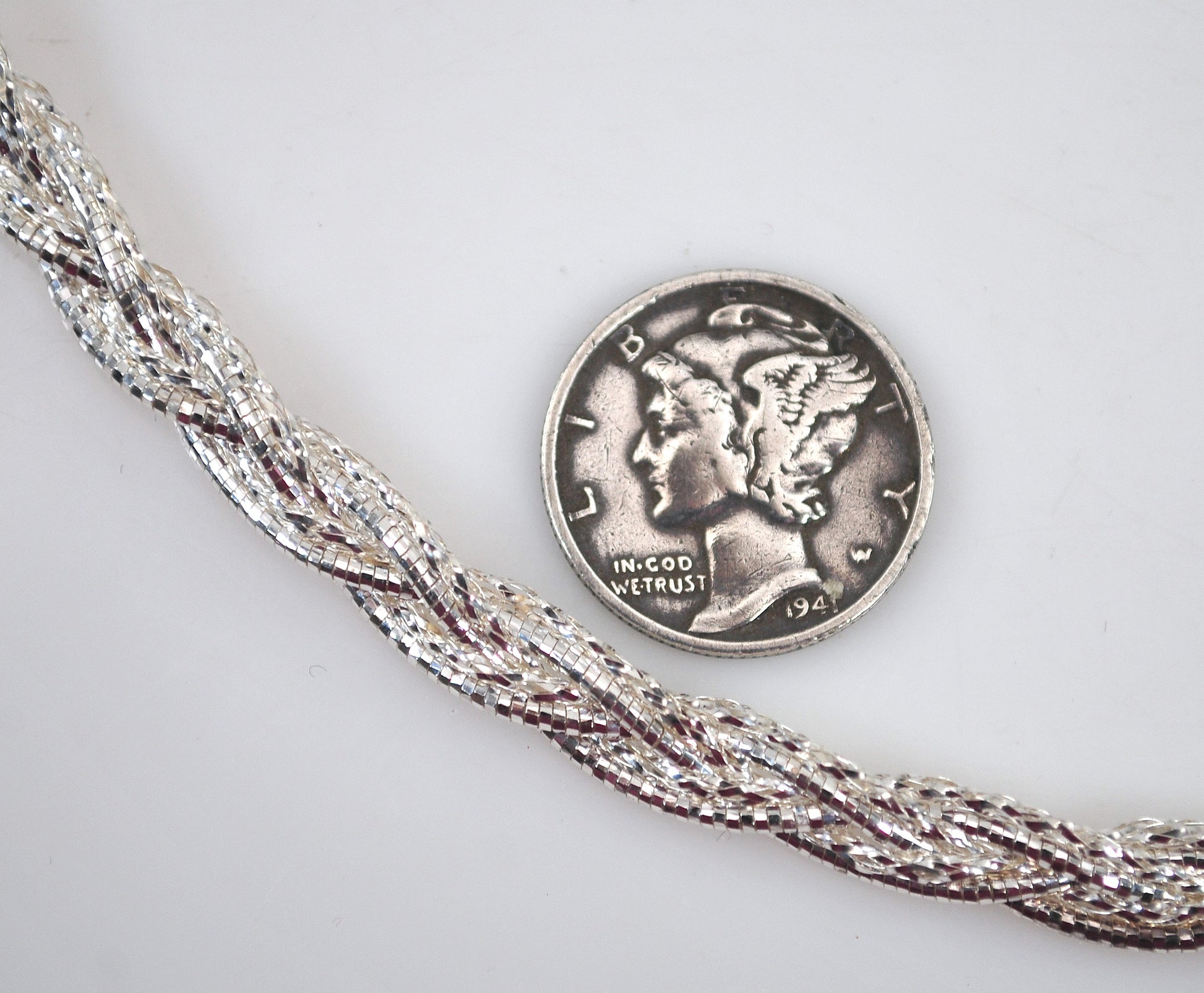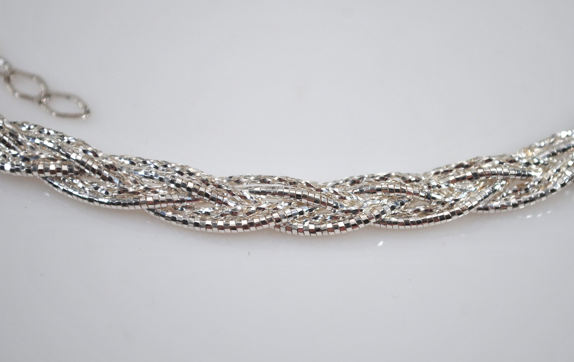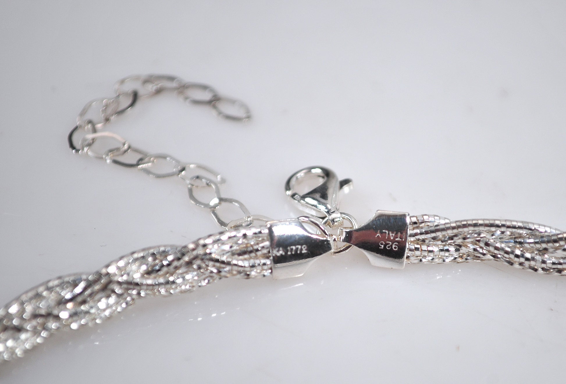 This necklace is disco ball sparkly. Adjustable Karizia sterling silver braided choker necklace is signed 925 Italy K 1772 and features a braid of beaded and twisted chains for lots of bling.
