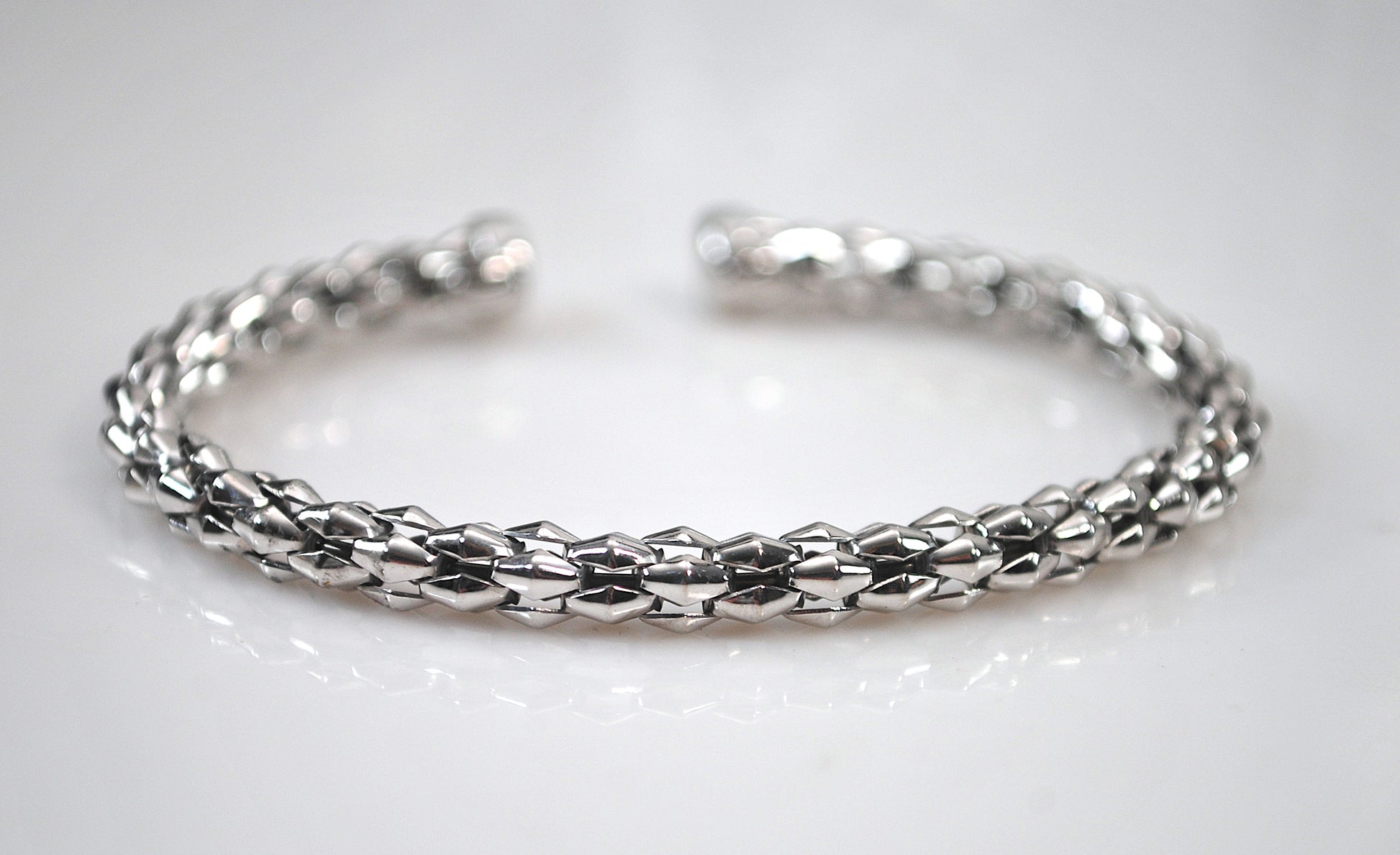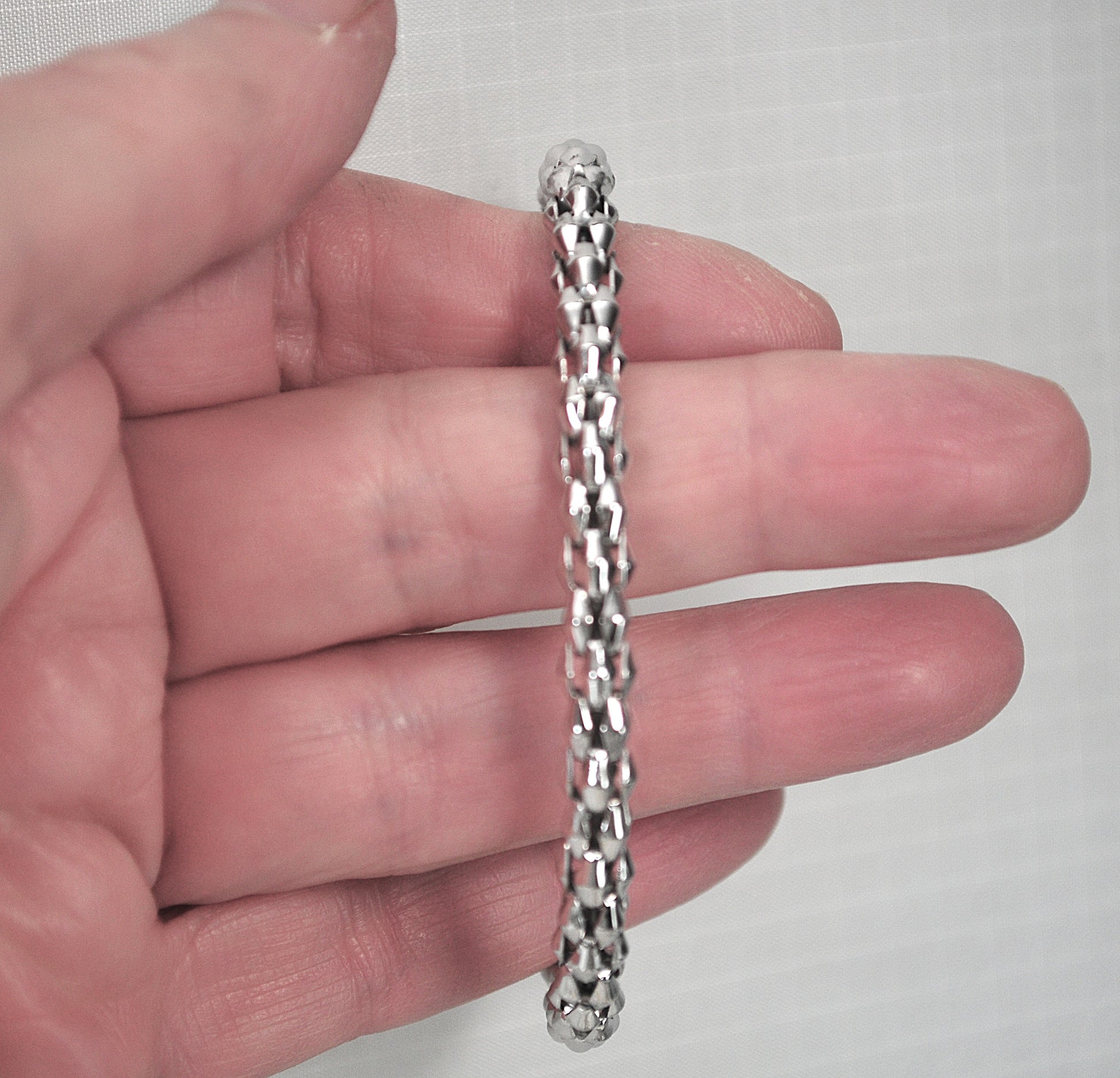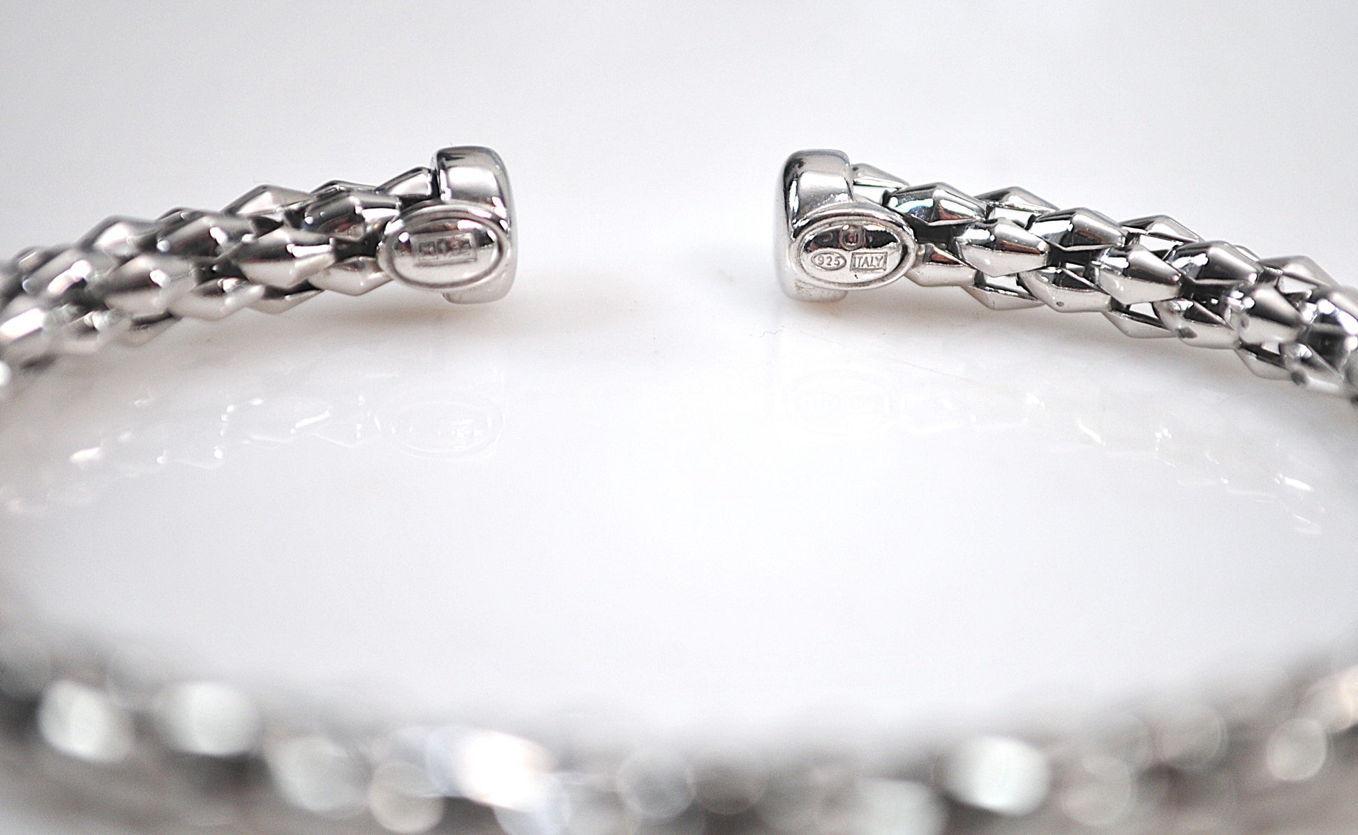 This bracelet is very flexible and shiny and sparkly. Sterling silver cuff bracelet is signed 925 Italy and features a mesh woven design that was slightly stretchy over a solid wire.
