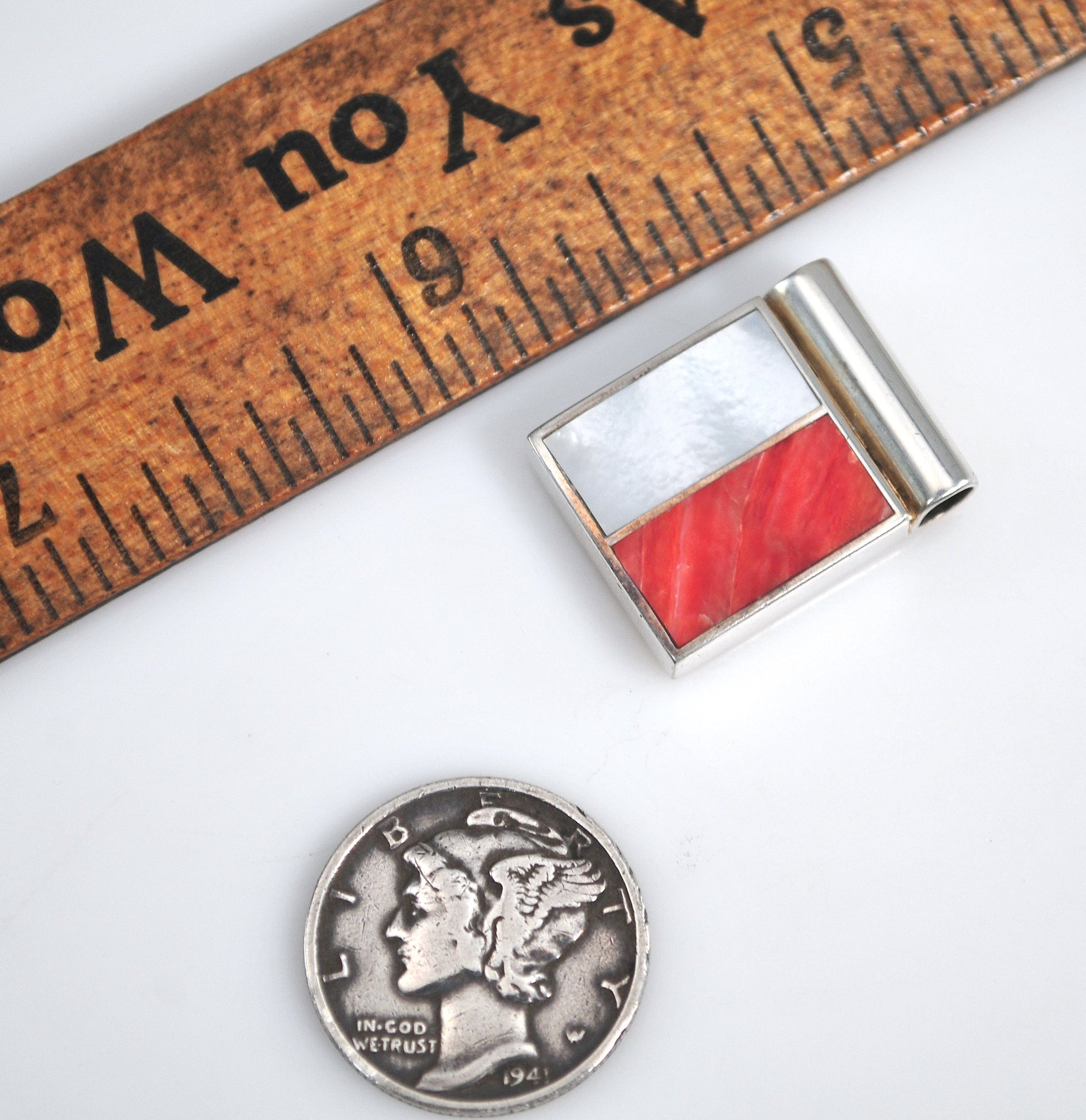 Nicely made 950 silver slider pendant is signed 950 and a maker's mark and features geometric inlay of Spiny Oyster and Mother of Pearl.