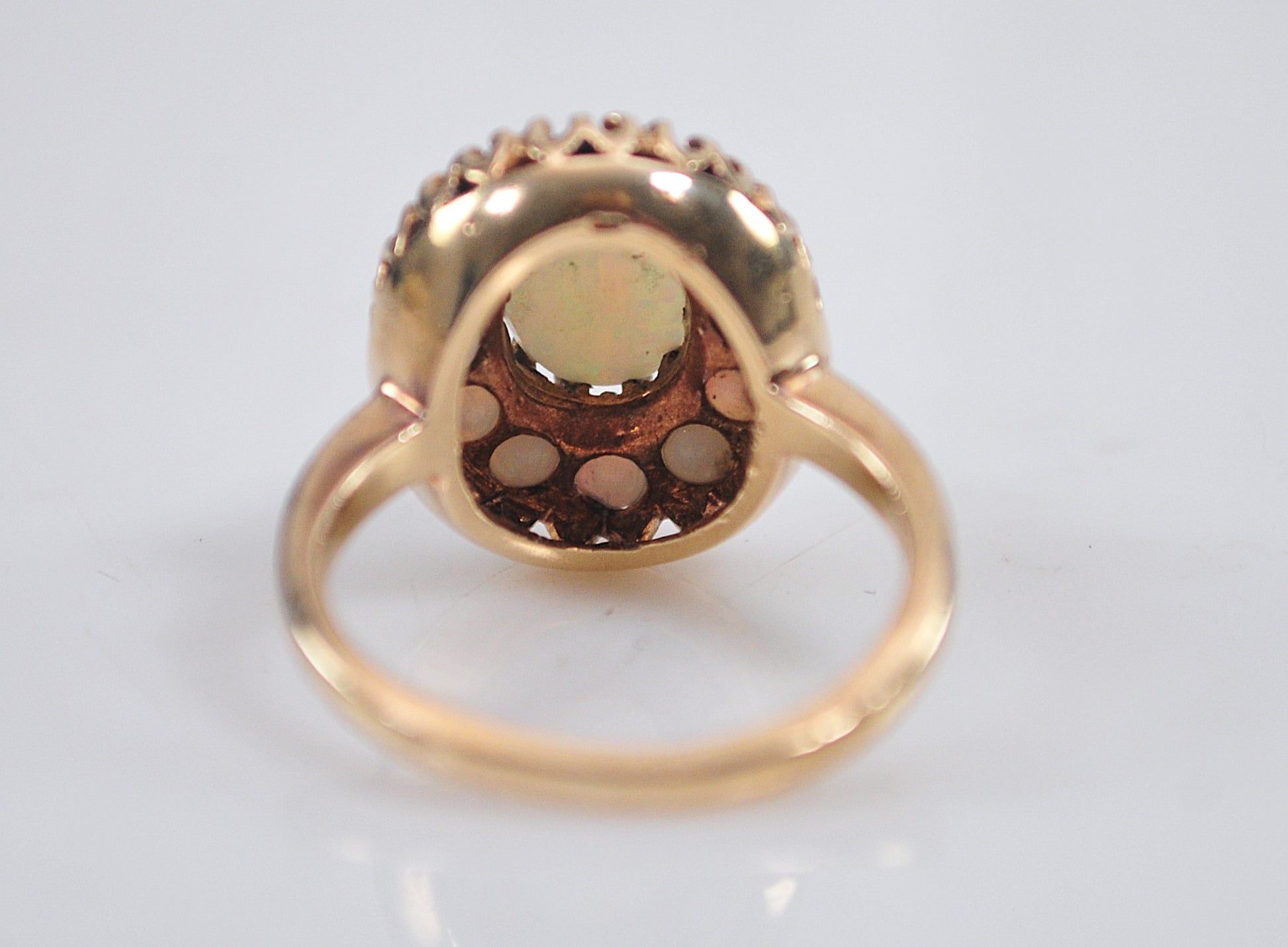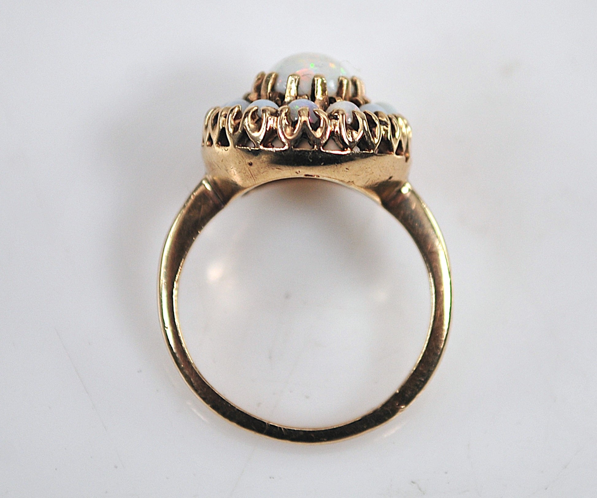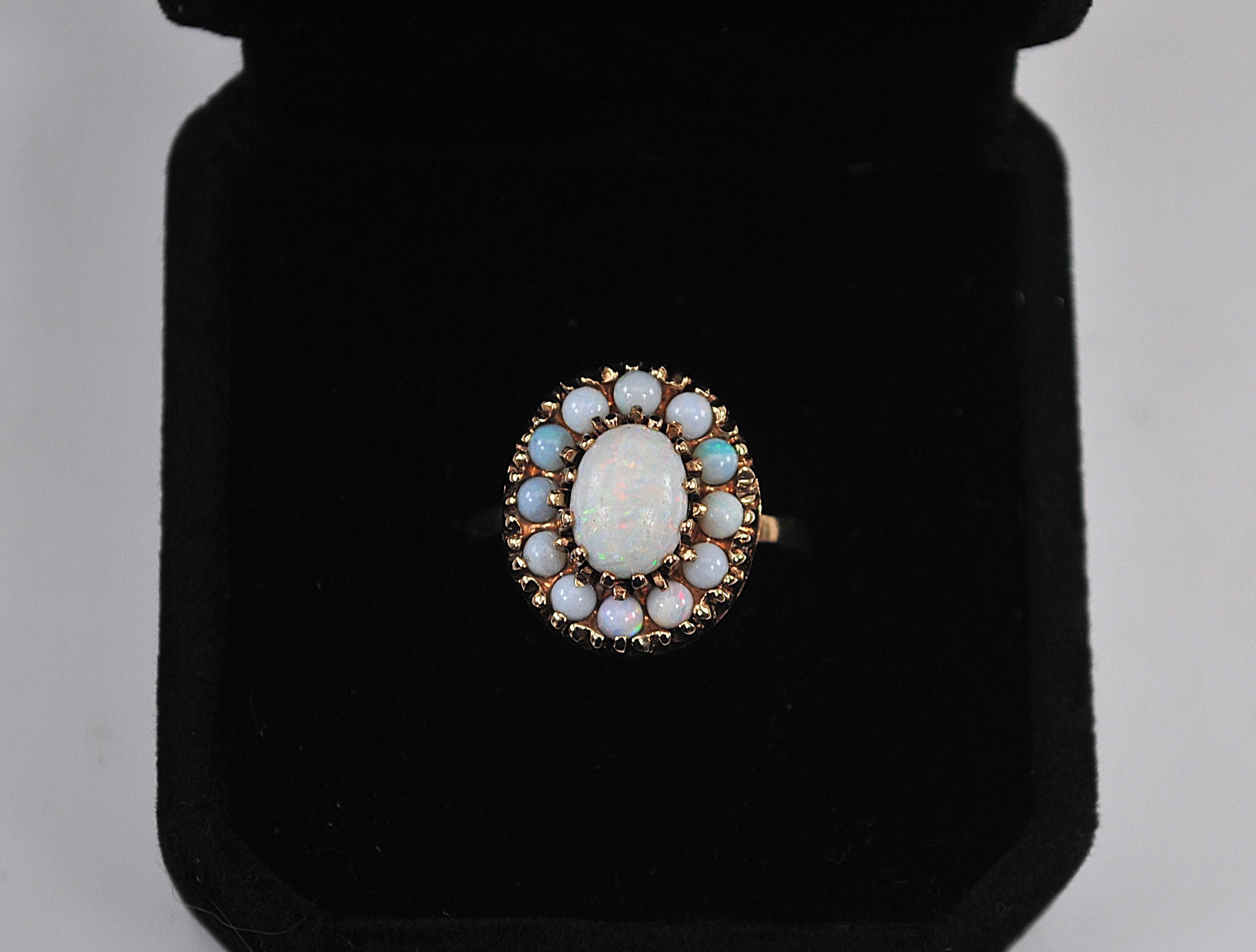 10K gold ring is signed 10K and a maker's mark and features a central oval Opal approximately 8x6.5mm surrounded by twelve approximately 3mm round Opals.