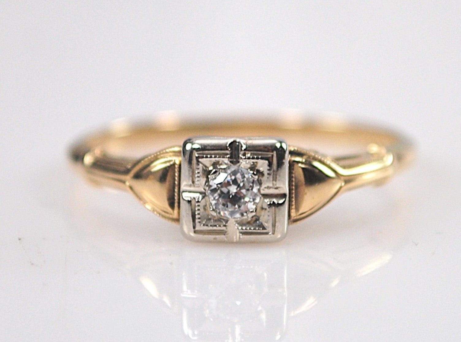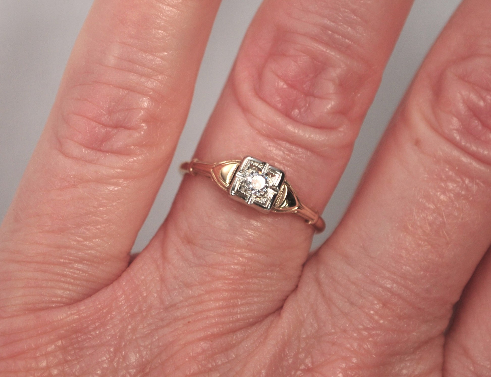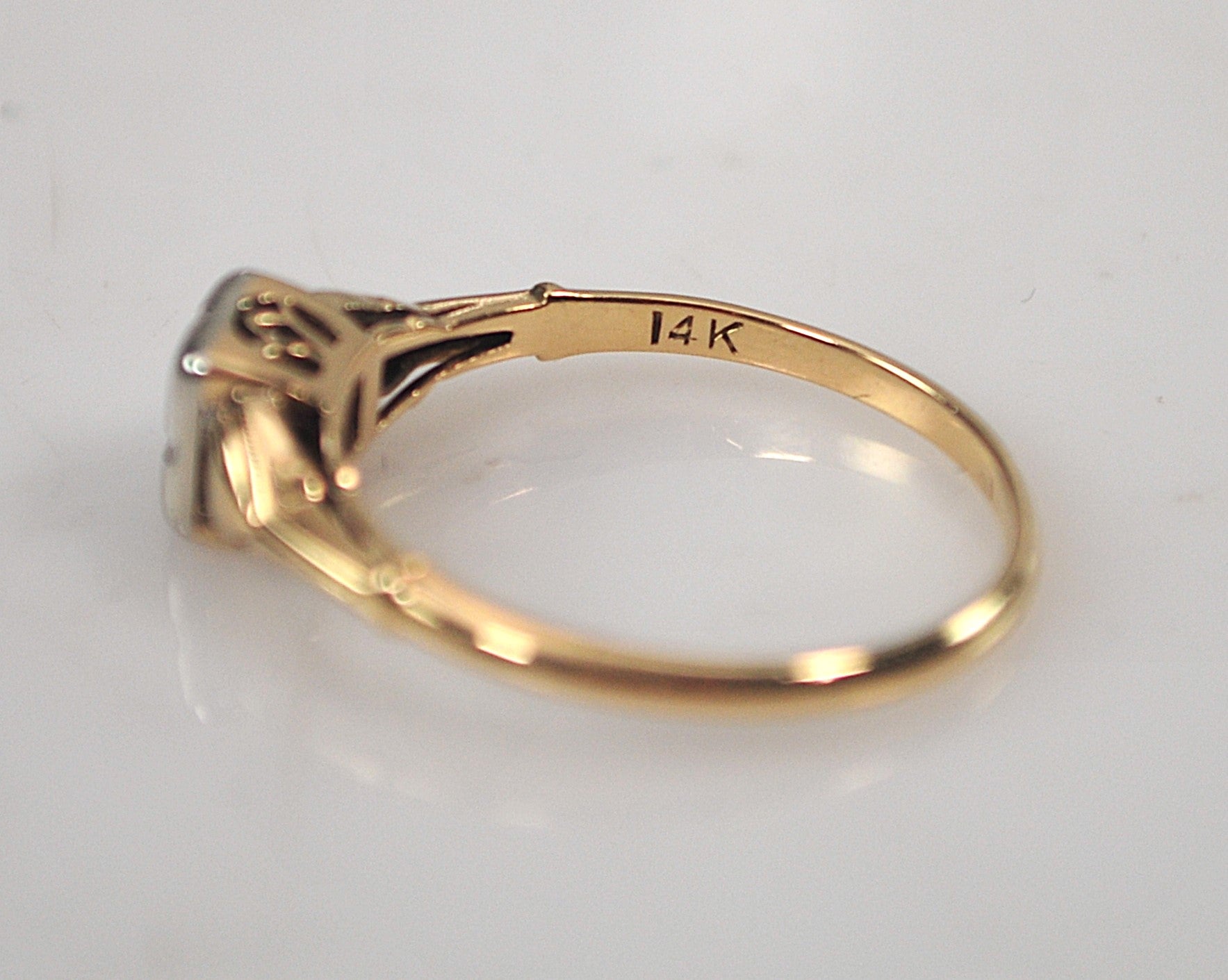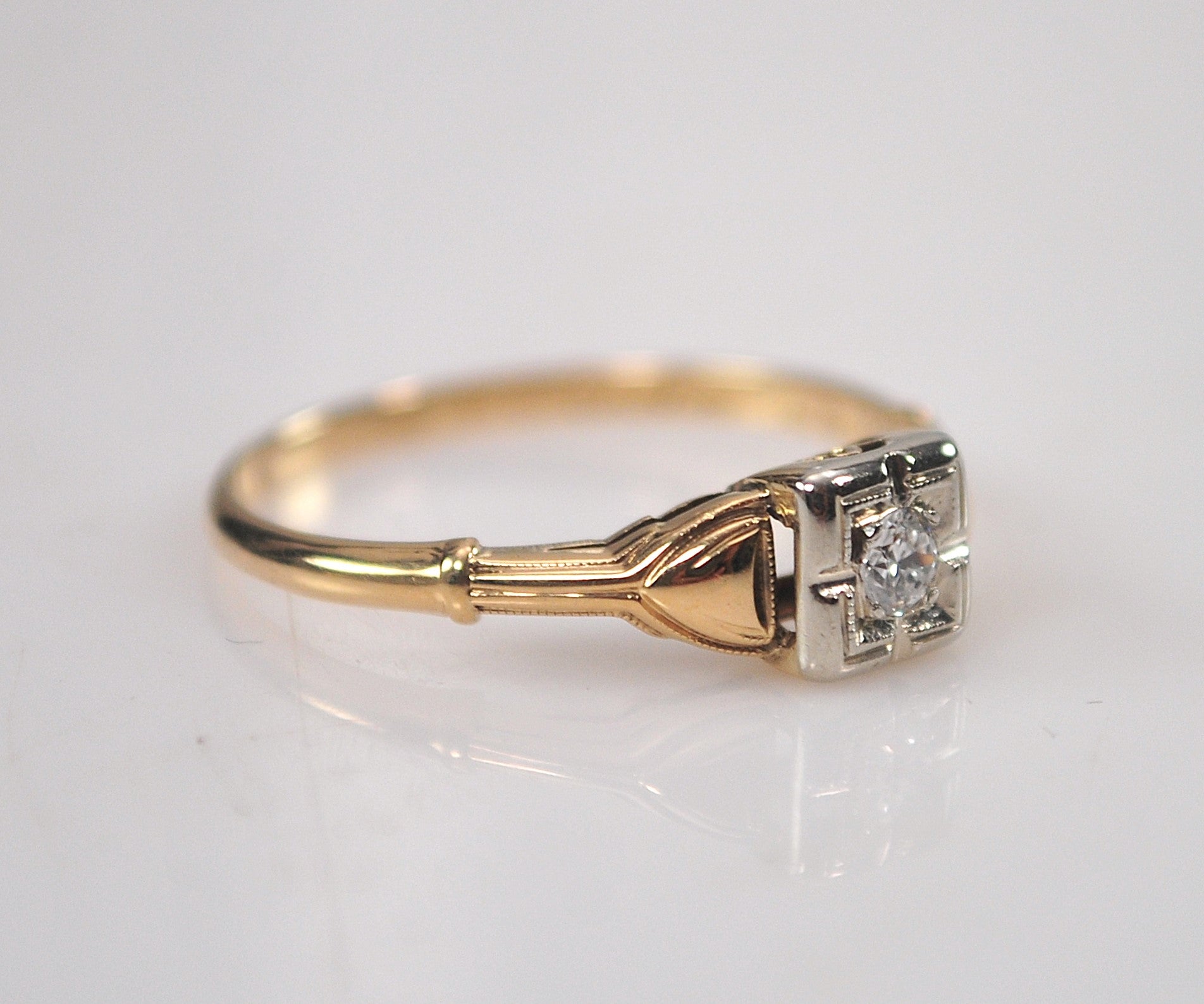 Vintage yellow gold ring is marked 14K and features a round Diamond, approximately .05ct, in a square setting.