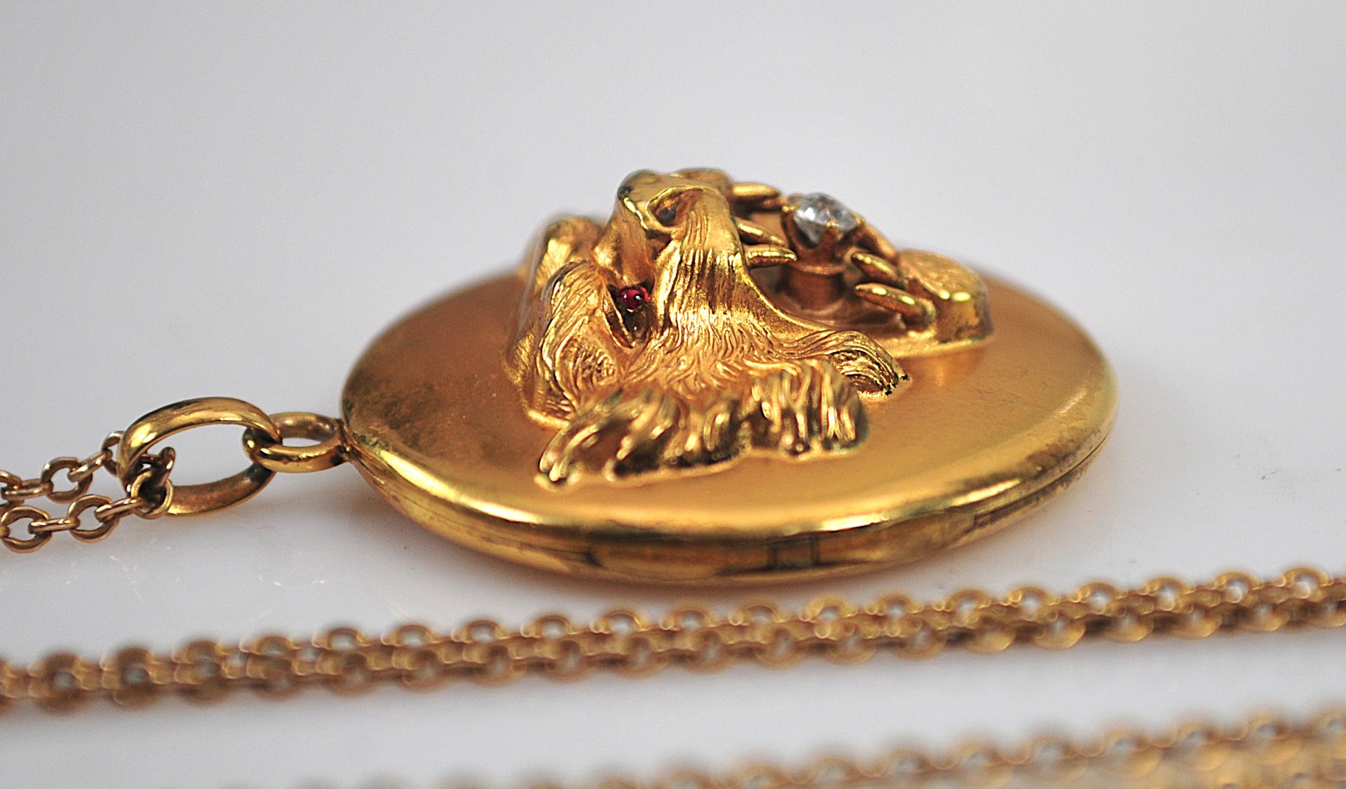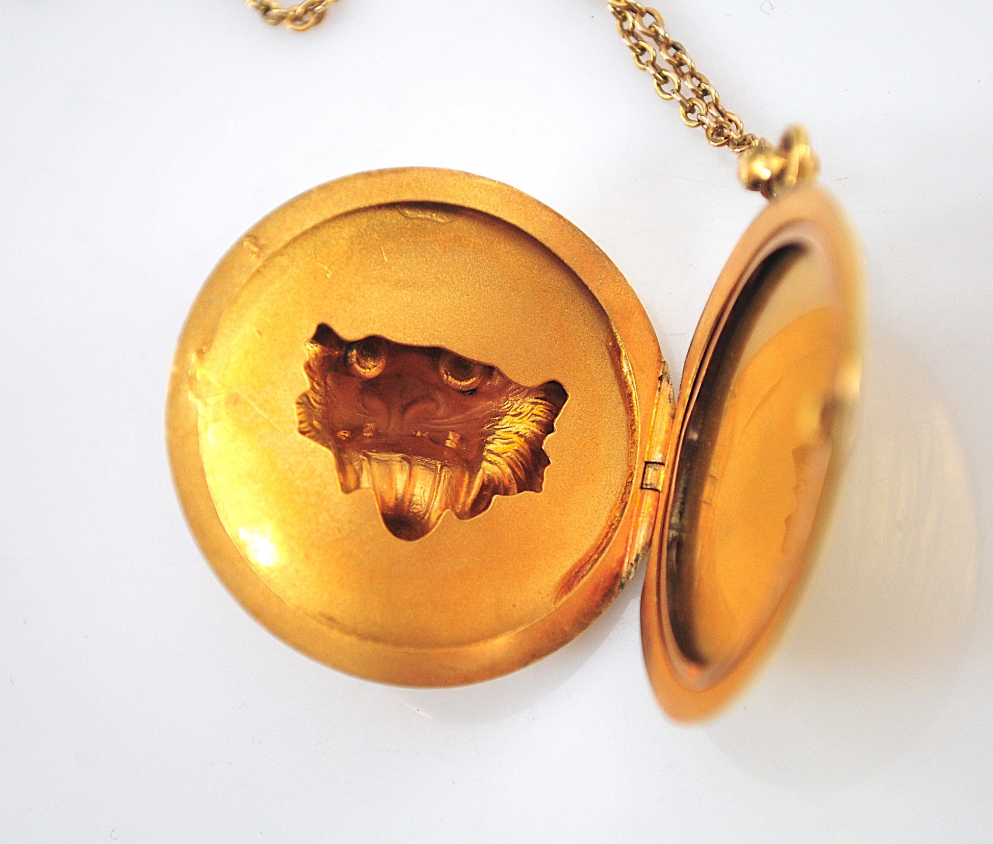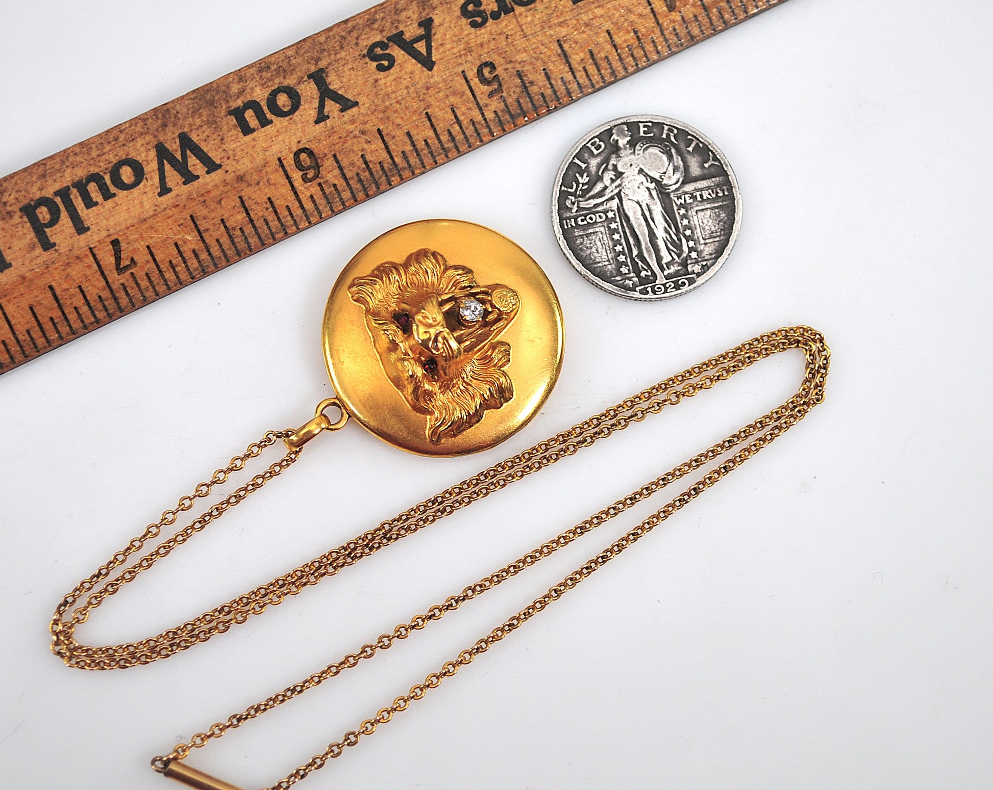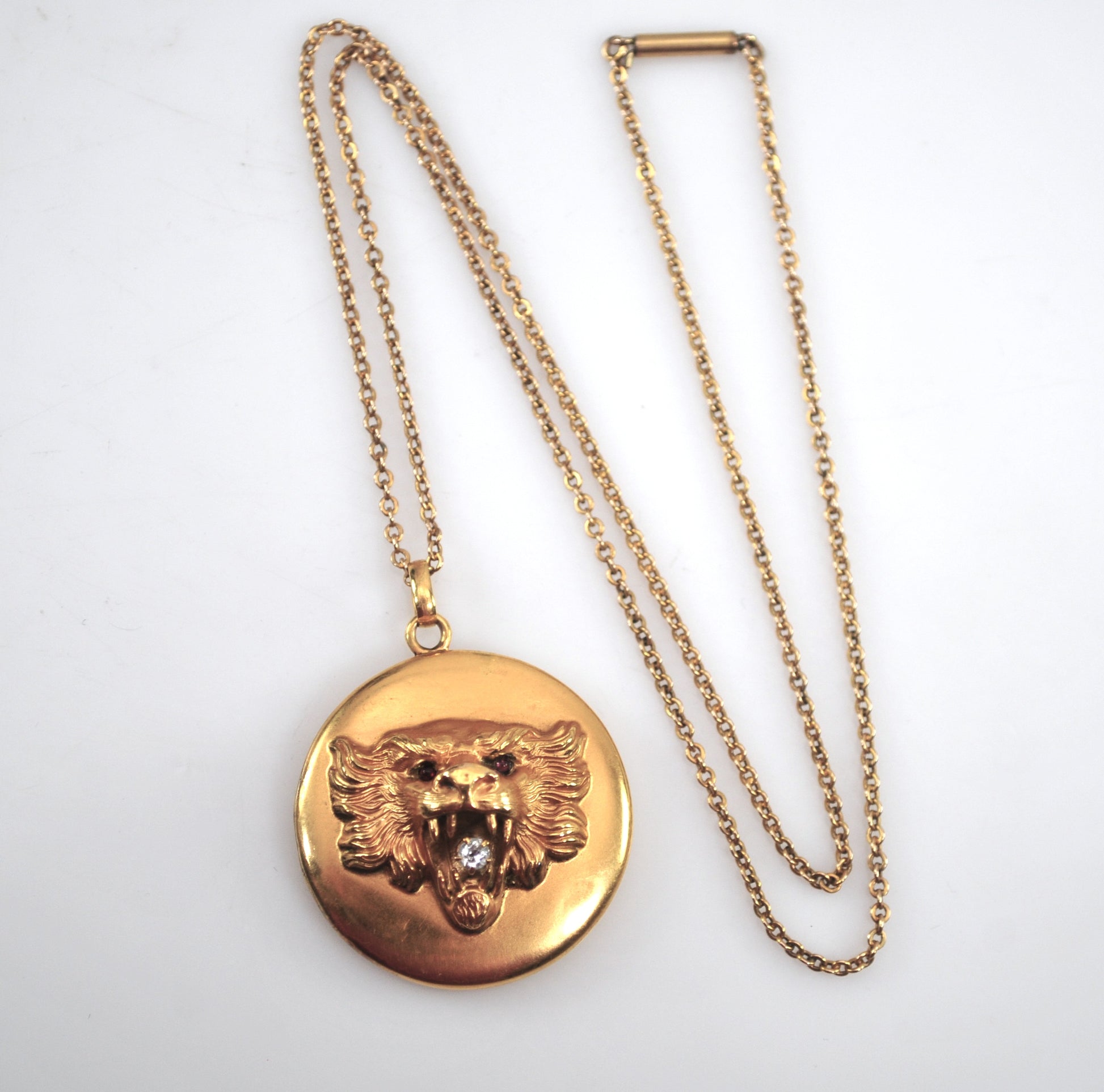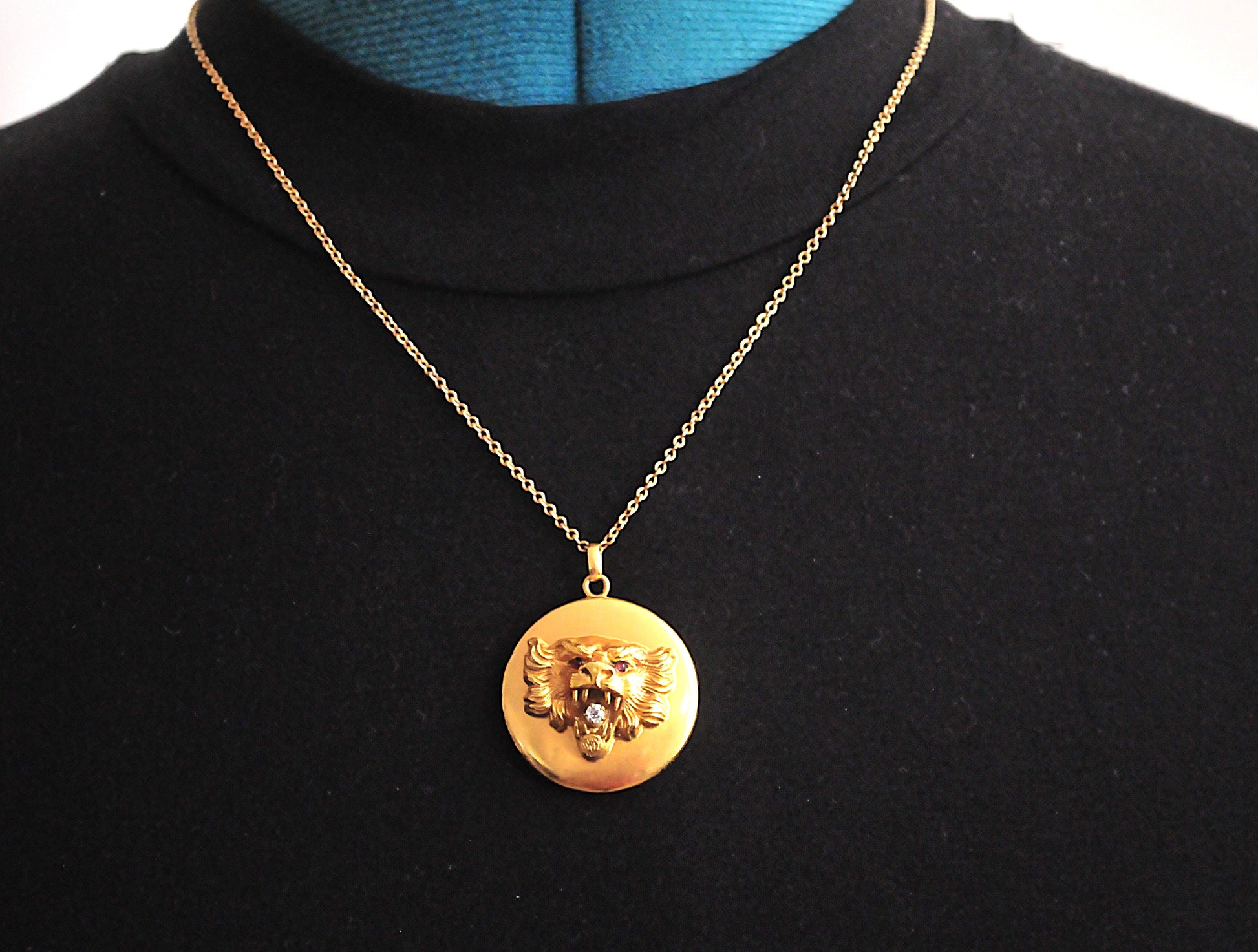 Antique Gold Diamond Ruby Lion Head Locket Necklace