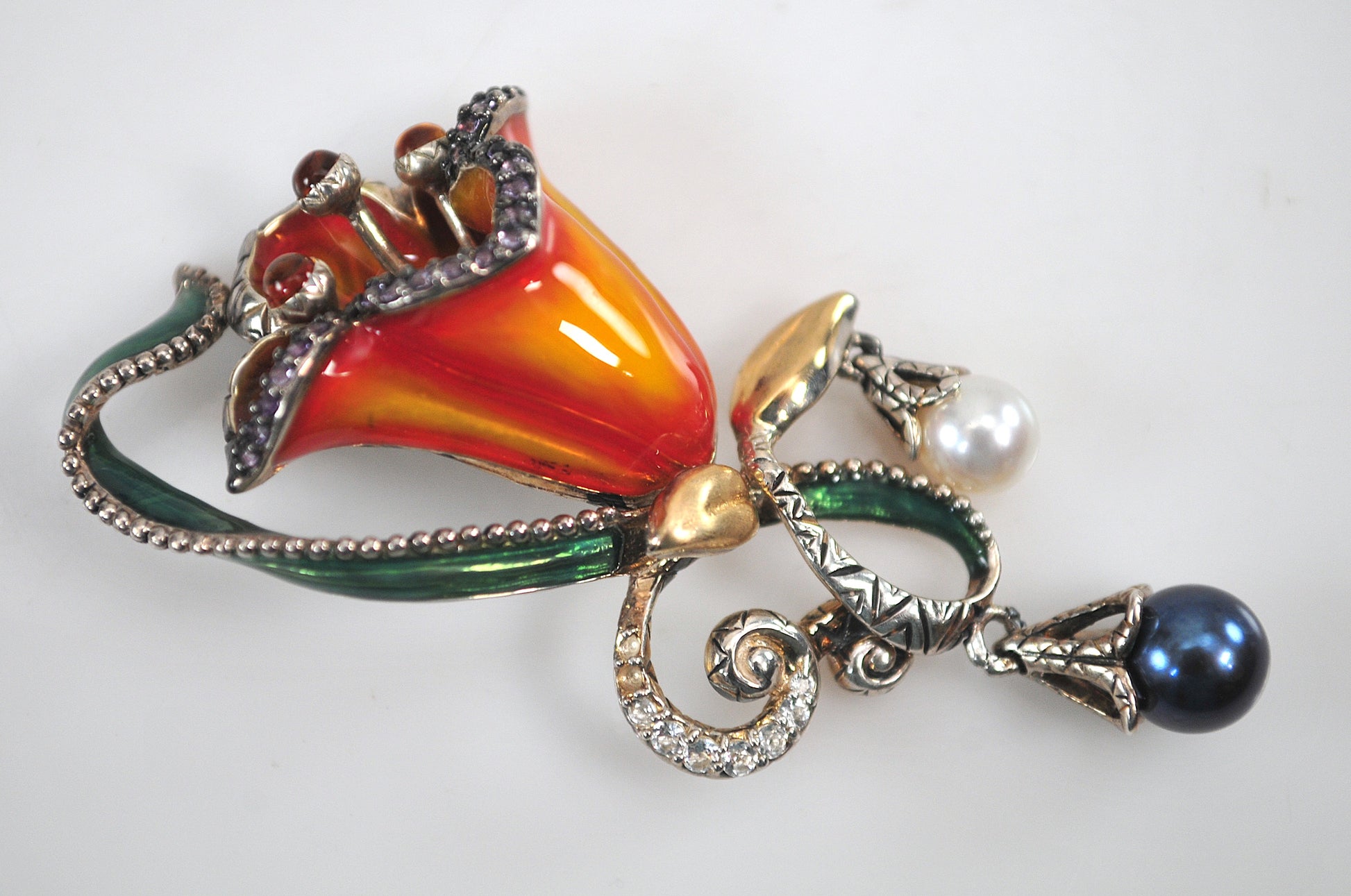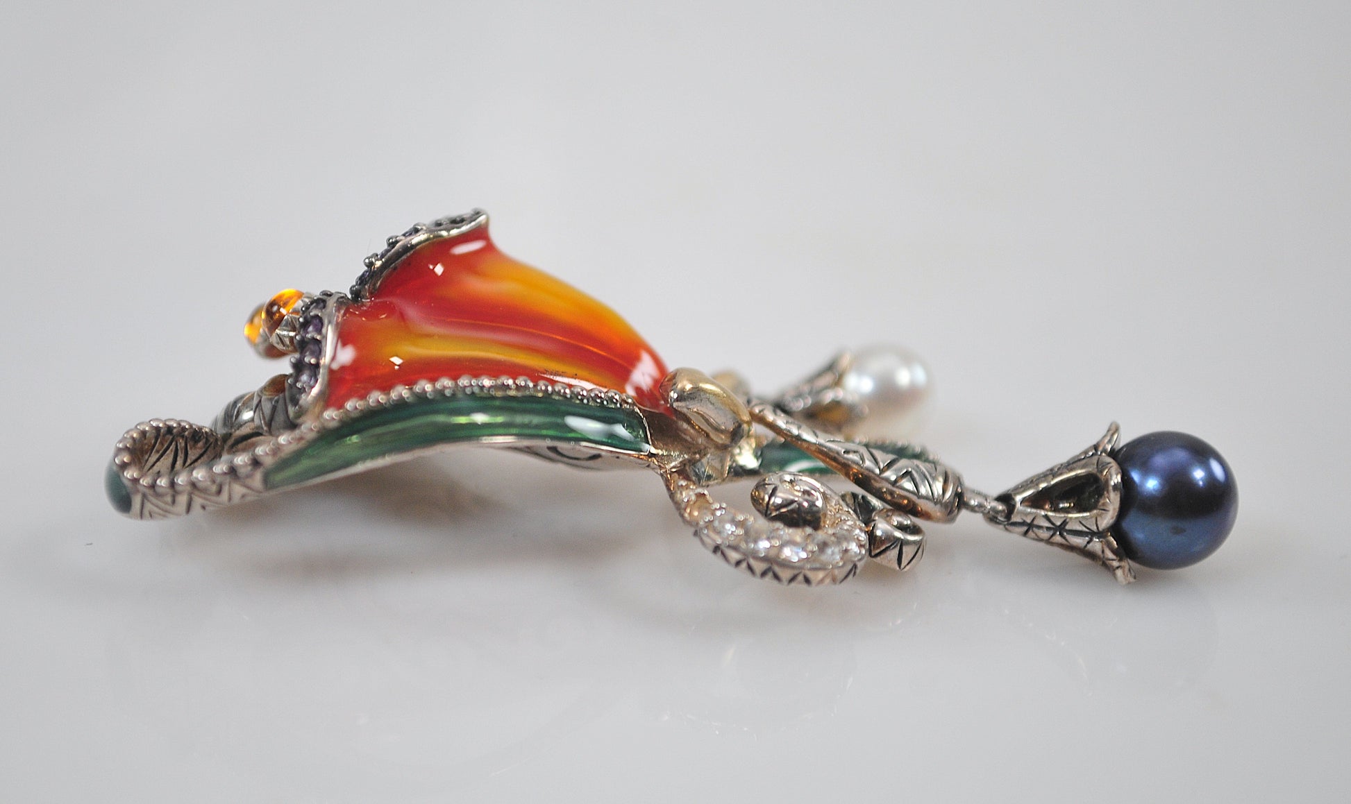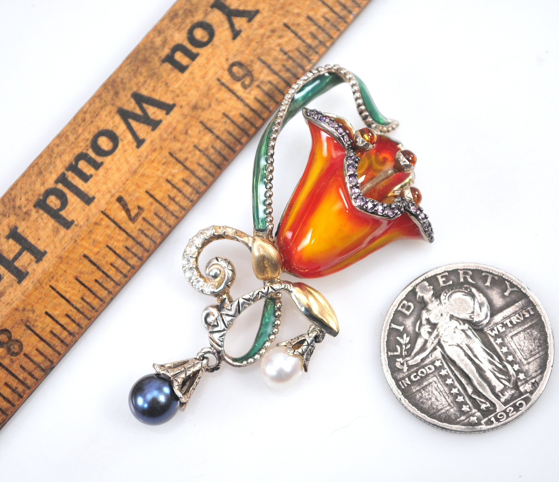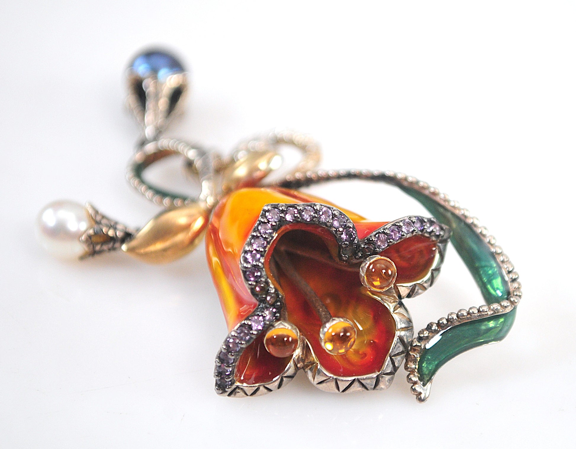 This pendant is missing two White Topaz stones on the left hand swirl closest to the flower base. This can be seen best in photo 2. Ornate designer mixed metal and orange, yellow and green enamel Lily flower enhancer pendant is hallmarked Bixby 925 18K Thailand. It features three Citrine cabochons on the stamens and small Amethysts rimming the top of the flower, a black and a white freshwater Pearl, and White Topaz accents.