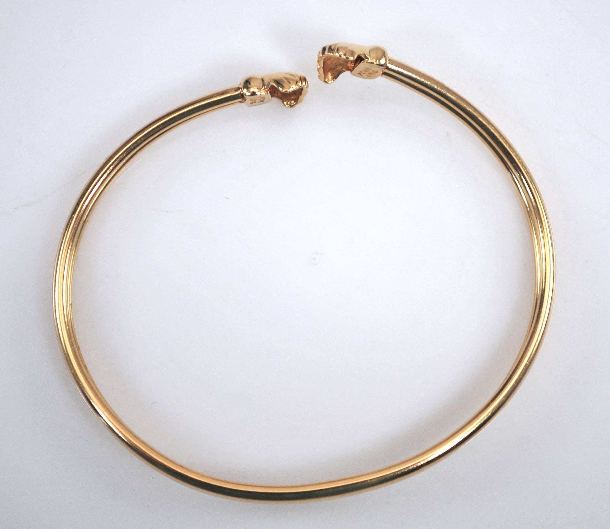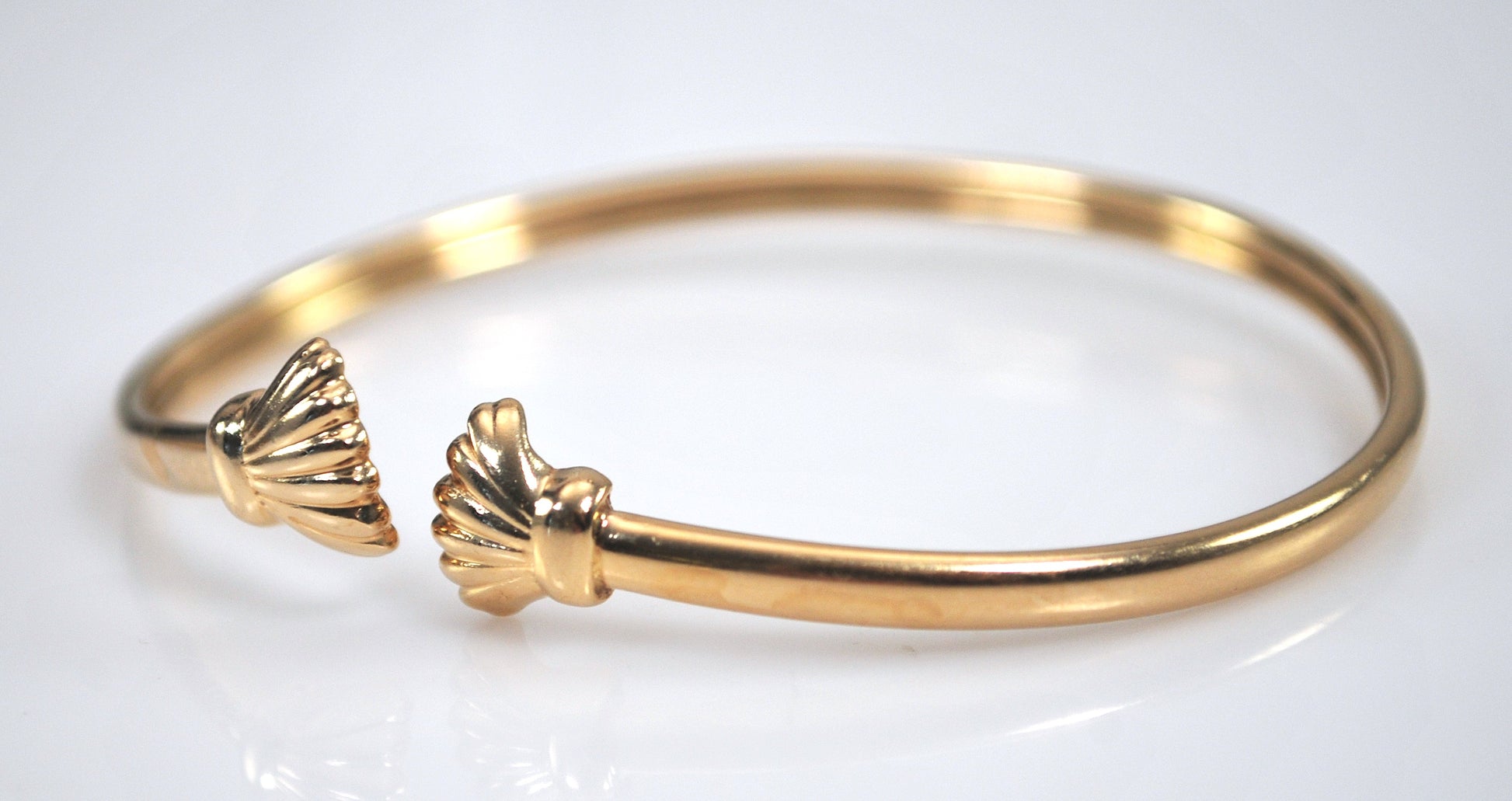 This bracelet has a ding at the top on one side as can be seen best in the first two photos which were taken in lighting to enhance the flaw. Michael Anthony 14K yellow gold bracelet is hallmarked and features a seashell motif at the ends. This is a small wrist bracelet