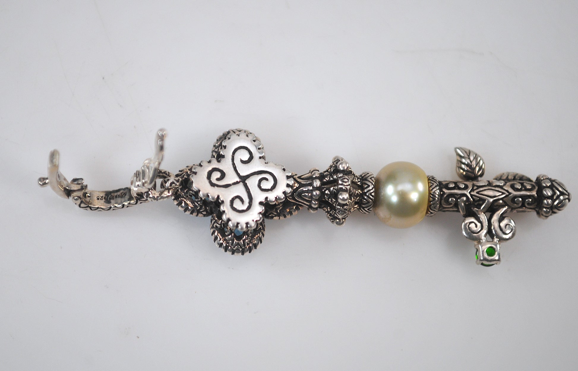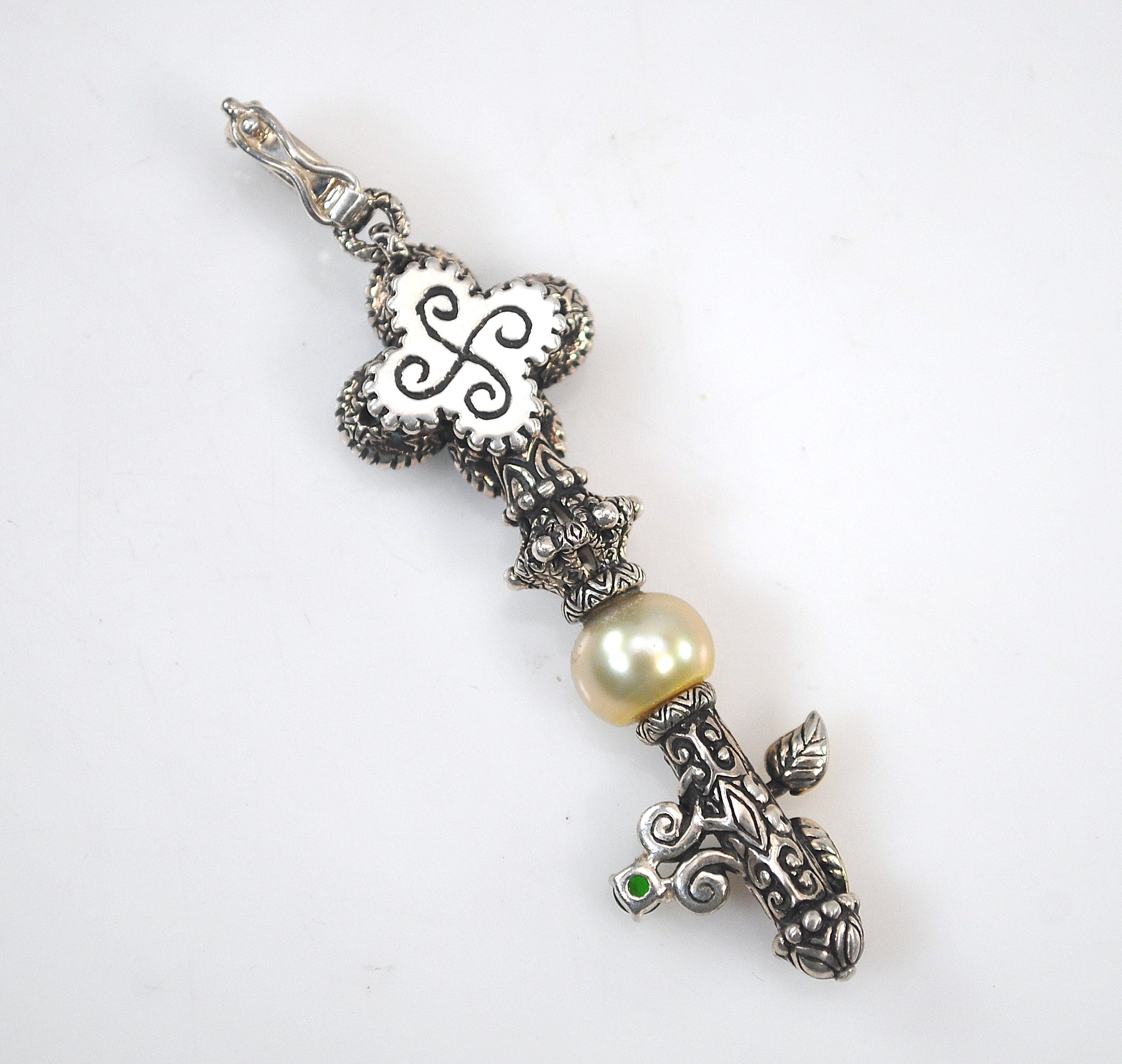 Large ornate designer mixed metal Key enhancer pendant is signed Bixby 925 18K China and features a Blue Topaz floral design with White Topaz center and a Pearl and Peridot with 18K gold leaf enhancements.