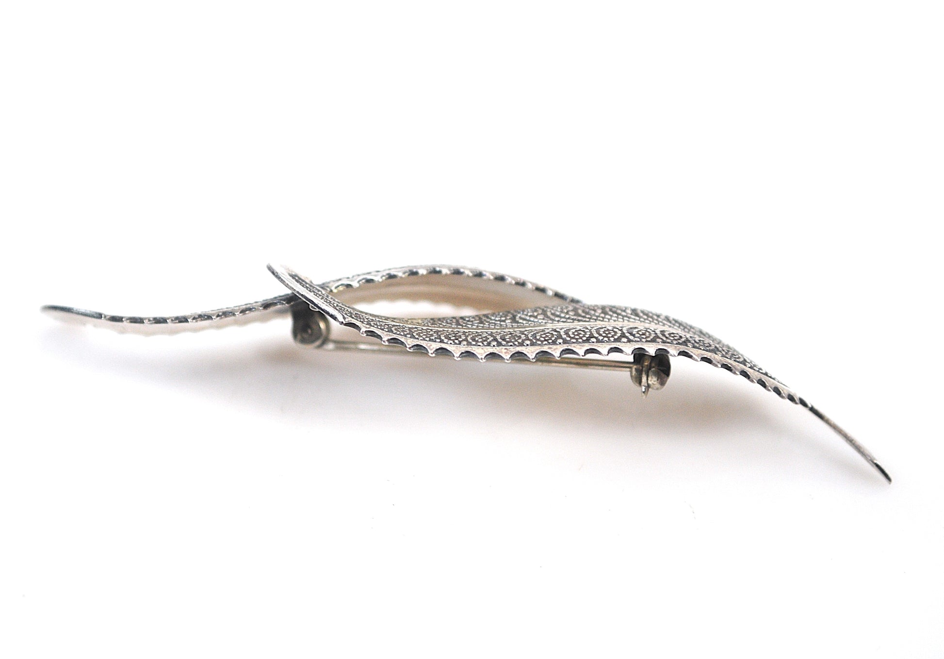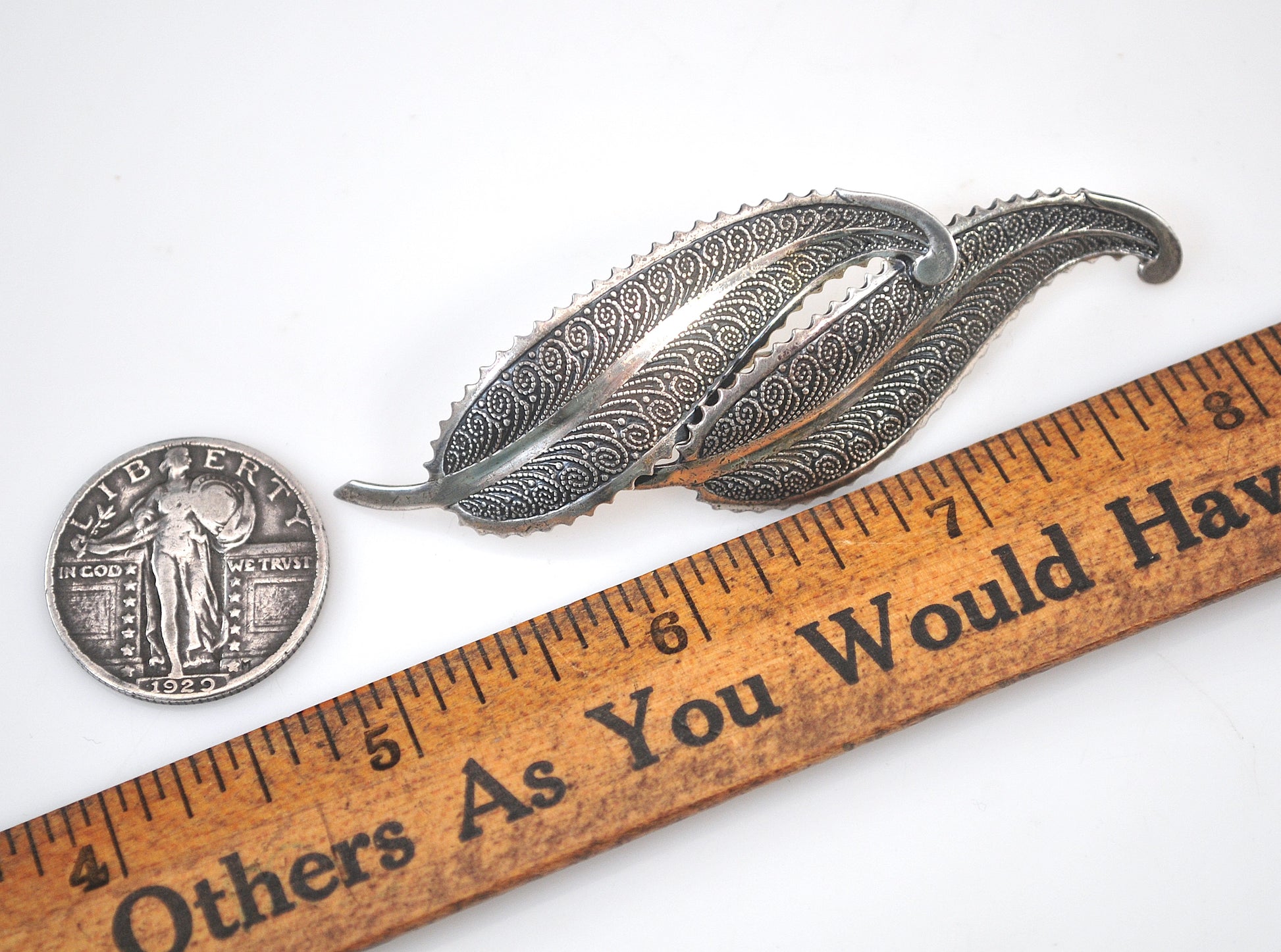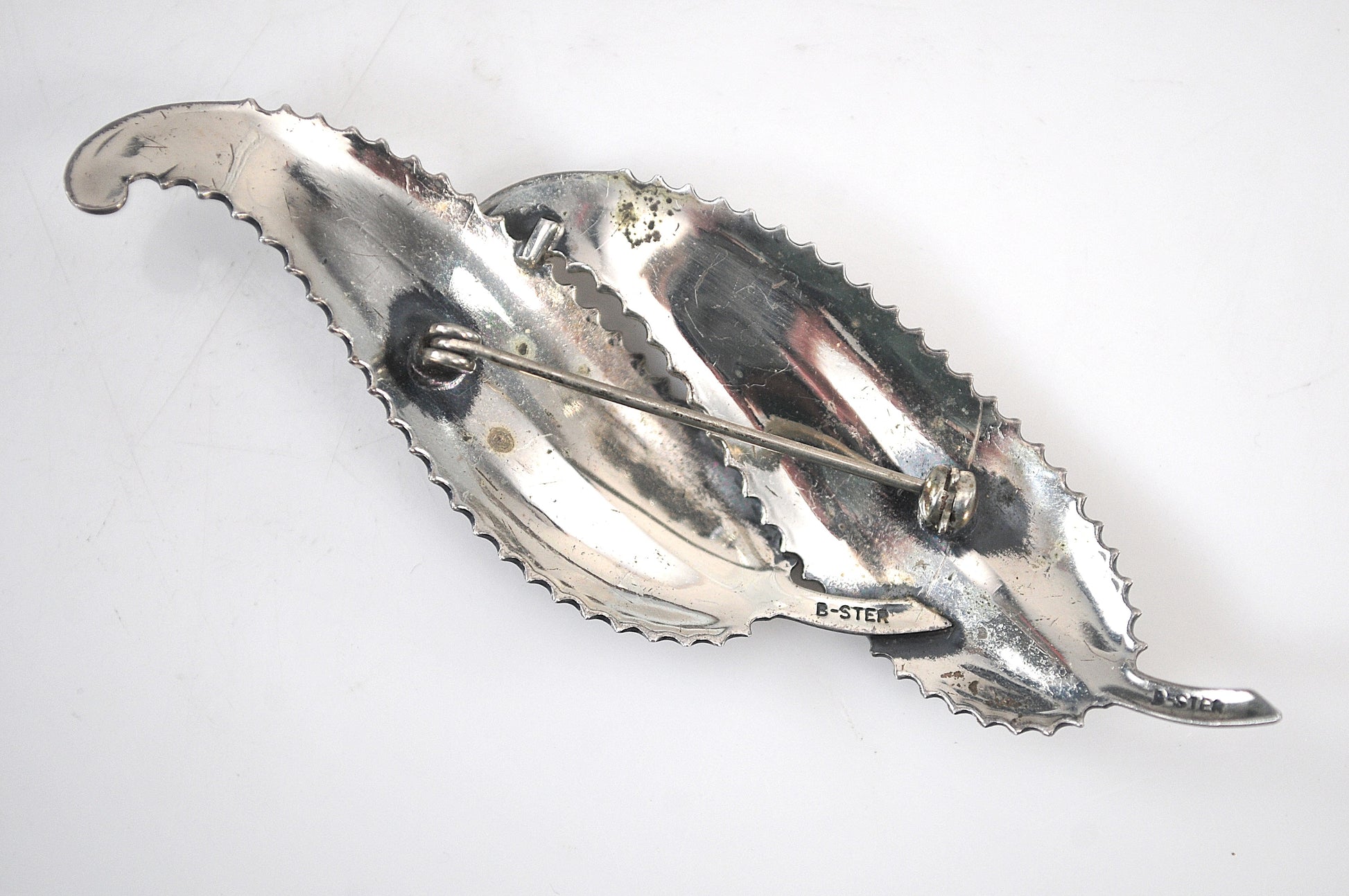 Vintage Mid-Century Modern sterling silver filagree double leaf brooch is signed B-STER.