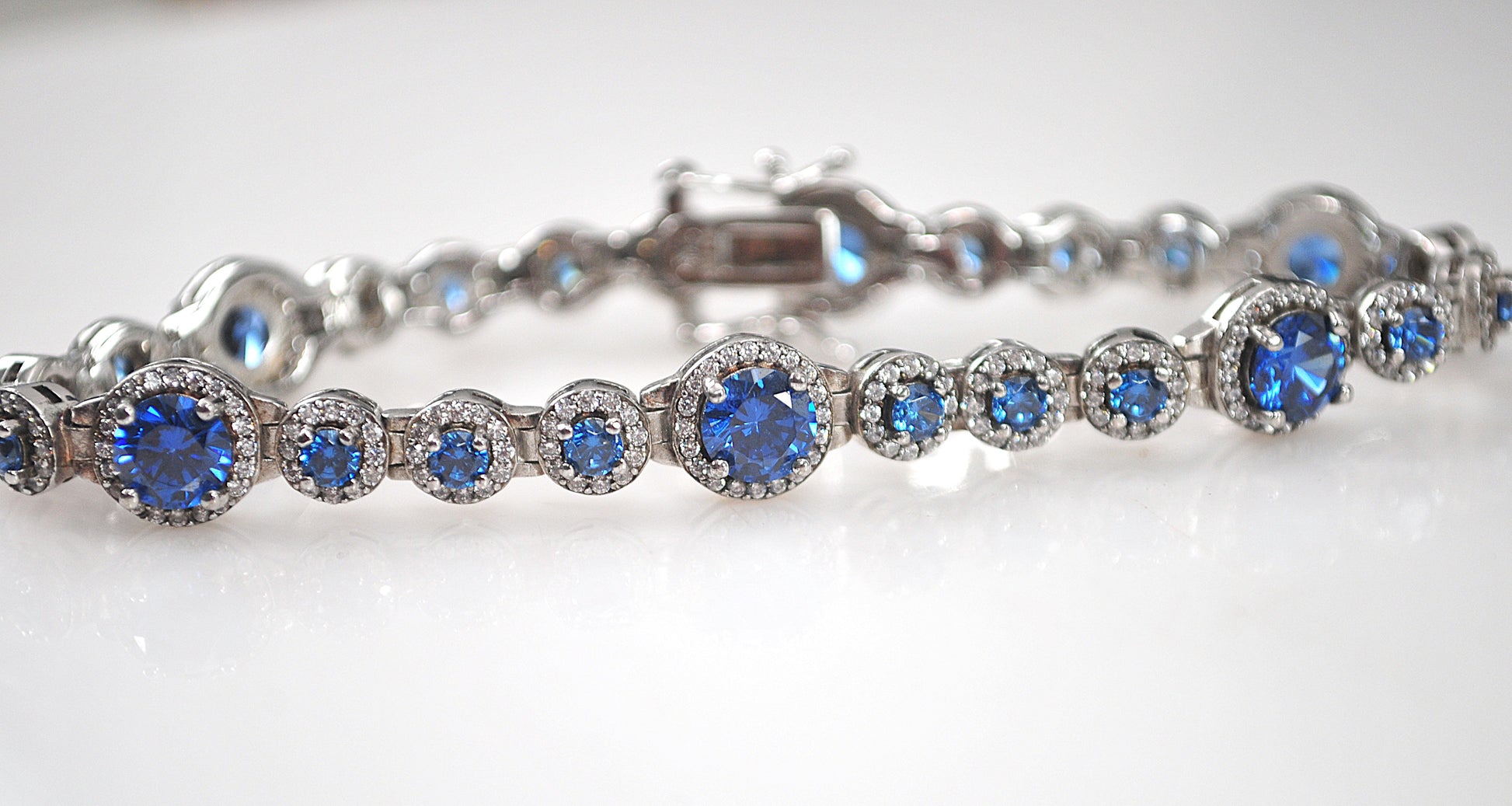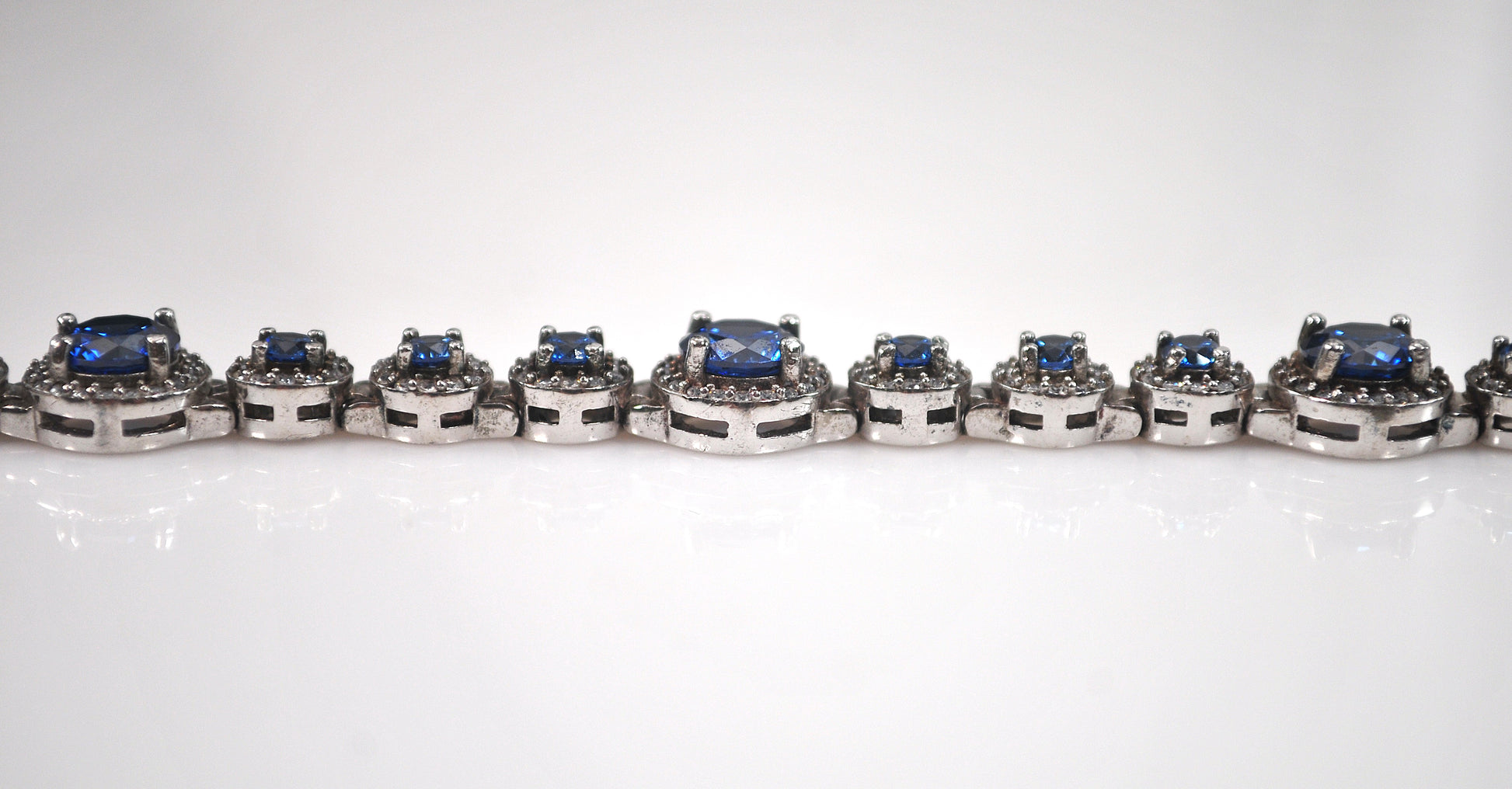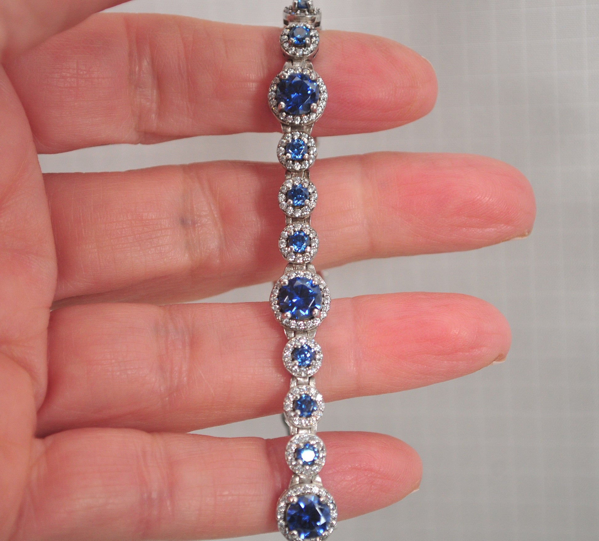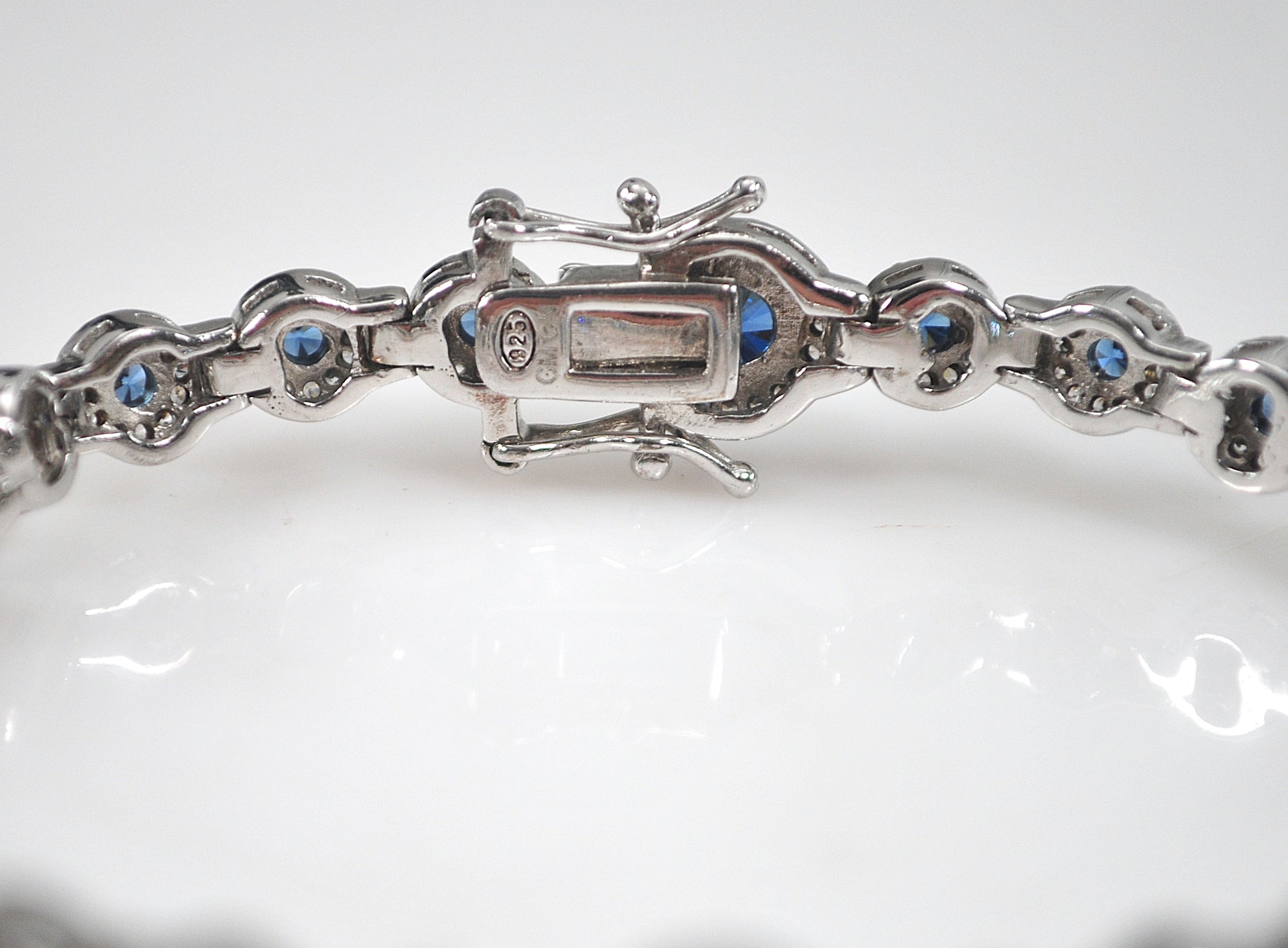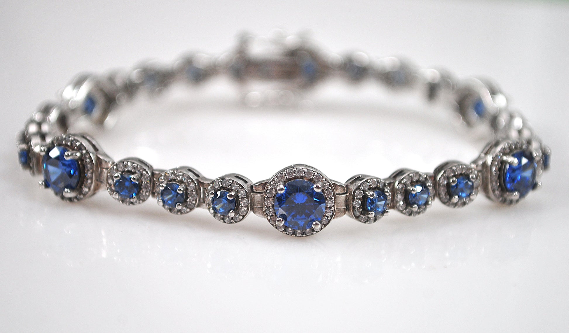 Designer sparkly sterling silver tennis bracelet is signed 925 GM CN and features round blue CZ's surrounded by small round clear CZ's.