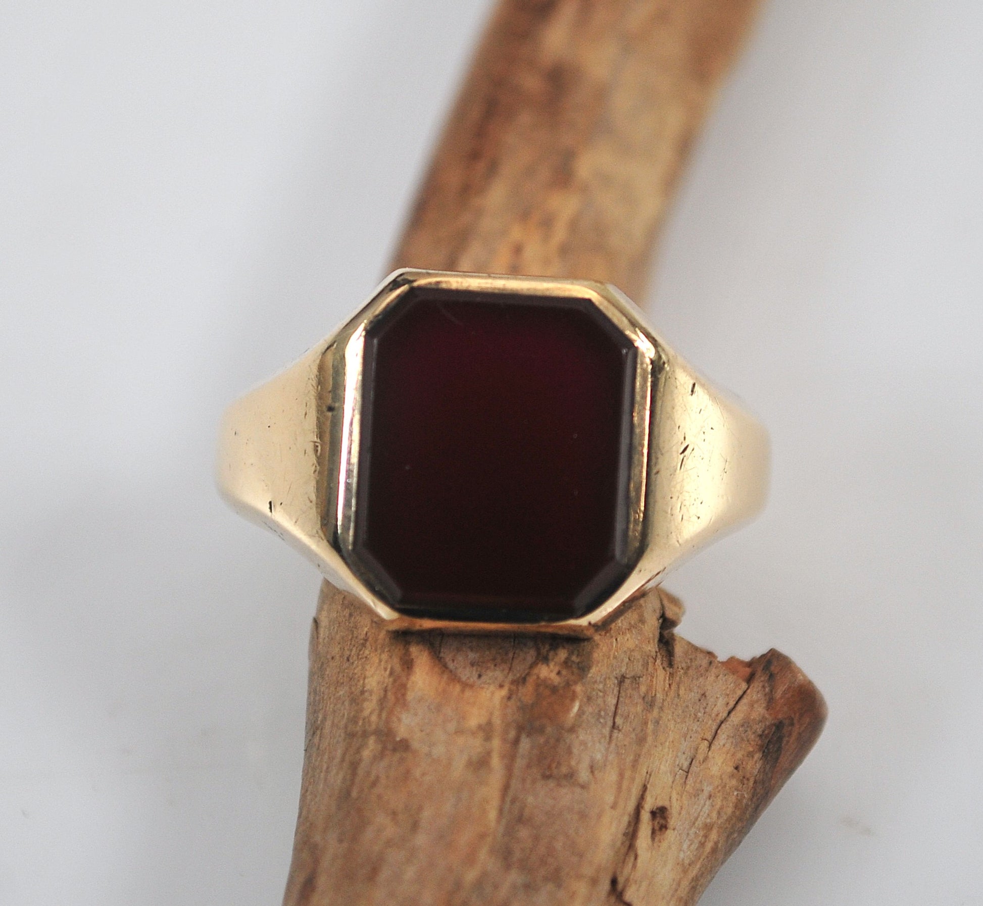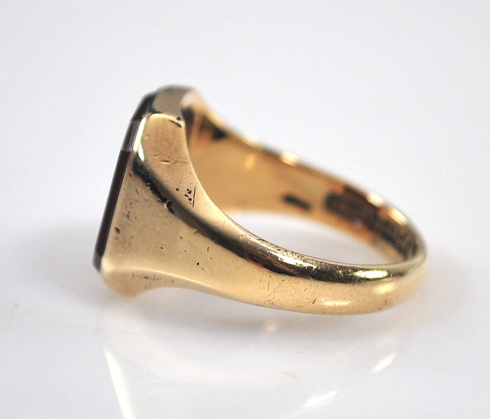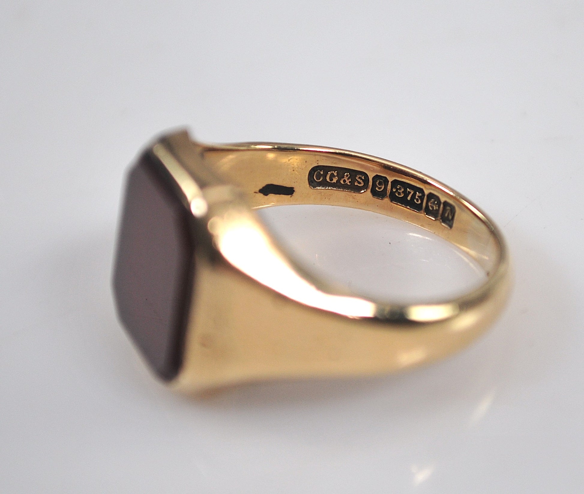 Although this ring shows wear as can be seen in the photos, keep in mind the photos are magnified so the nicks and scratches look worse in the photos than with regular wearing. Made in Birmingham England 9K yellow gold Carnelian ring is signed CG&S 9 375 N and an anchor, and inscribed WT.