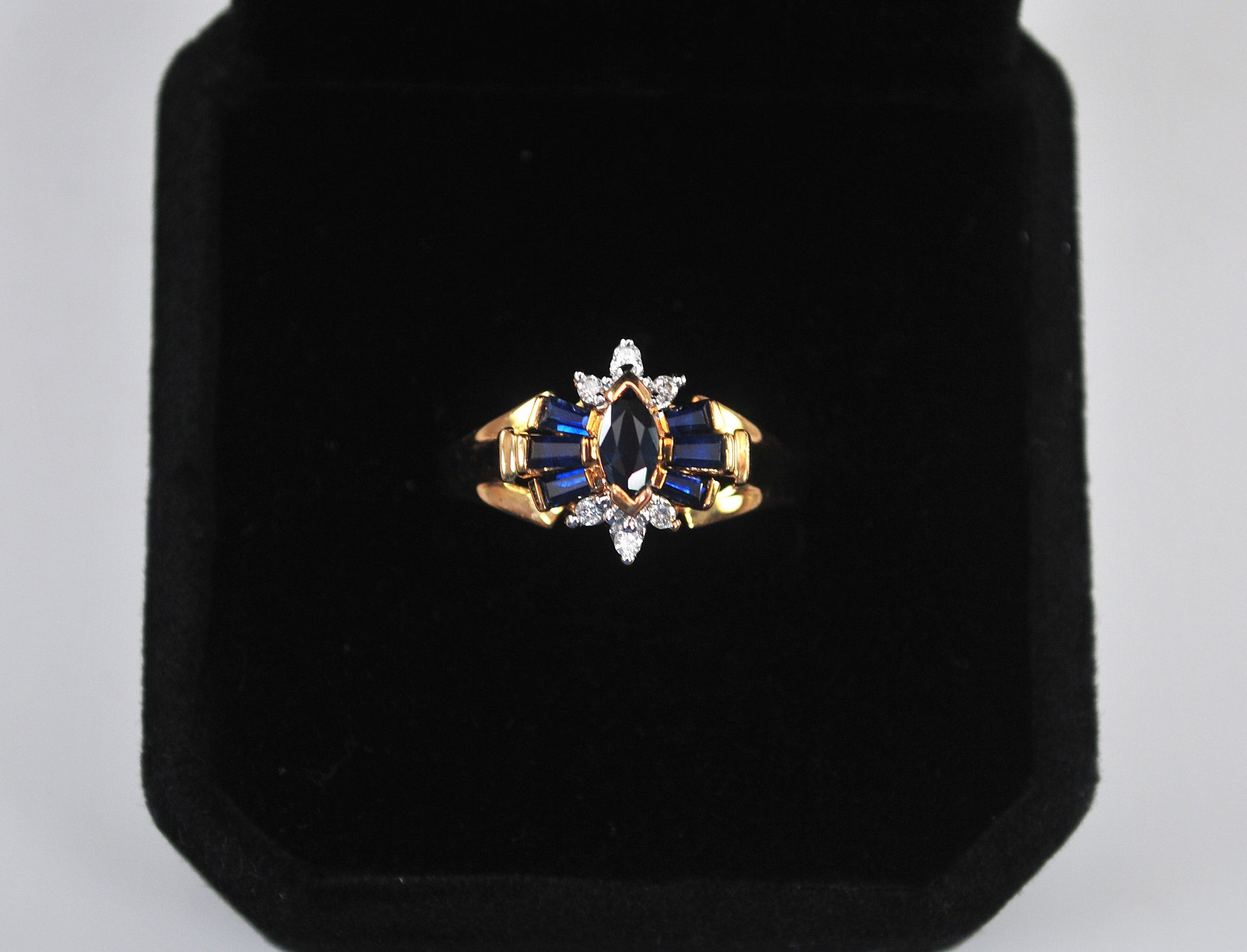 Pretty and sparkly Town and Country 10K yellow gold genuine Sapphire and Diamond ring is signed 10K T&C and features six Sapphire baguettes and six small Diamonds around a marquise Sapphire.