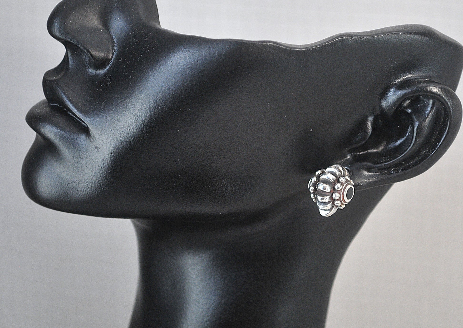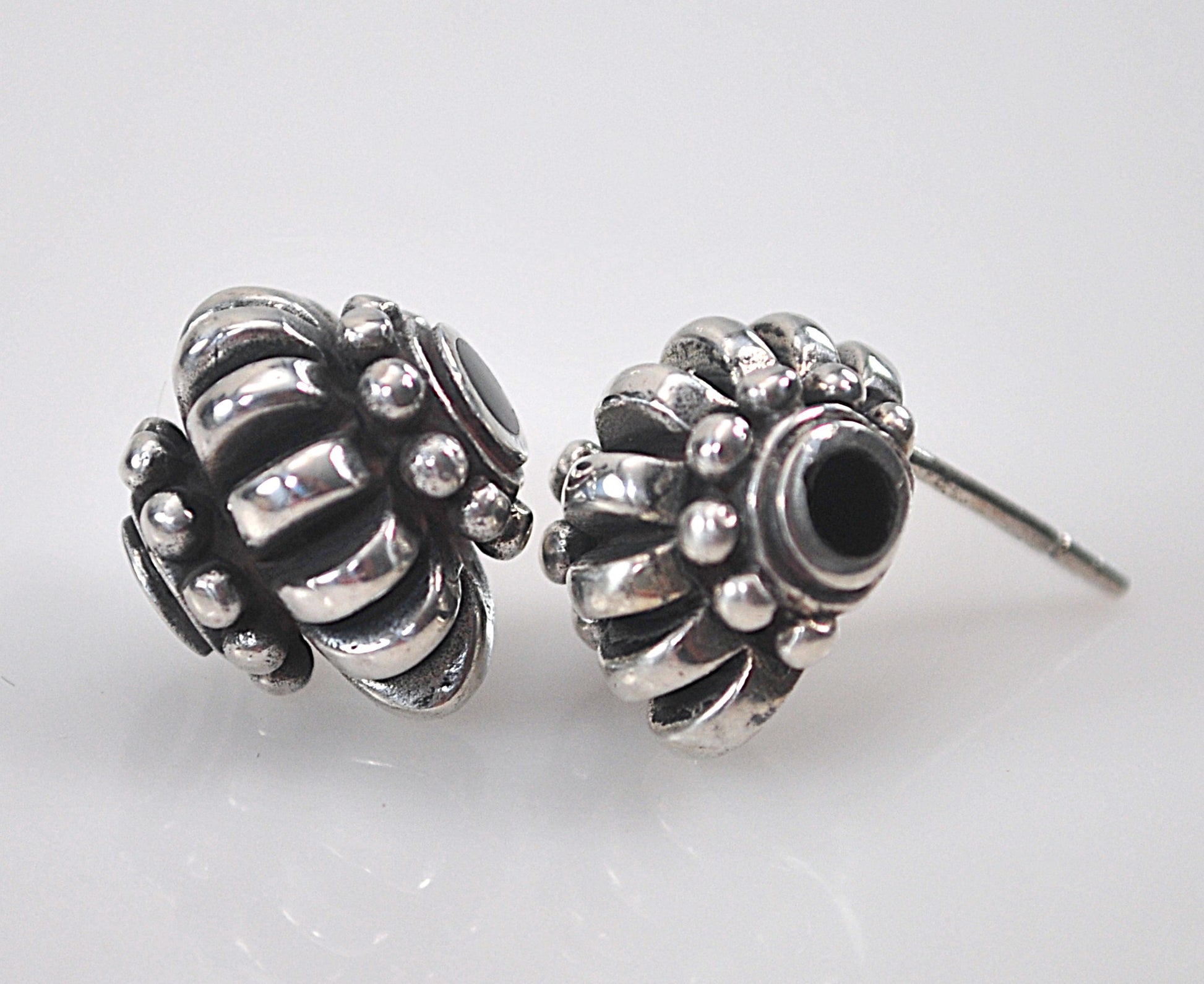 Sterling silver stud earrings are signed NF 925 and feature Black Onyx inlay on the sides. They are heavy for their size and they come with silicone backs.