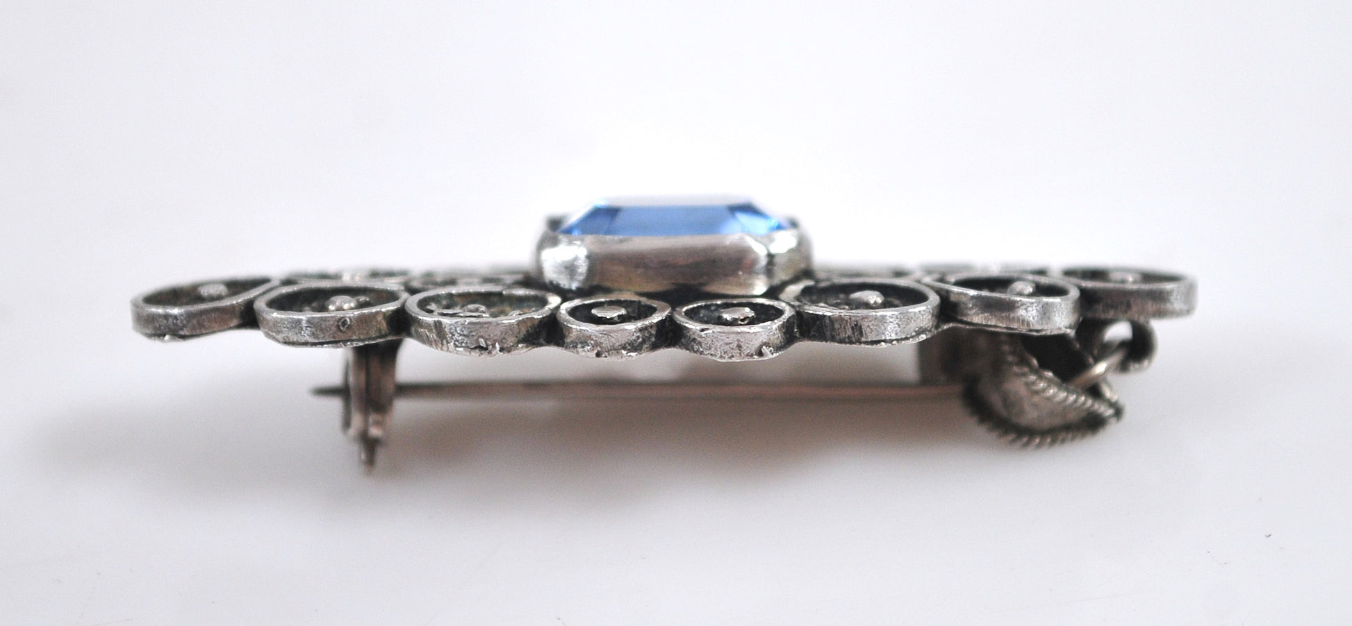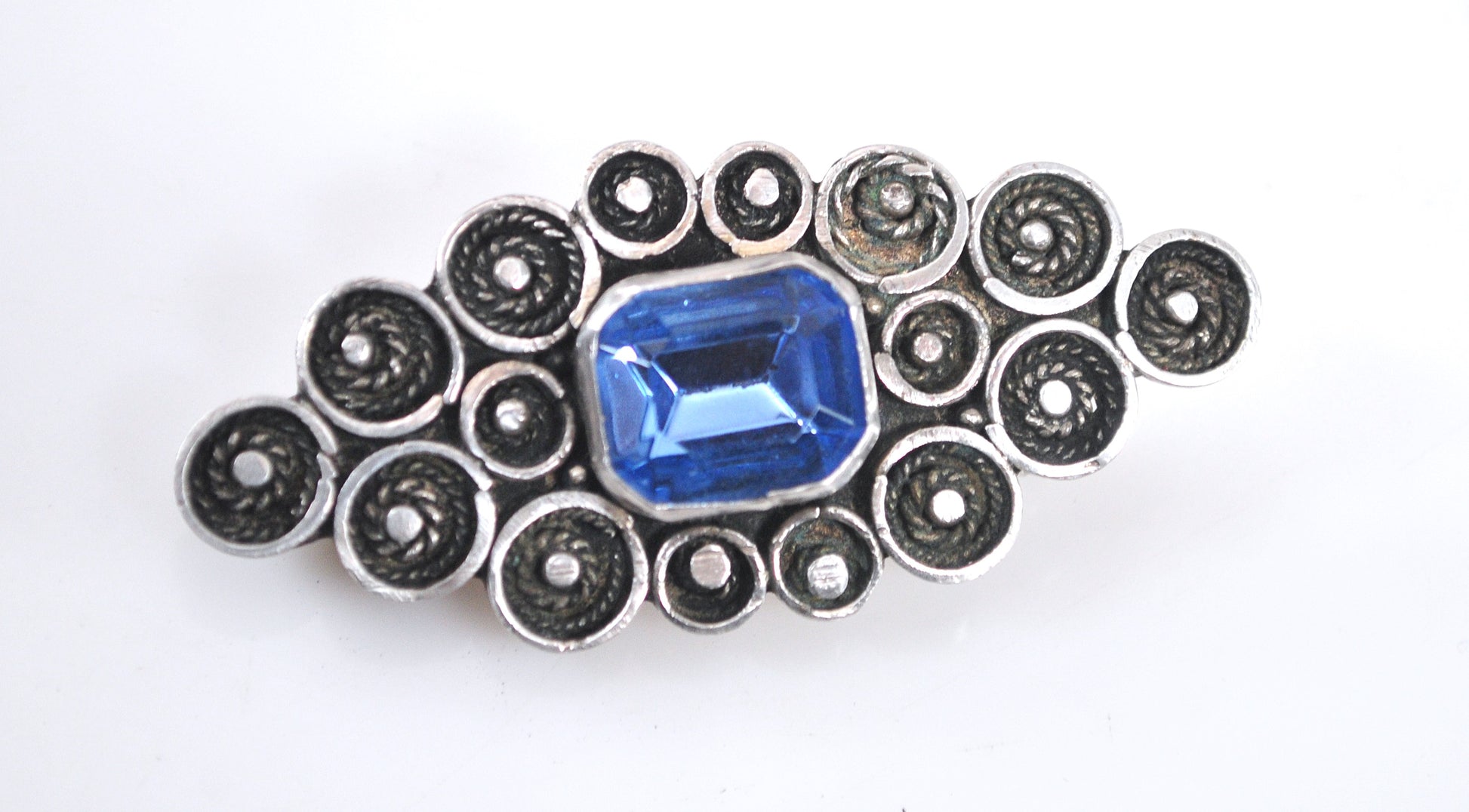 Sterling silver brooch or pendant is signed Jerusalem Israel Sterling Silver and features a blue glass stone.