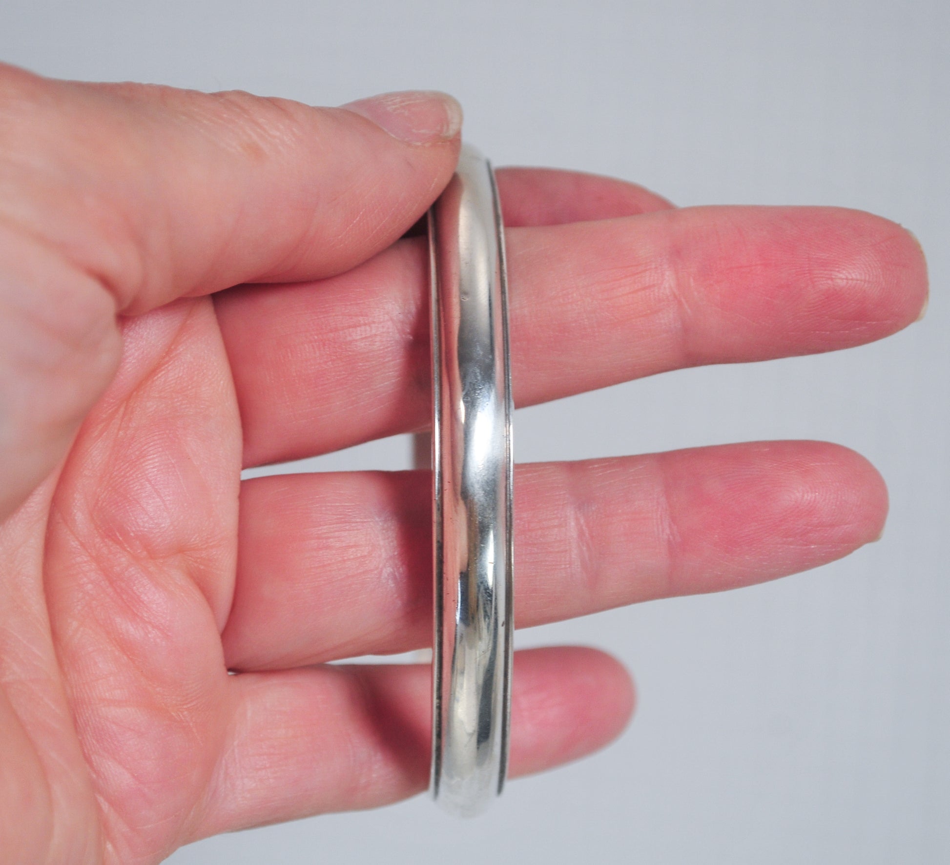 This is a large size bracelet. Heavy handmade sterling silver bangle bracelet from the James Craig silversmith shop in Colonial Williamsburg is signed IC STERLING.