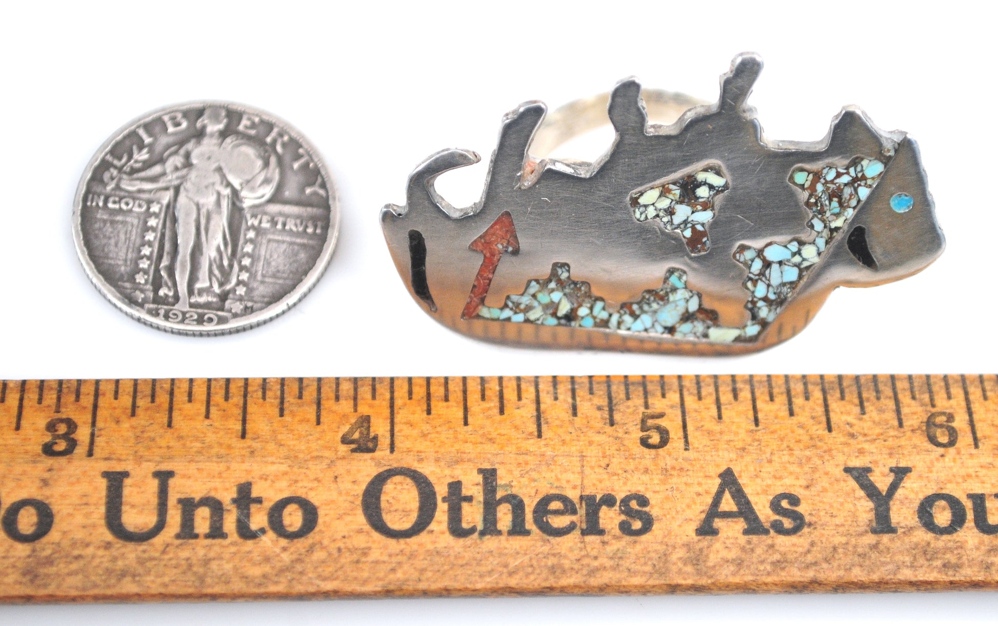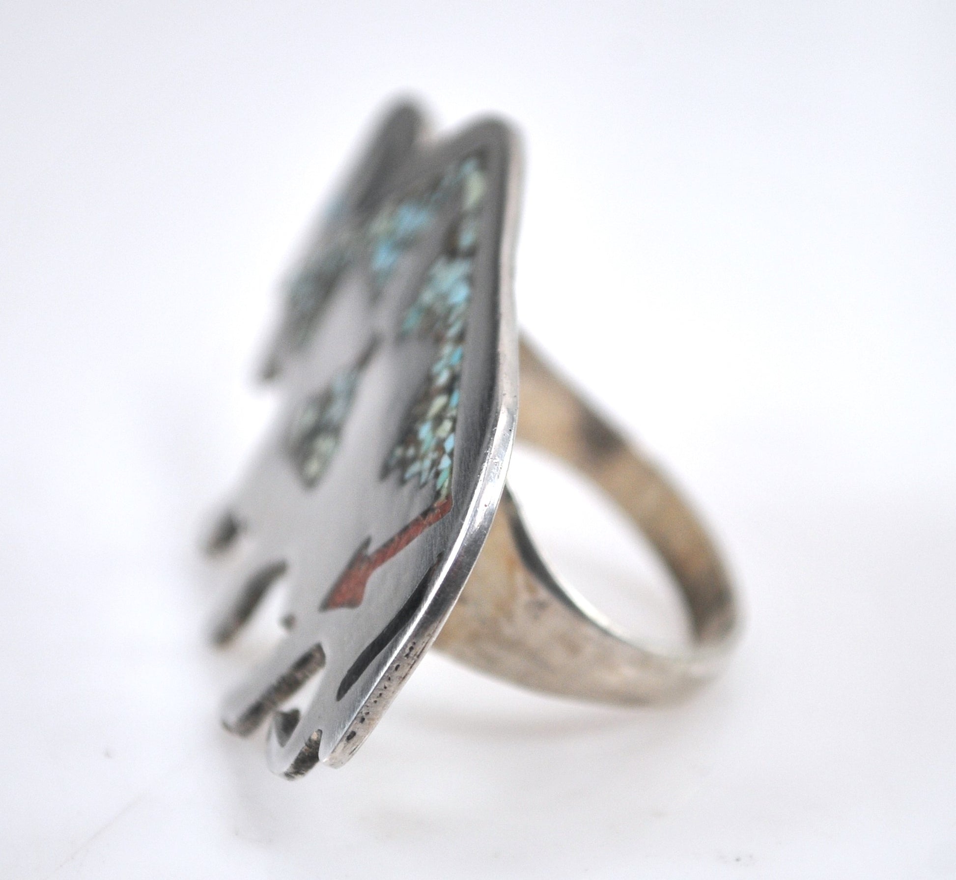 Handmade sterling silver buffalo profile ring is marked sterling and features Turquoise and Coral chip inlay in Southwestern designs.