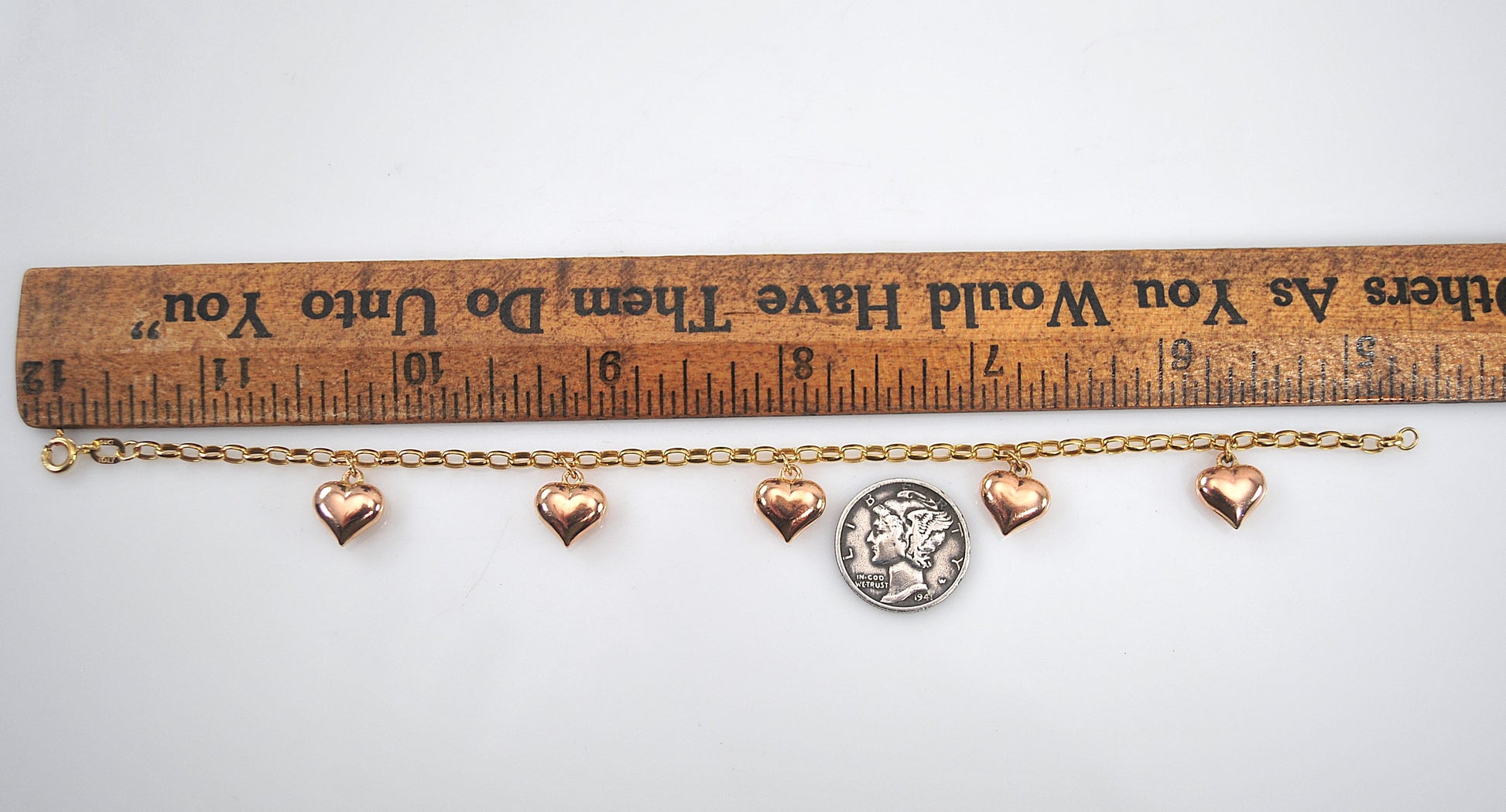 Michael Anthony SMALL WRIST two tone 14K gold bracelet is signed Ma Italy 14K 585 and features a yellow gold rolo bracelet with five rose gold puffed heart charms with all soldered links.