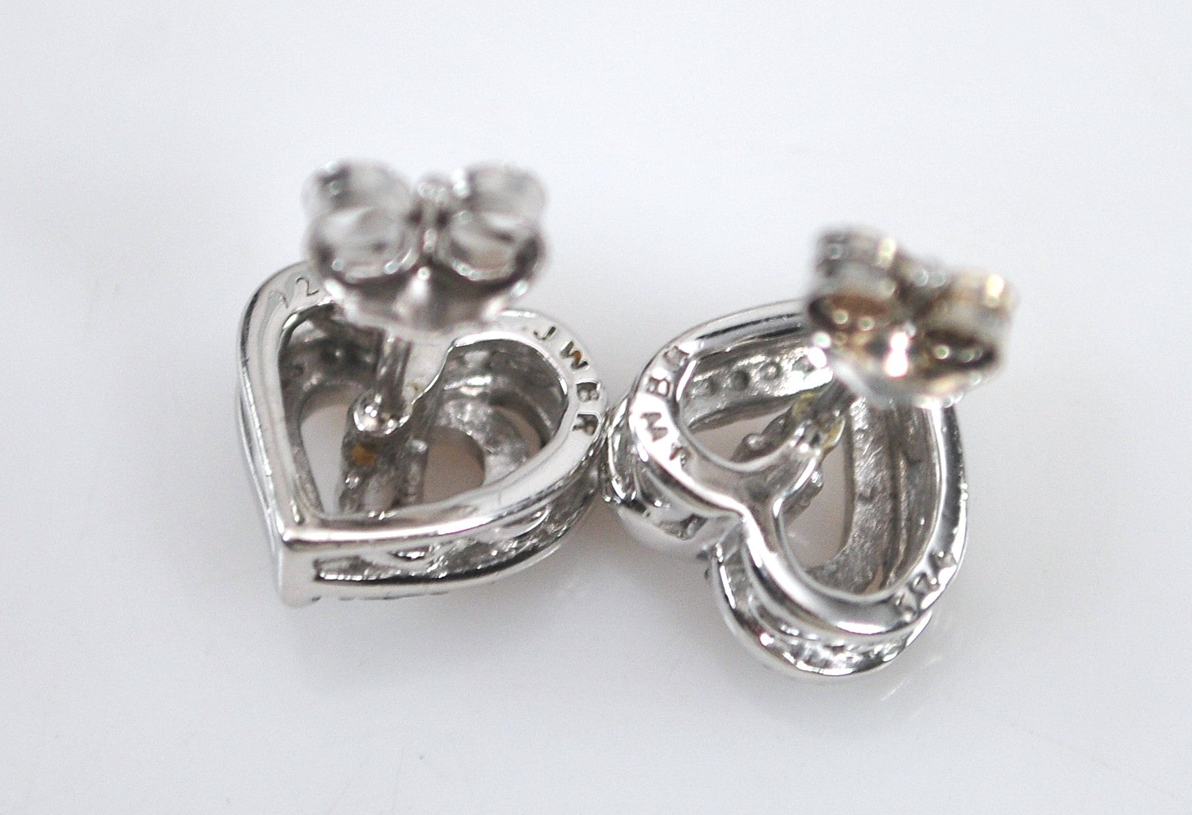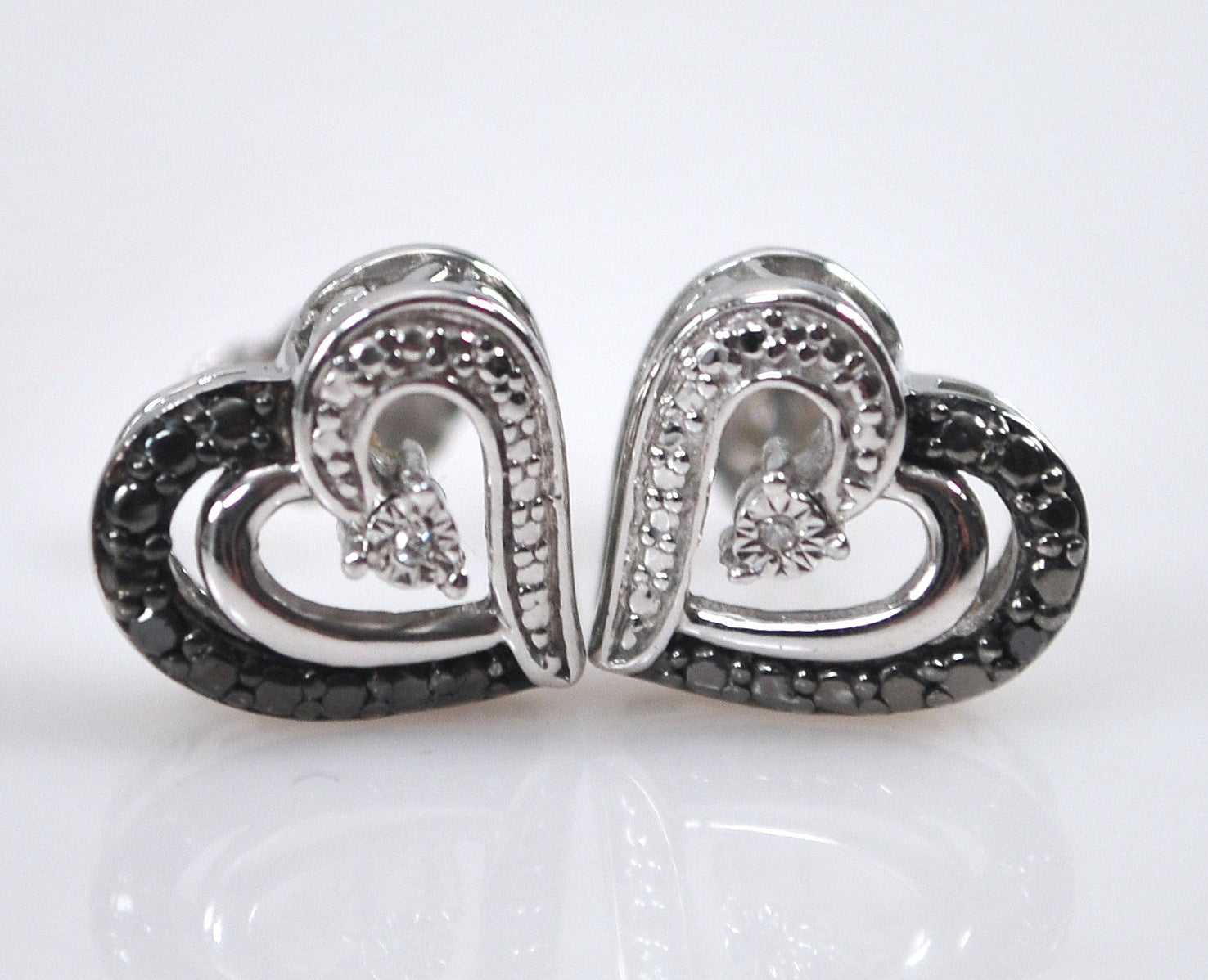 Small sterling silver heart earrings are signed 925 JWBR and feature a black and white genuine Diamond accent in each earring.