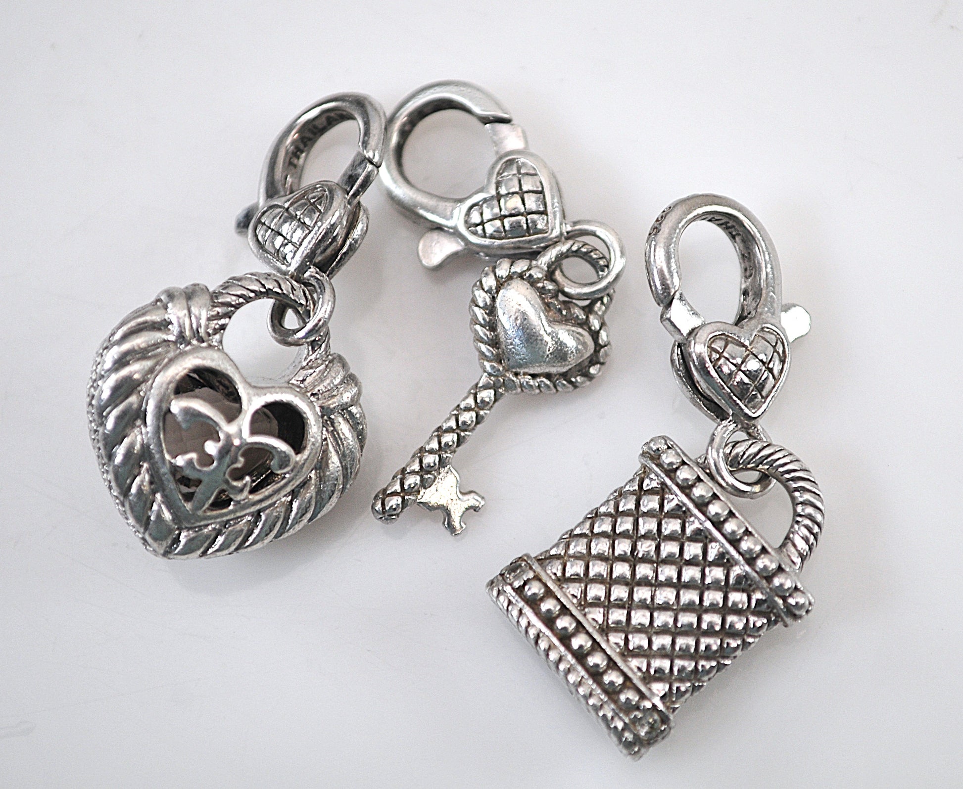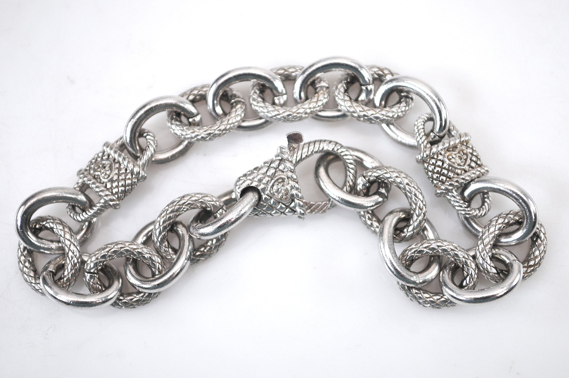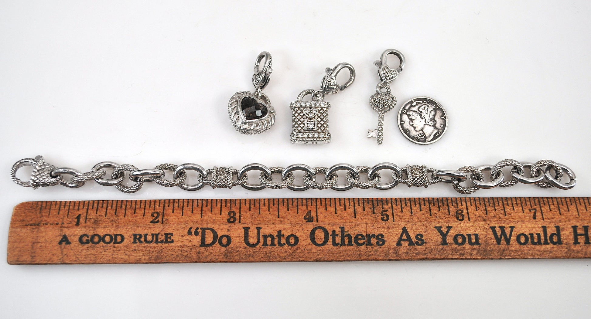 Upon close inspection this bracelet shows wear in the form of nicks and scratches. It still looks great with regular wearing and it can be professionally polished by a jeweler. Designer sterling silver oval 9.5mm rolo link "key to my heart" charm bracelet is hallmarked inside the lobster clasp and features alternating textured and polished links and three removable clip on Judith Ripka charms.