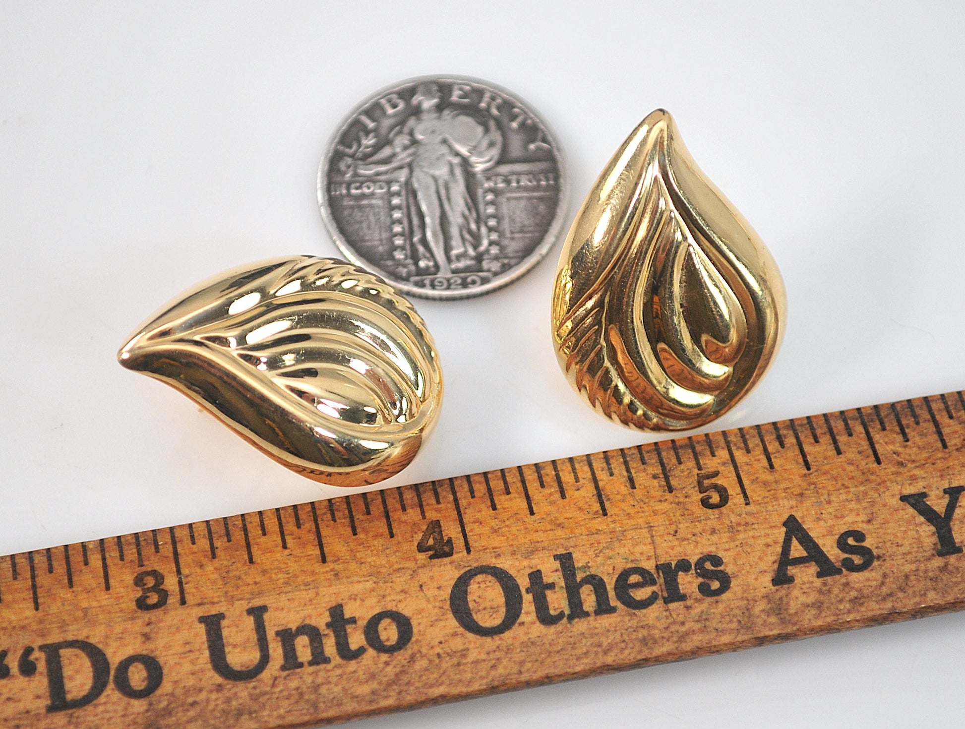 Large and hollow yellow gold earrings are marked 14K and feature Omega backs. Other than very fine scratches which could be polished out by any jeweler, they are in great condition.