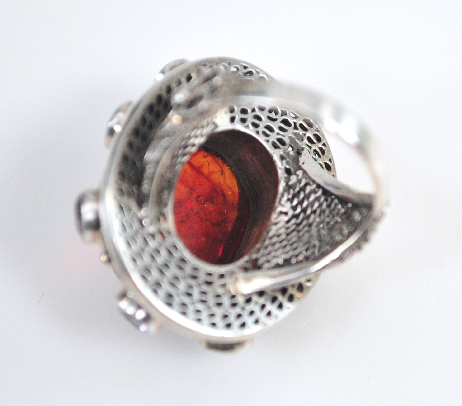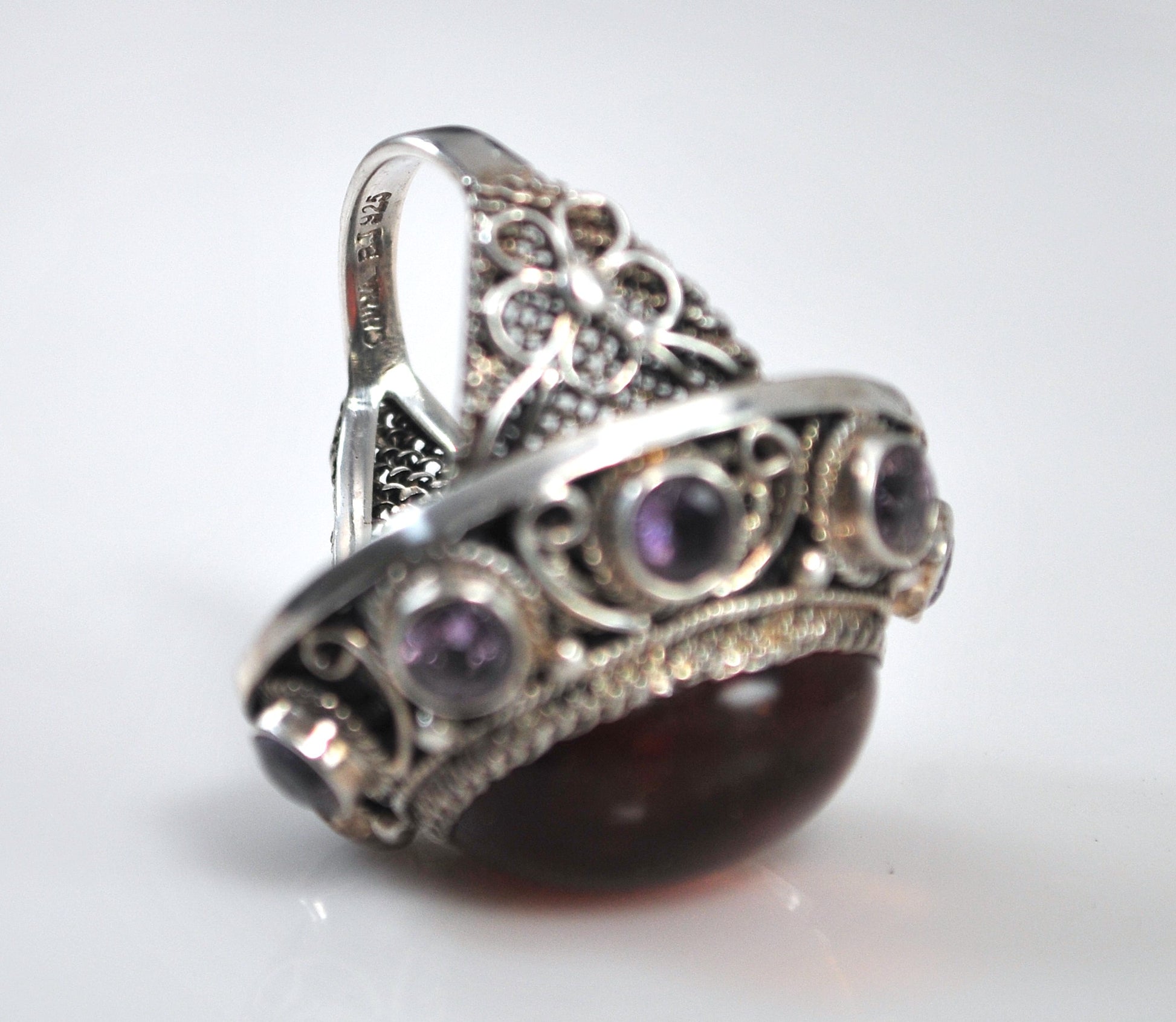 Chunky and ornate sterling silver ring is signed BJ 925 China and features an approximately 5/8 inch by 1/2 inch wide Amber with approximately 4.5mm round faceted Amethyst in an exotic openwork floral setting.