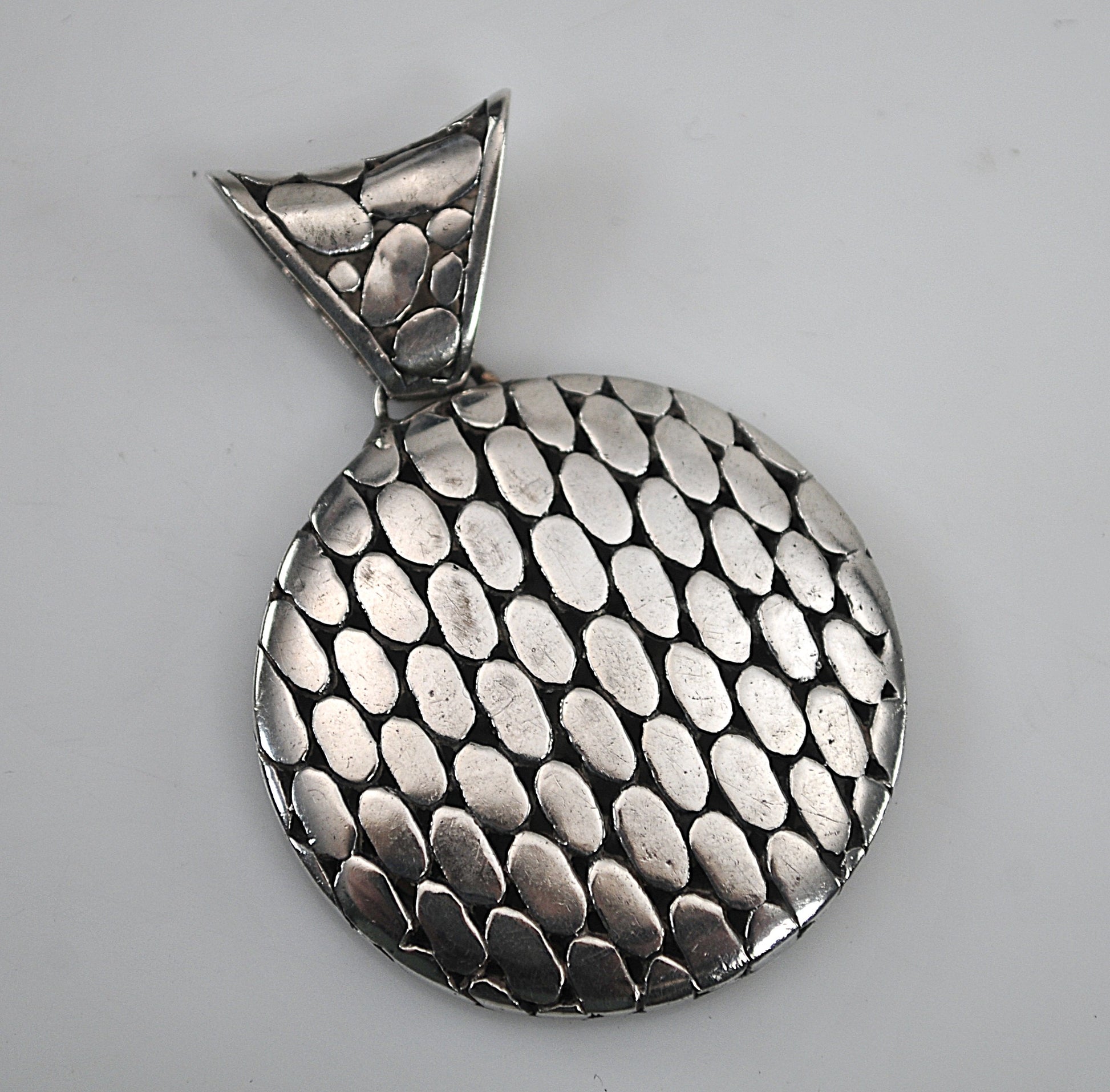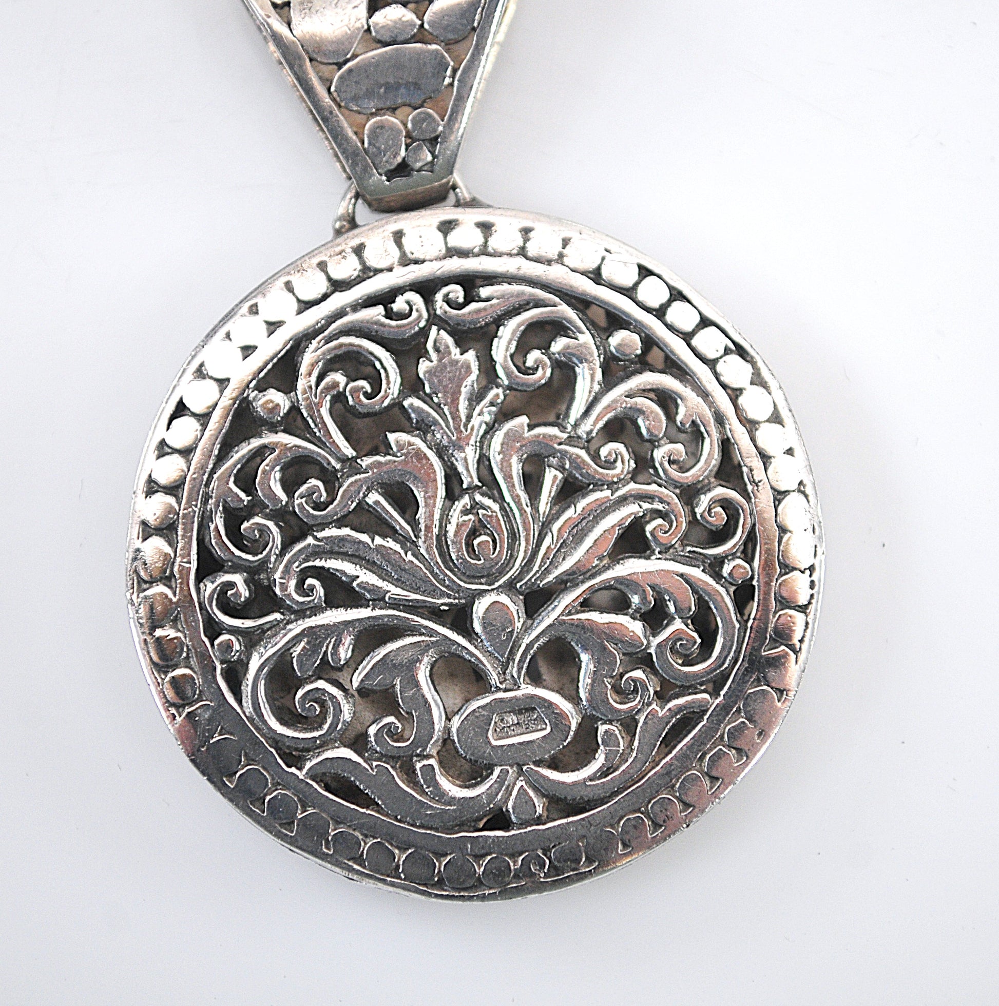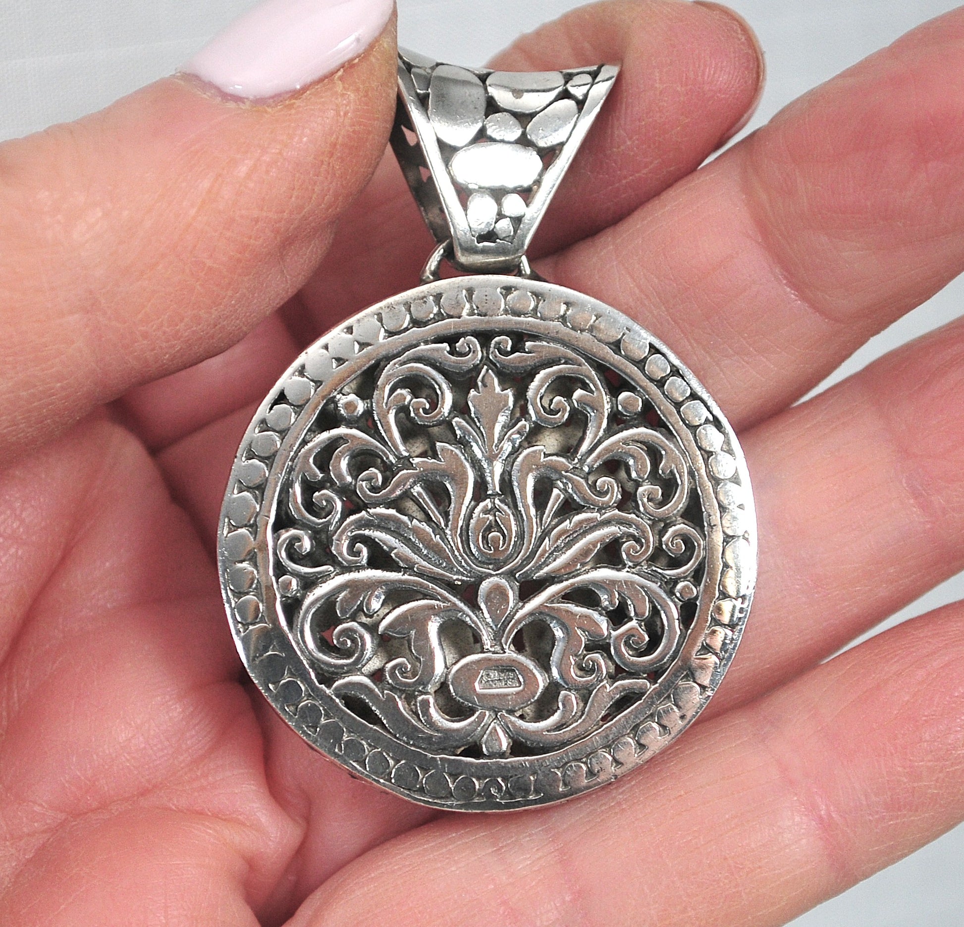 Reversible sterling silver Bali statement pendant is signed 925 Indonesia and a maker's mark I cannot read. It features an openwork scrolled floral design on one side and a pebbled design on the other side, and a large pebbled bail.