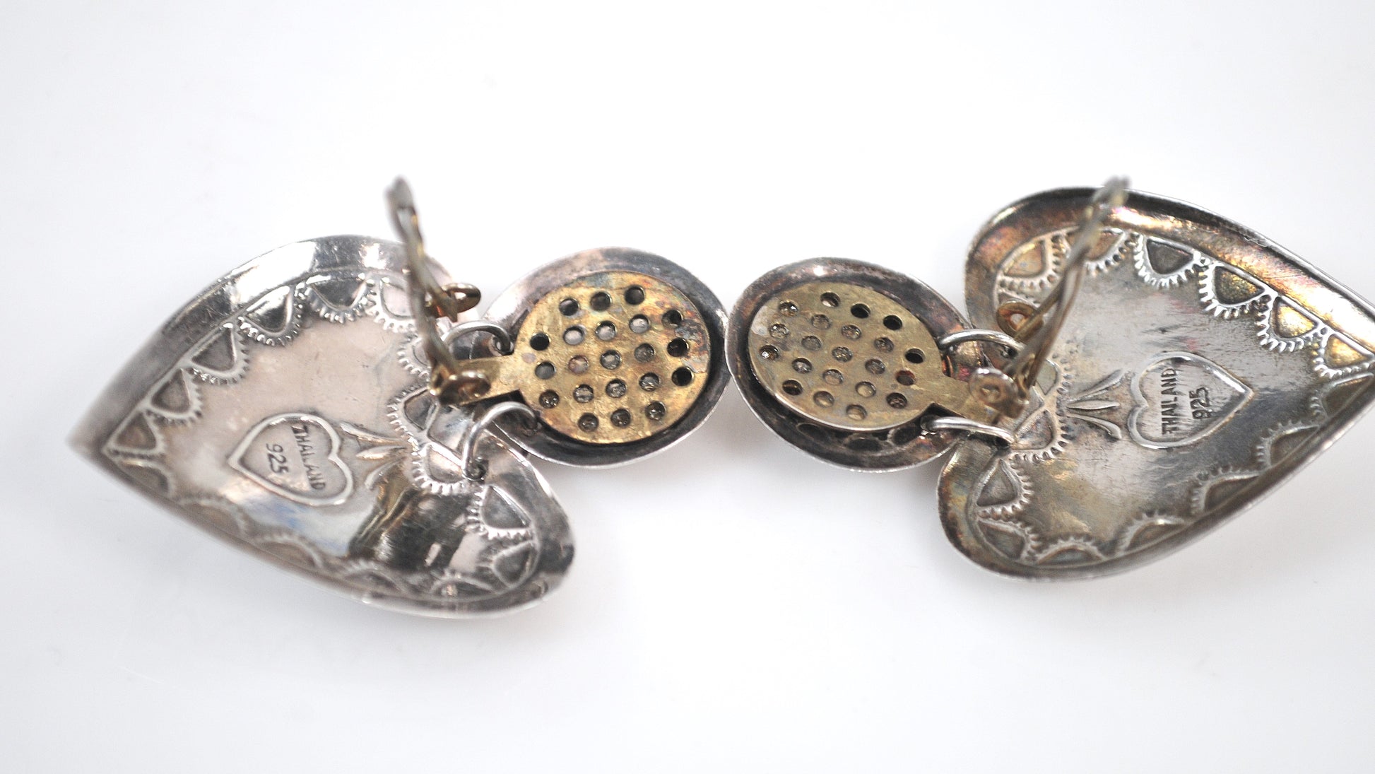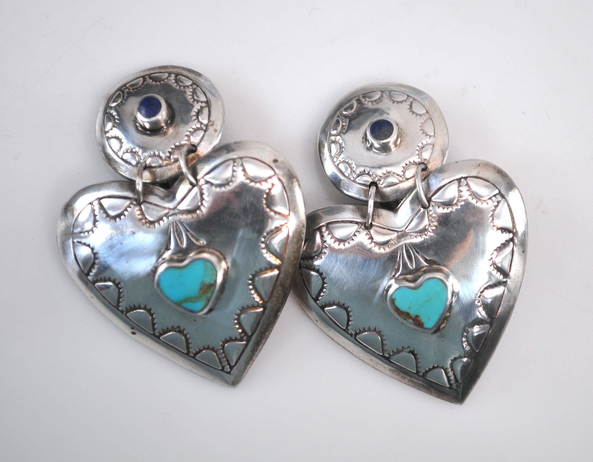 Vintage sterling silver heart clip on earrings are marked 925 Thailand and feature Southwestern stamp work with small Turquoise hearts and small round Lapis at the post.
