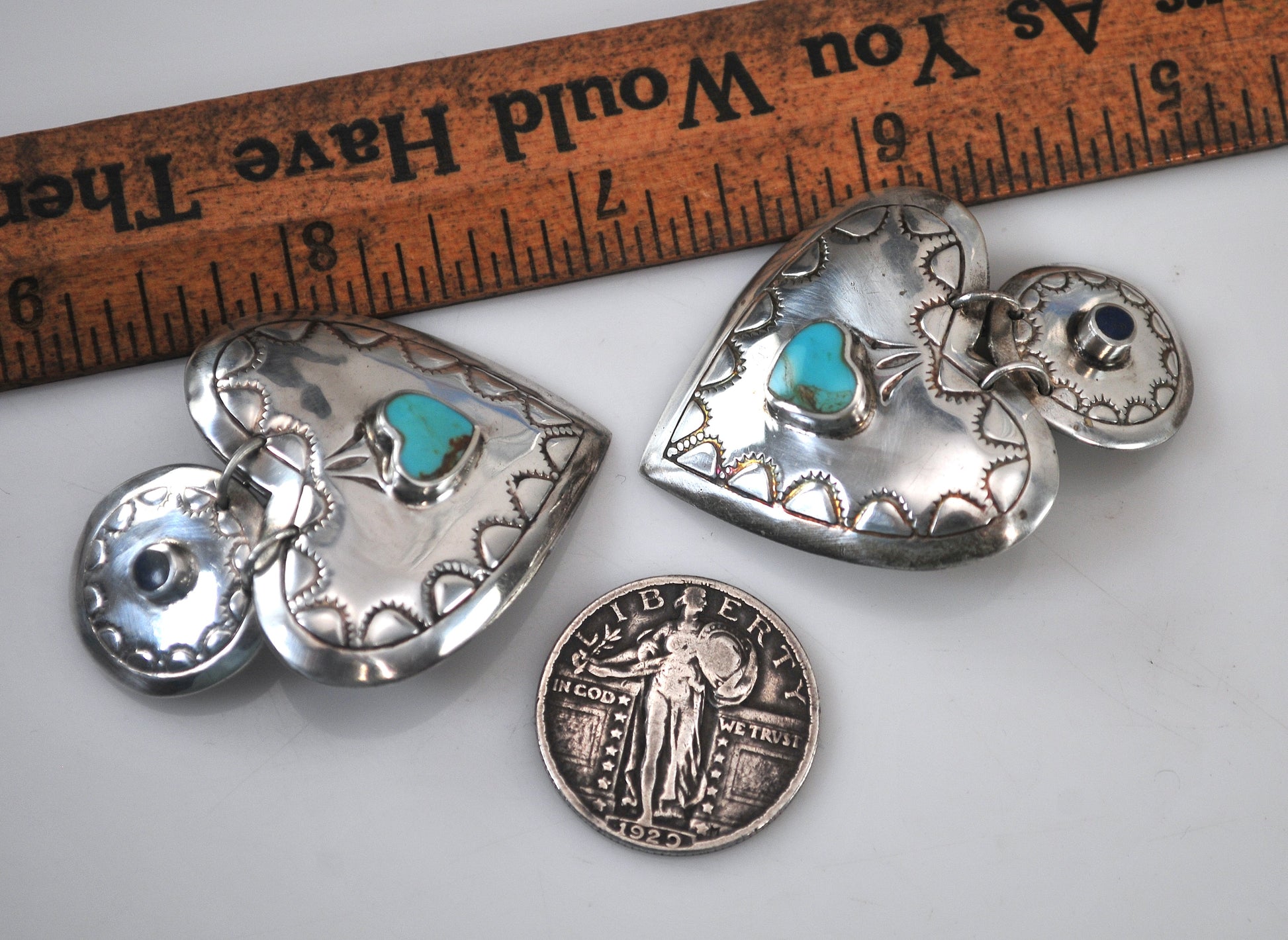 Large Sterling Silver Turquoise Lapis Clip On Heart Earrings