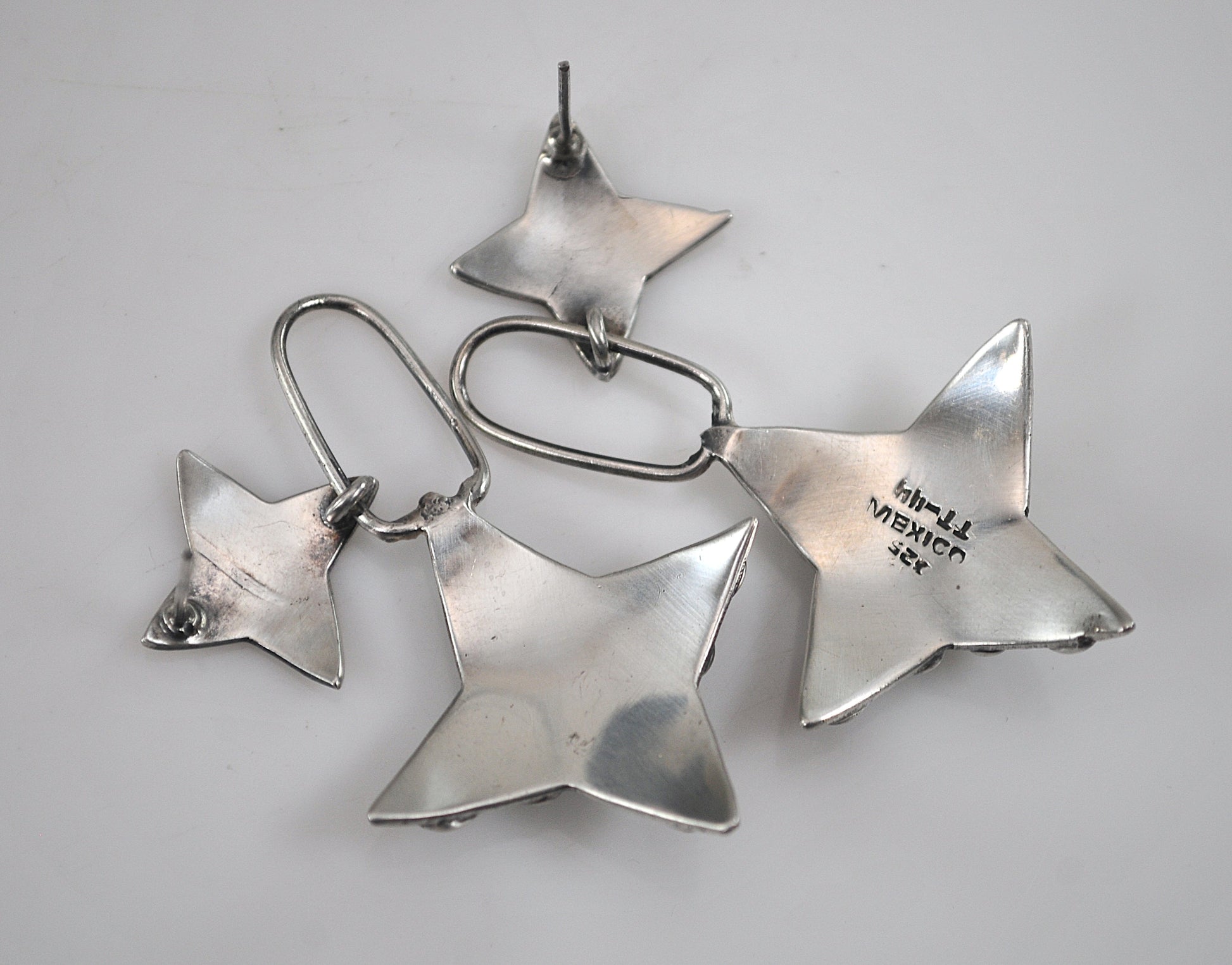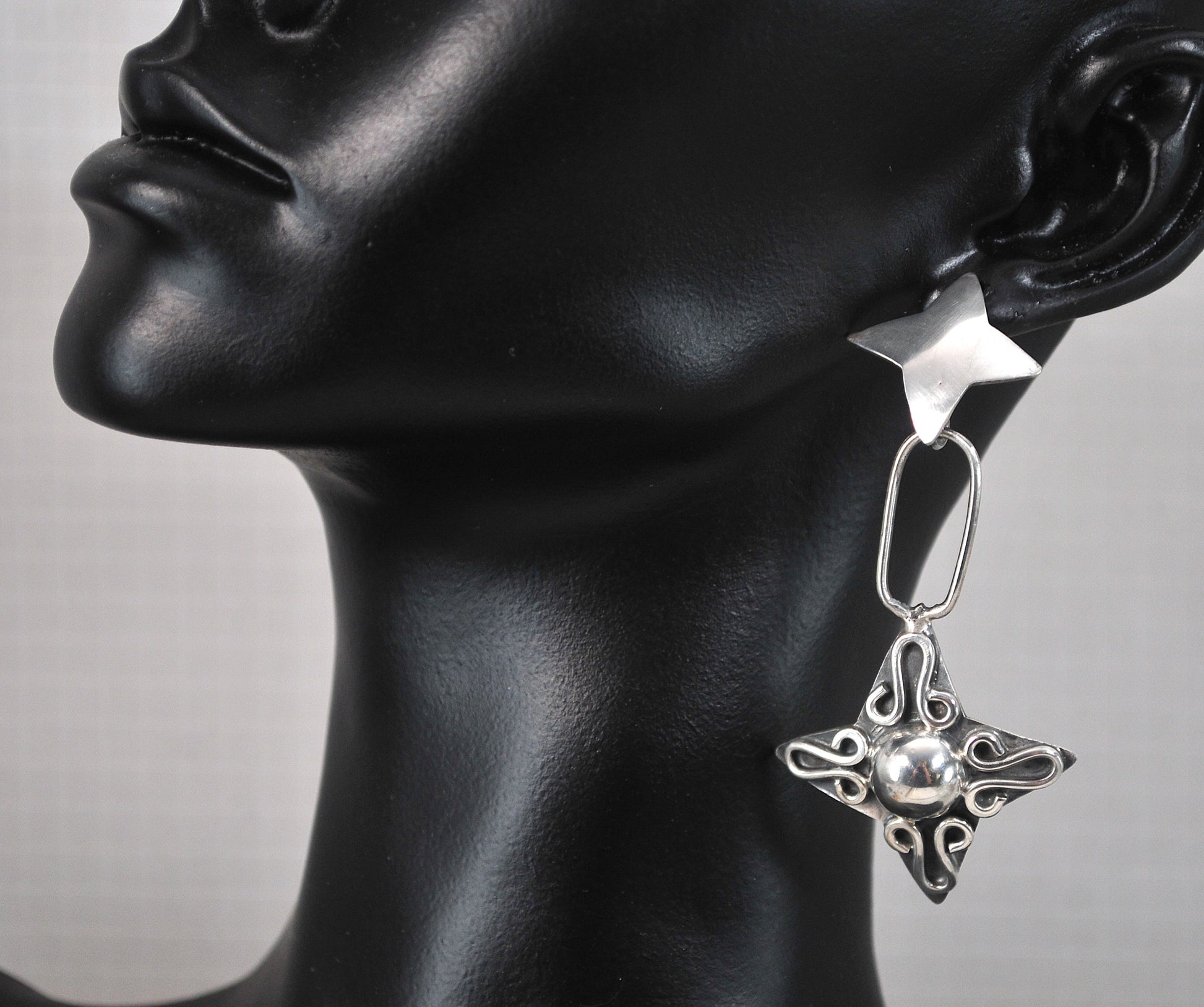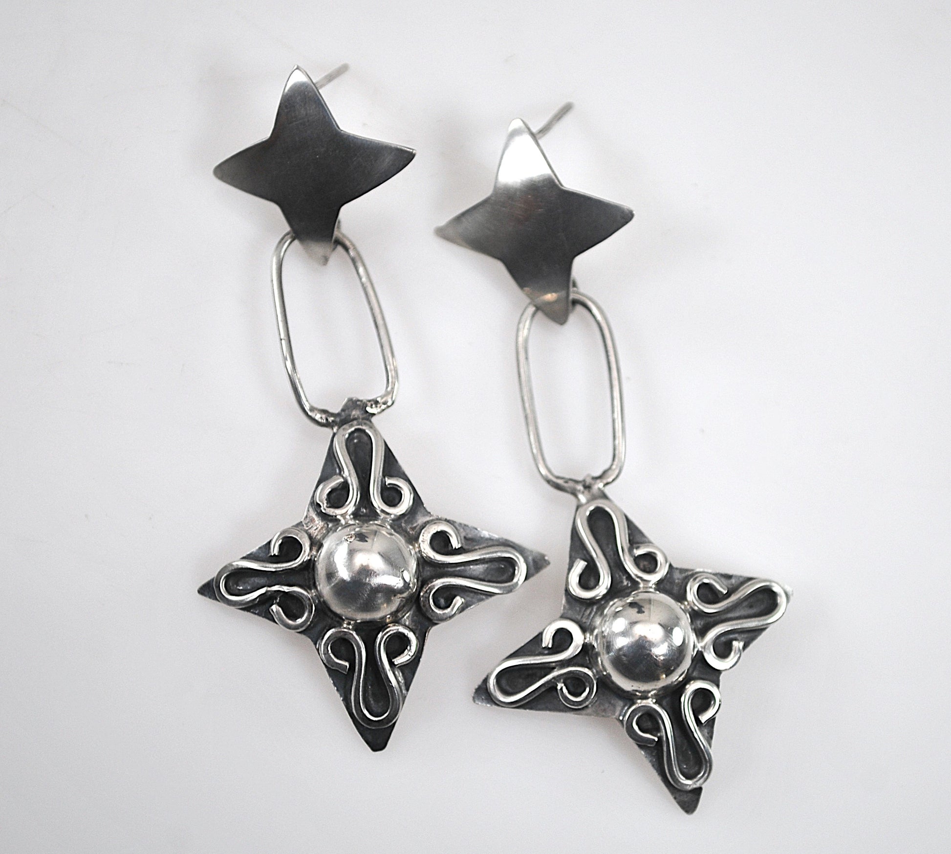 Long sterling silver handmade statement star style earrings are signed TT-44 Mexico 925.
