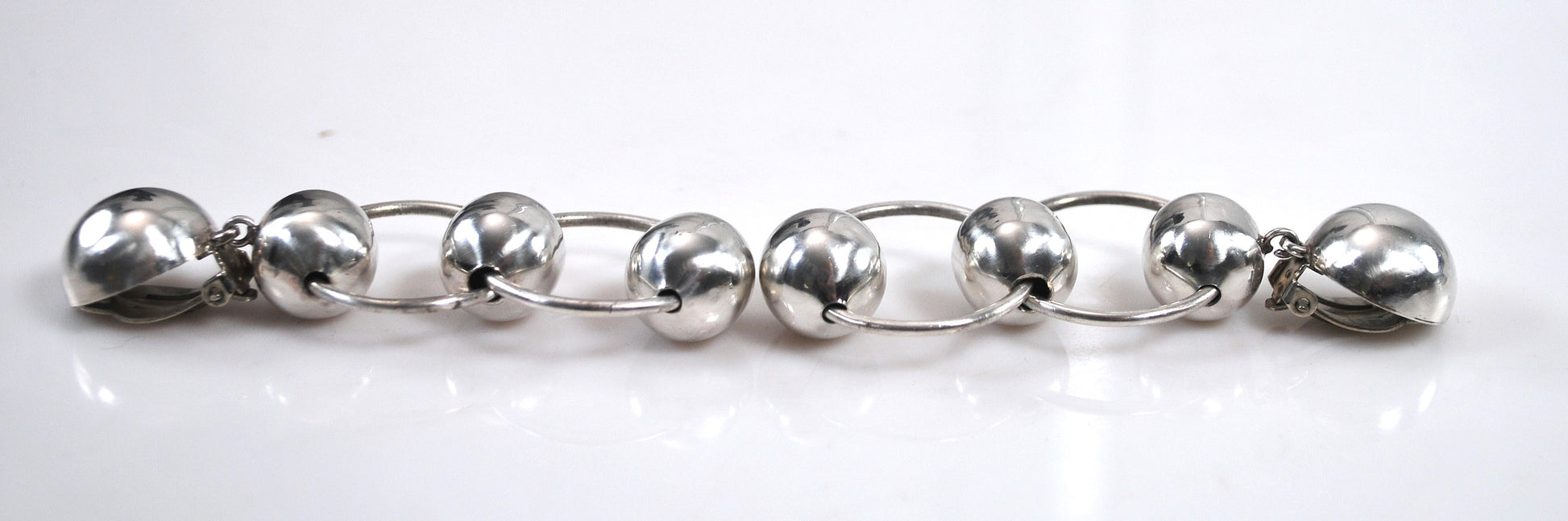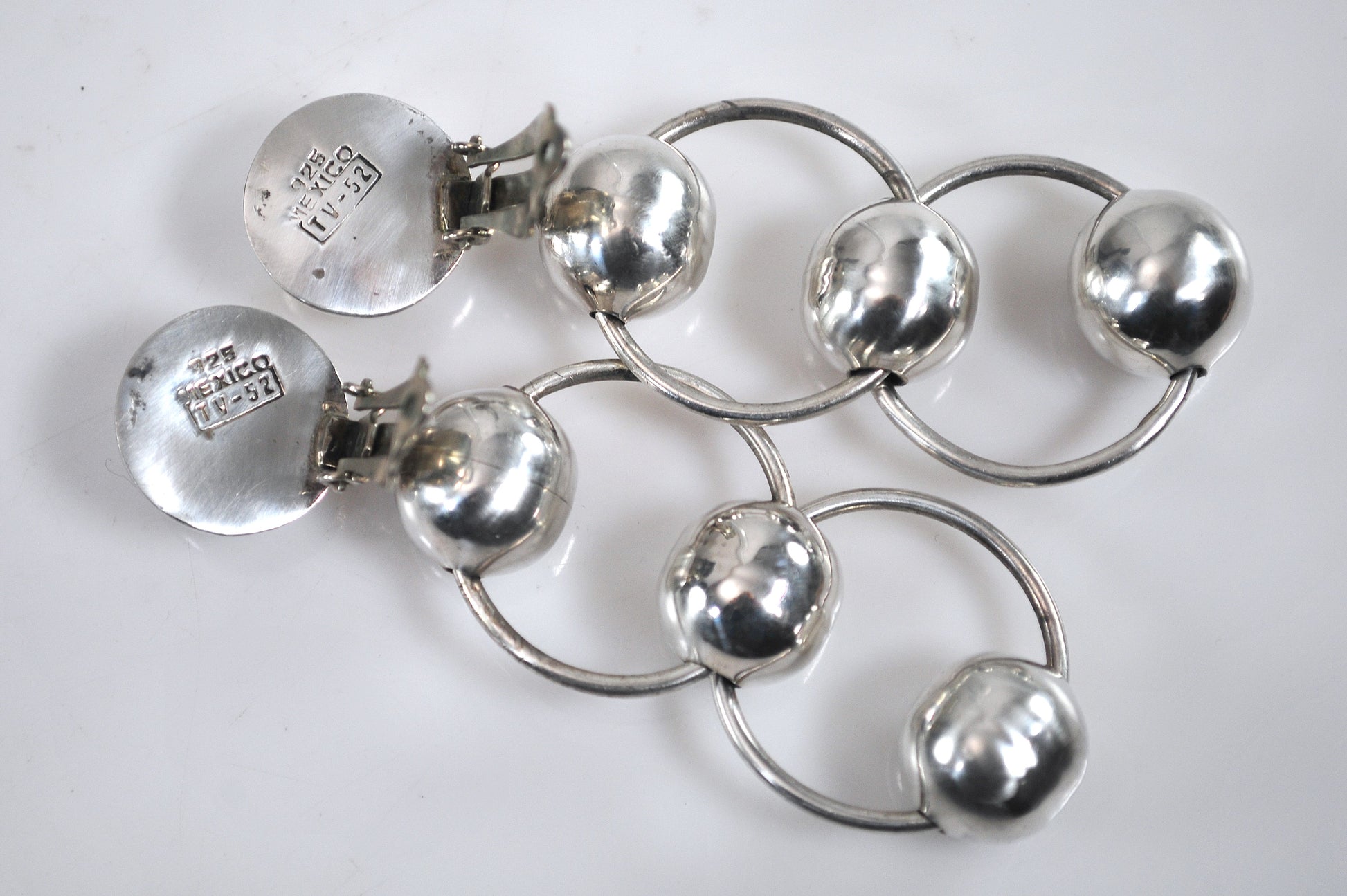 Handmade chunky sterling silver earrings are signed 925 Mexico TV-52 and feature two large rings linked by three large balls.
