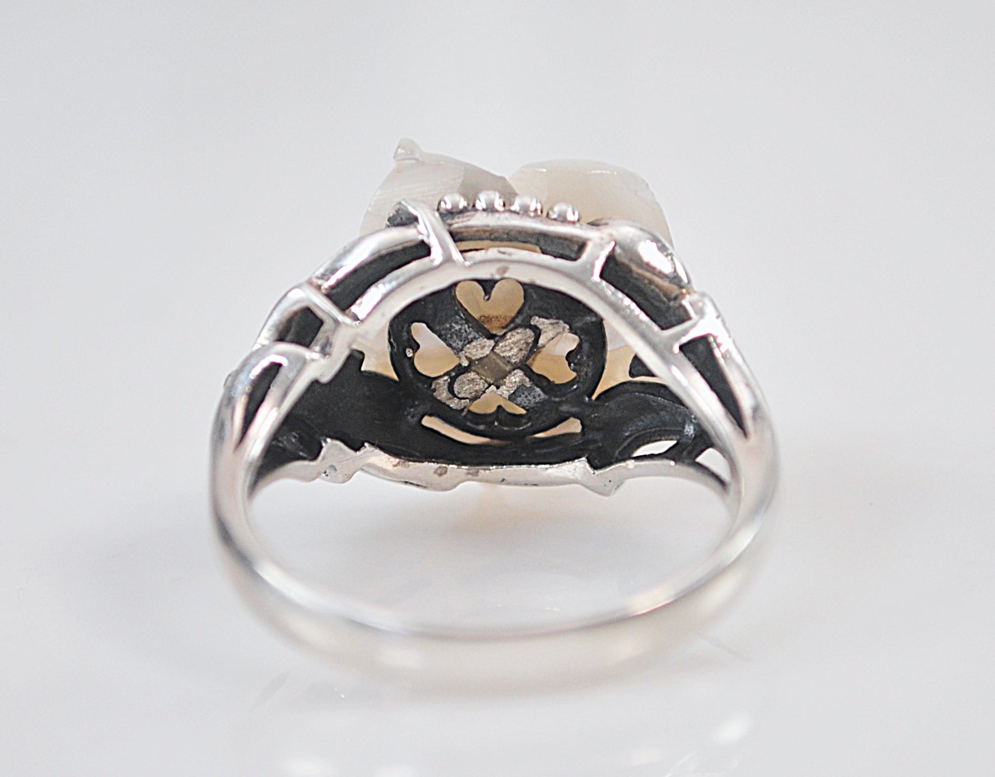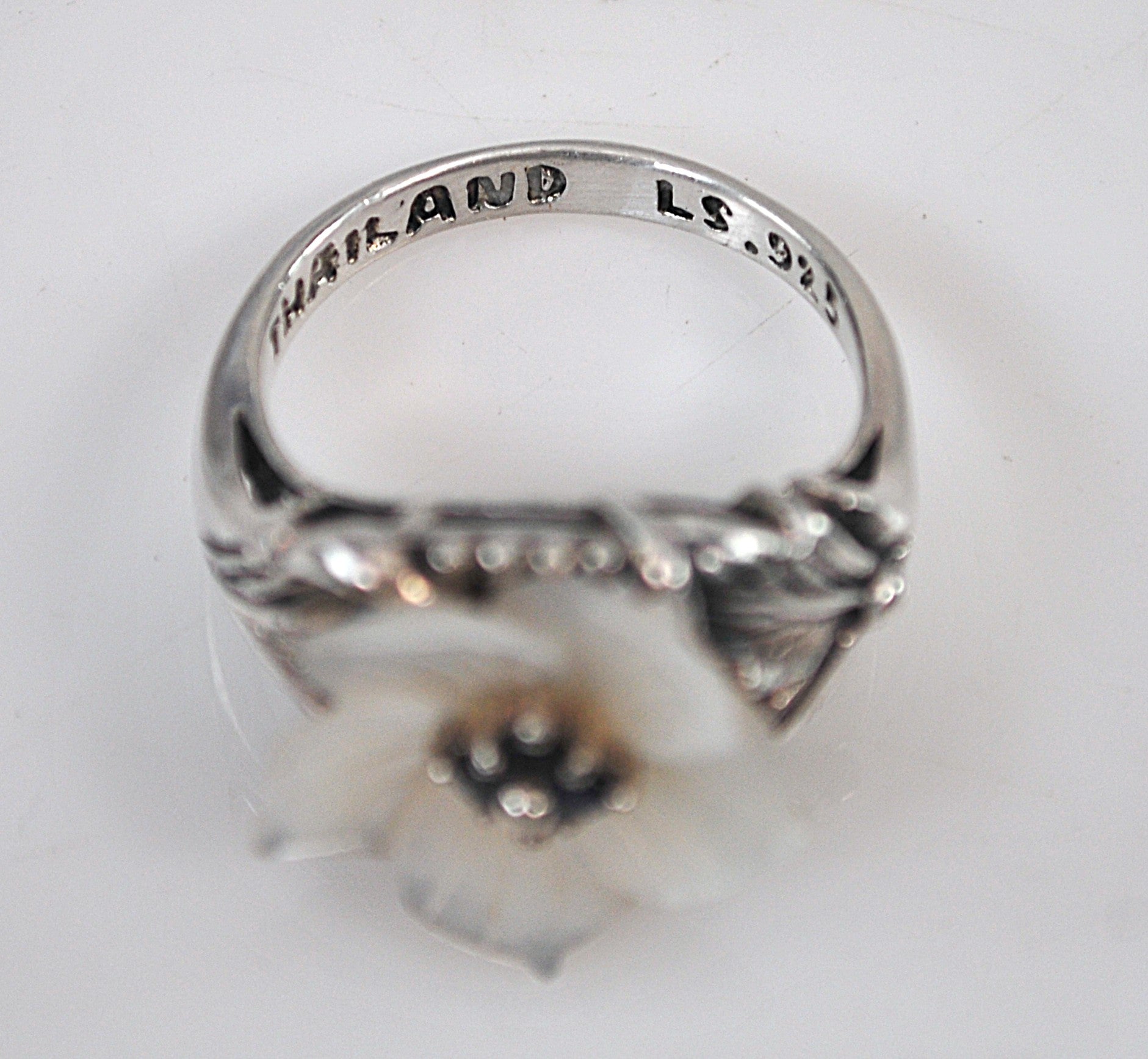 Sterling silver statement ring is signed LS Thailand 925 and features a carved Mother of Pearl flower with four small genuine Sapphires in the center set on an offset leaf design.