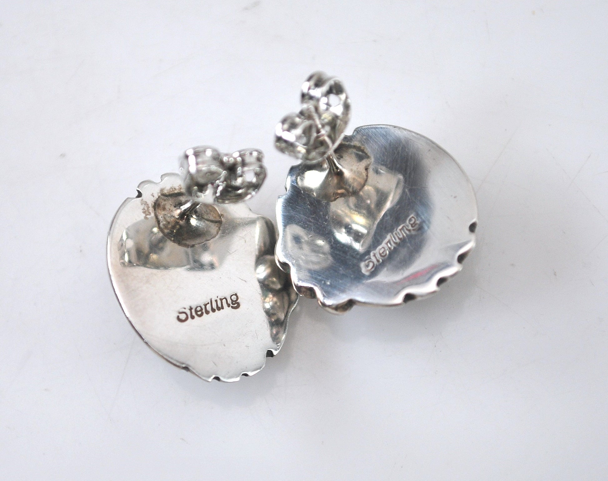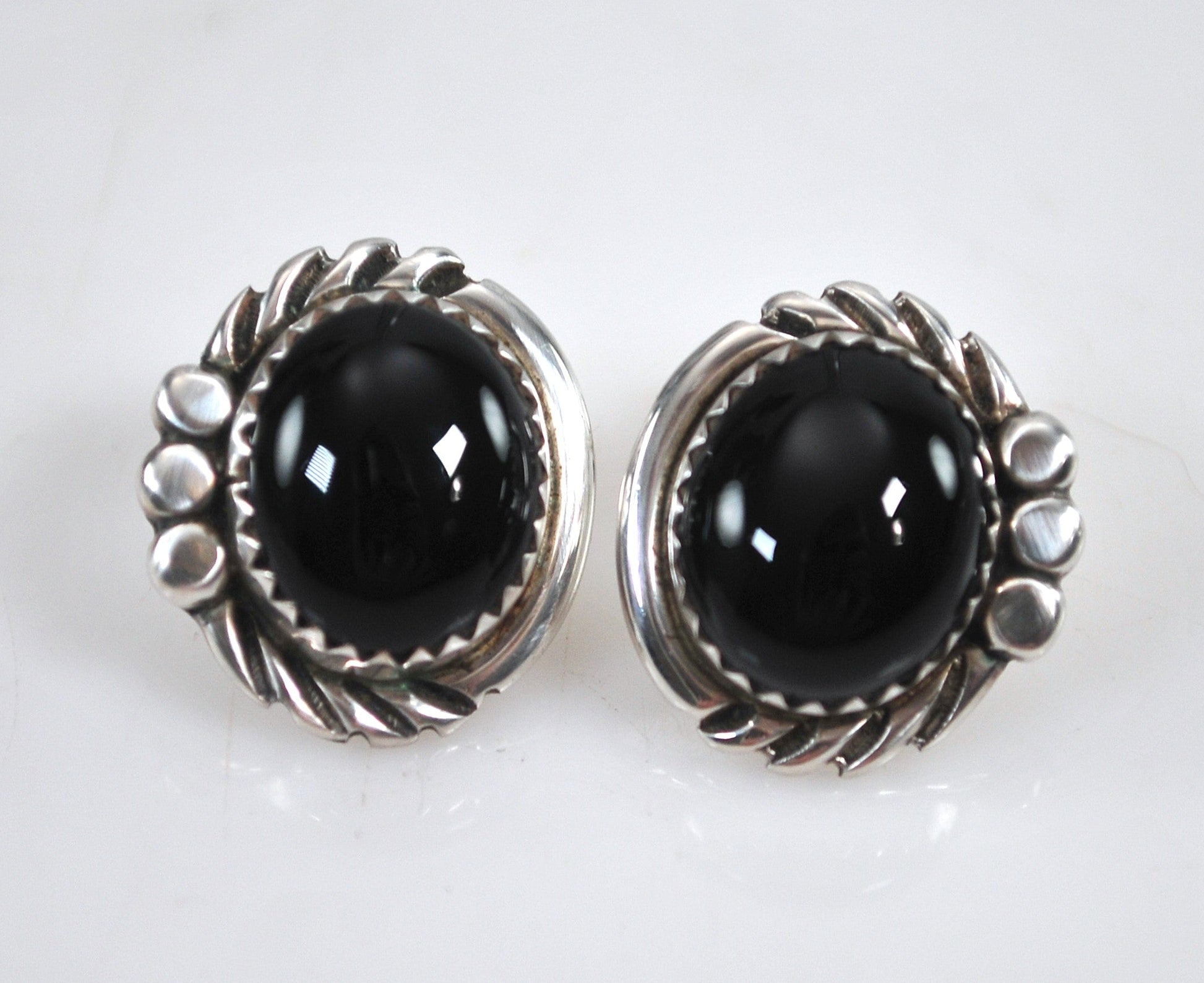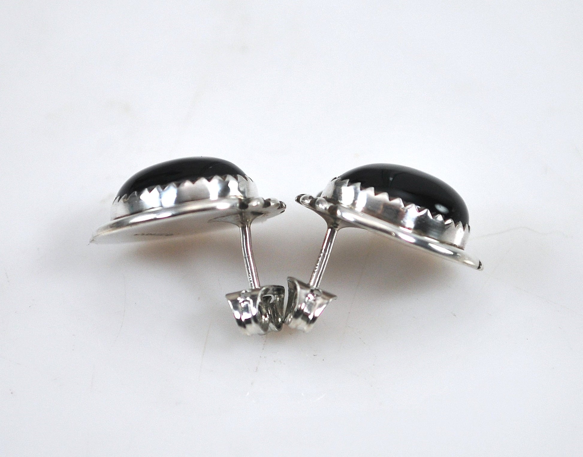 Sterling silver Native American handmade stud earrings are marked Sterling and feature Black Onyx cabochons in Southwestern designs.