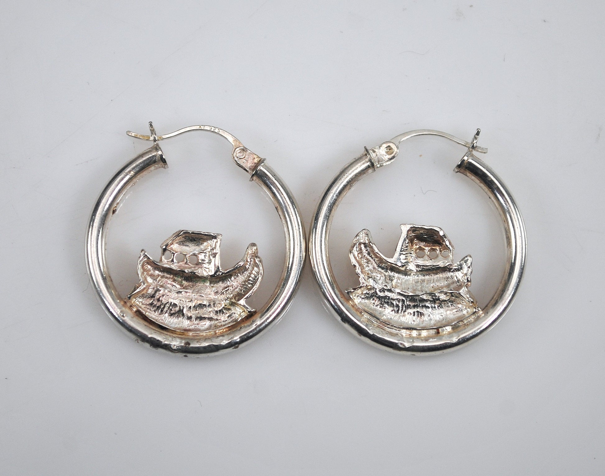 Sterling silver hoop earrings are signed AT 925 and feature Noah's Ark on the water.