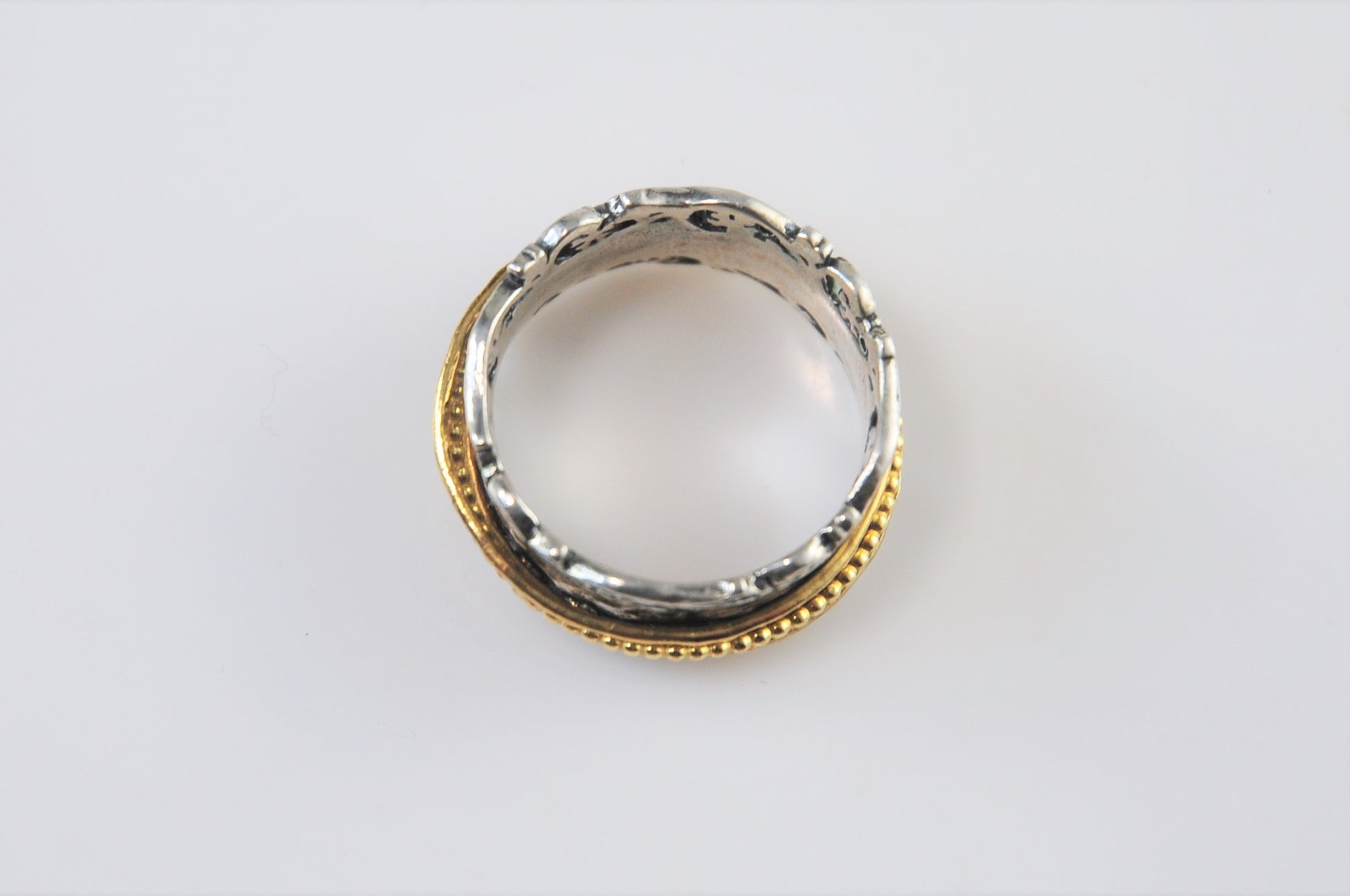 Wide two tone band ring is signed PZ 925 Israel and features open work floral filagree edges and two hammered and one beaded gold washed spinner rings.