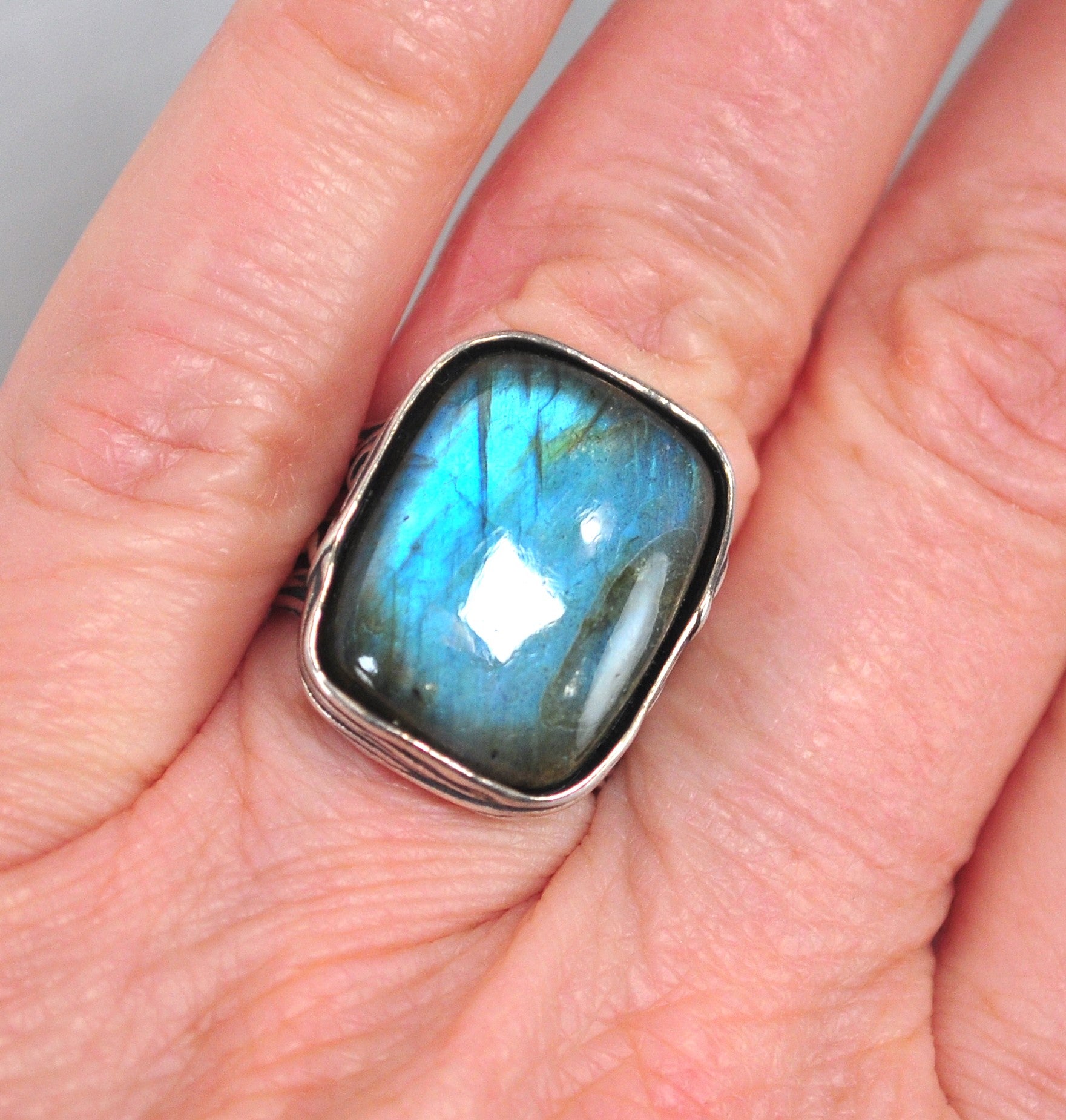 Handmade sterling silver designer ring is hallmarked and features large iridescent blue Labradorite.