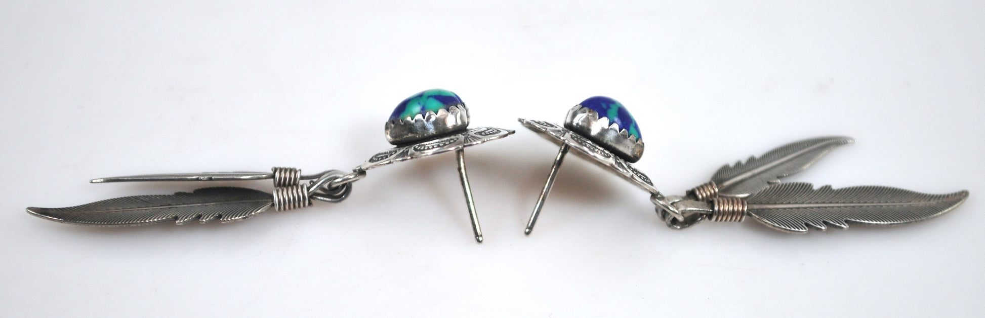 Sterling silver Southwestern handmade Azurite heart feather earrings are signed Q.T. 925. They come with silicone backs.